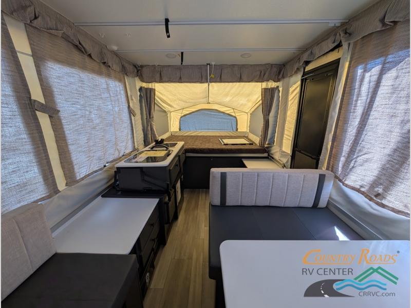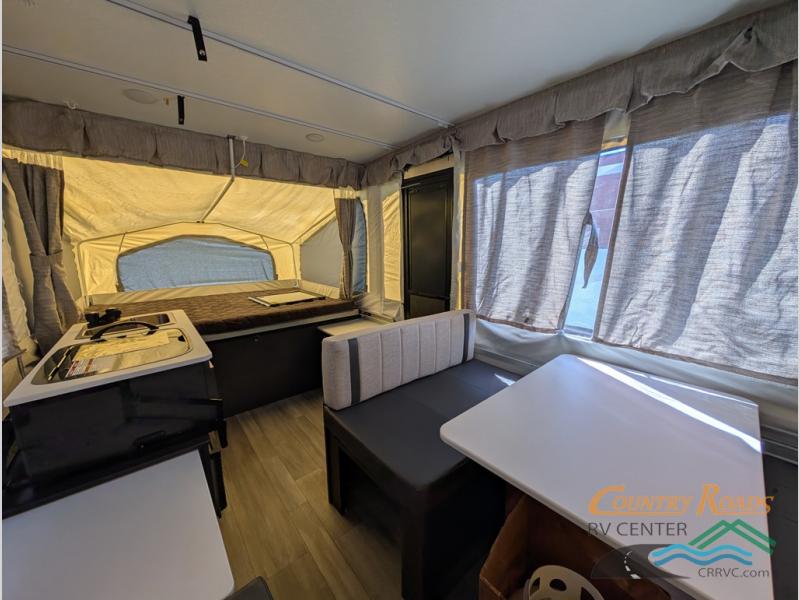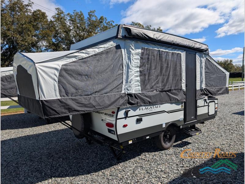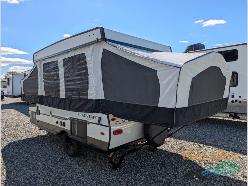 You'll be pleasantly surprised by the amount of comfort in these Flagstaff MAC Series folding pop-up campers by Forest River. Each one is built with a fiberglass laminated roof for added durability and a power roof lift for easy set up. There is also a clay exterior with an alloy band, solar panel prep on the frame, and four stabilizer jacks with sand pads to keep your camper secure. The interior features wood plank flooring, USB charging ports, and stylish Andover Sable wood.