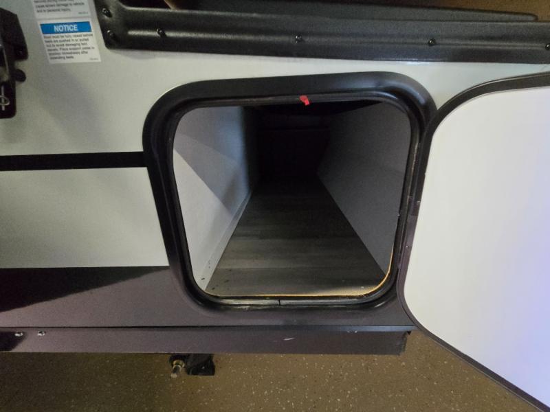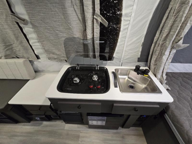 Enjoy time at the campground in this camper that can sleep five to six each night. There is a front 60" x 80" tent end bed, and a 48" x 80" rear tent end bed, plus a booth dinette with additional seating and a 15K under bunk A/C. The two burner range will let you make meals each day, and the 12V refrigerator with a 125W roof solar panel will keep your food fresh. This unit also includes storage with a lid for your belongings.