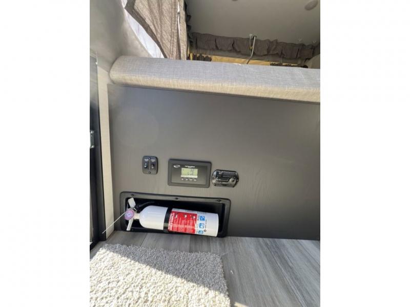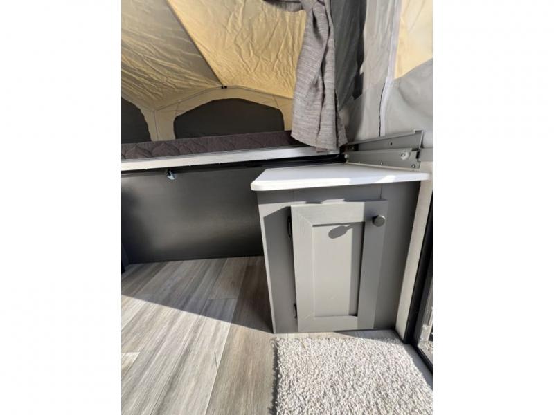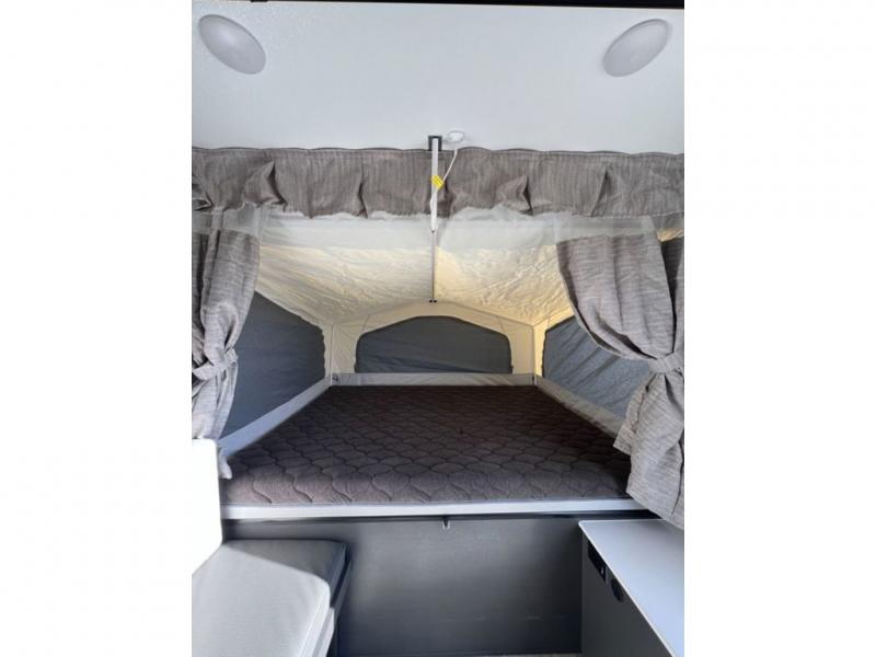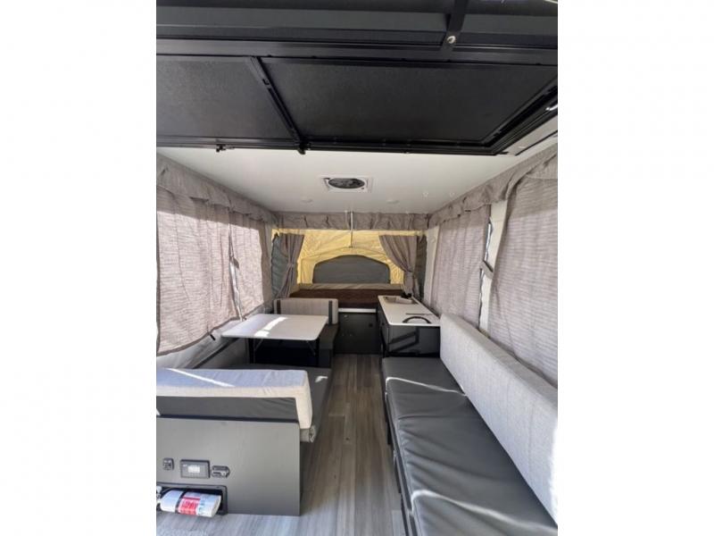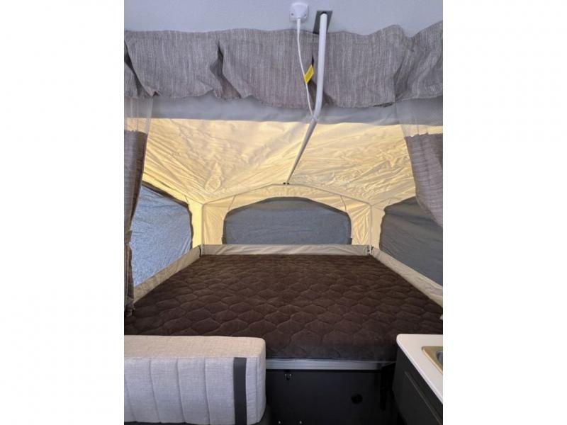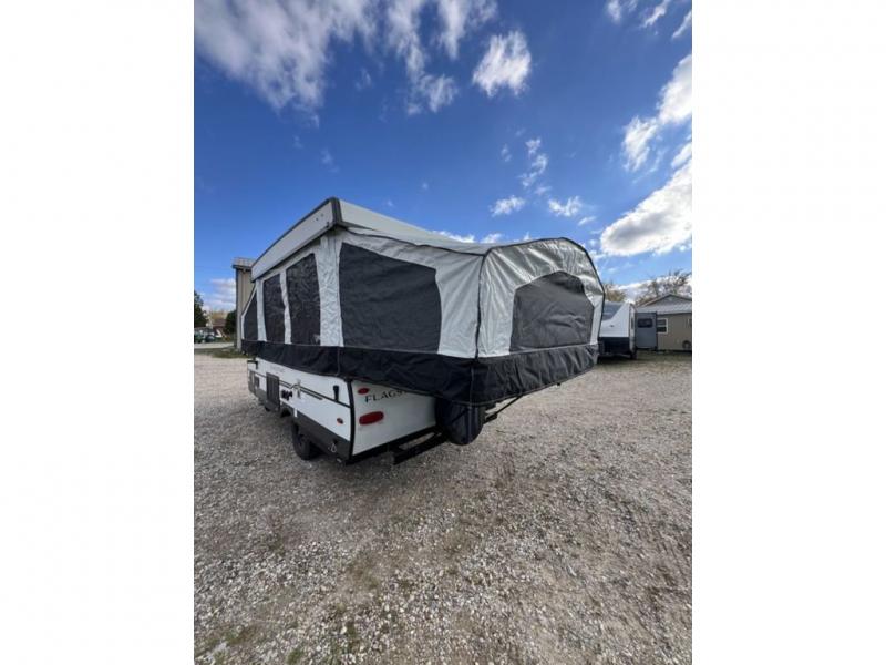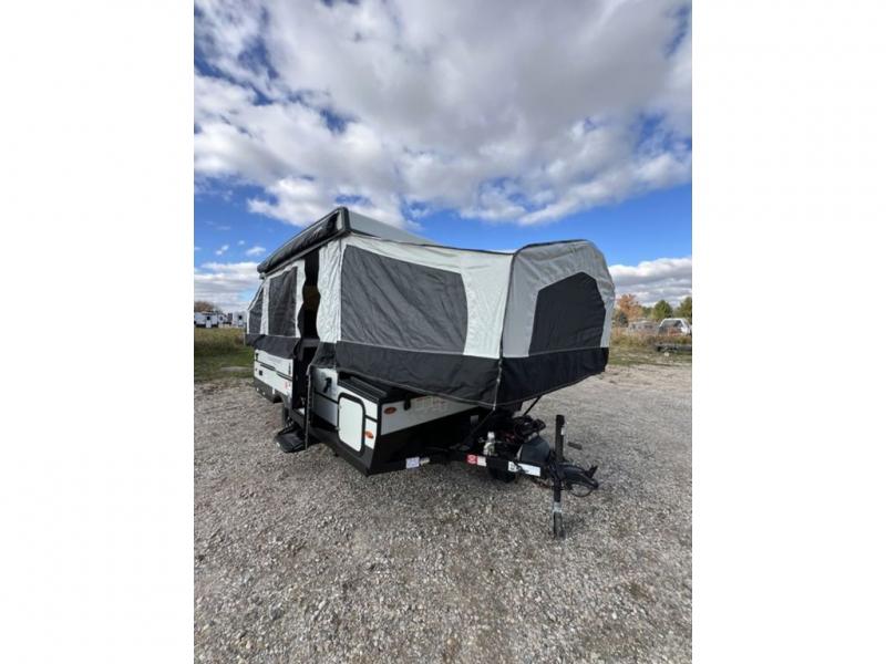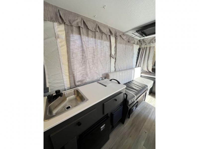 This Flagstaff MAC Series folding pop-up camper is going to entice you to take many more vacations! There are interior cabinets for storing your essentials, and you can even bring more equipment by using the storage with a lid for convenience. The other convenient feature on this camper is the exterior griddle to make breakfast outdoors. Back on the inside, you can use the booth dinette as a comfortable place to play a game or eat a meal, and there are even USB charging ports within this camper so that you can charge your phones.