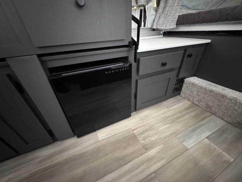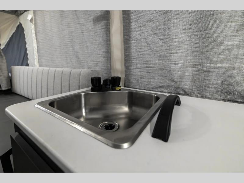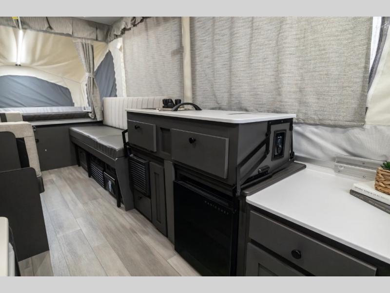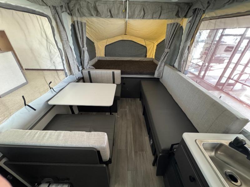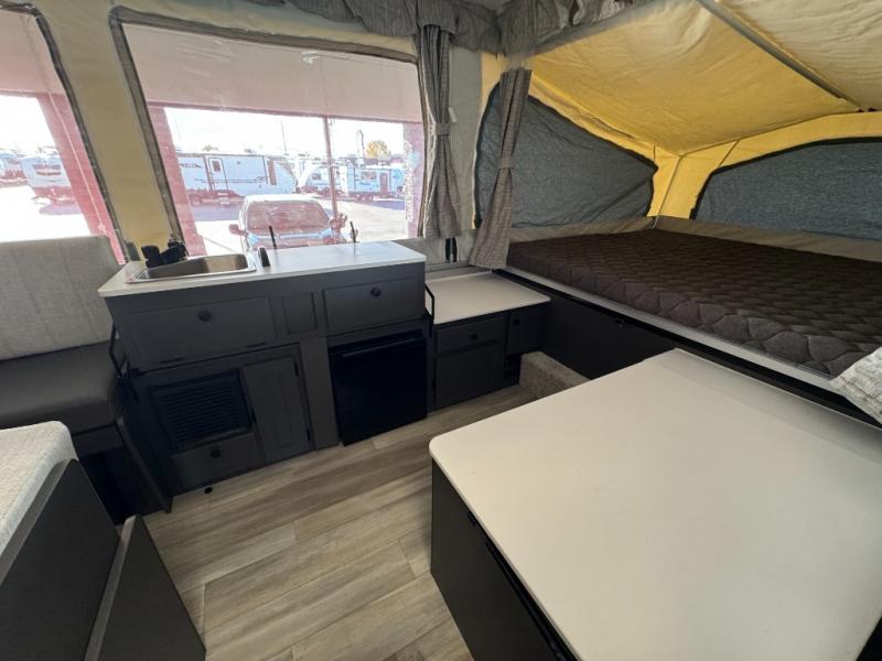 Enjoy time at the campground in this camper that can sleep five to six each night. There is a front 70" x 80" tent end bed, a 60" x 80" rear tent end bed, plus a booth dinette and a gaucho bed for plenty of seating. The exterior griddle will let you make meals each day, and the 12V refrigerator with a 125W roof solar panel will keep your food fresh. This unit also includes a wet bath cabinet that will also serve as counter space when you need it!