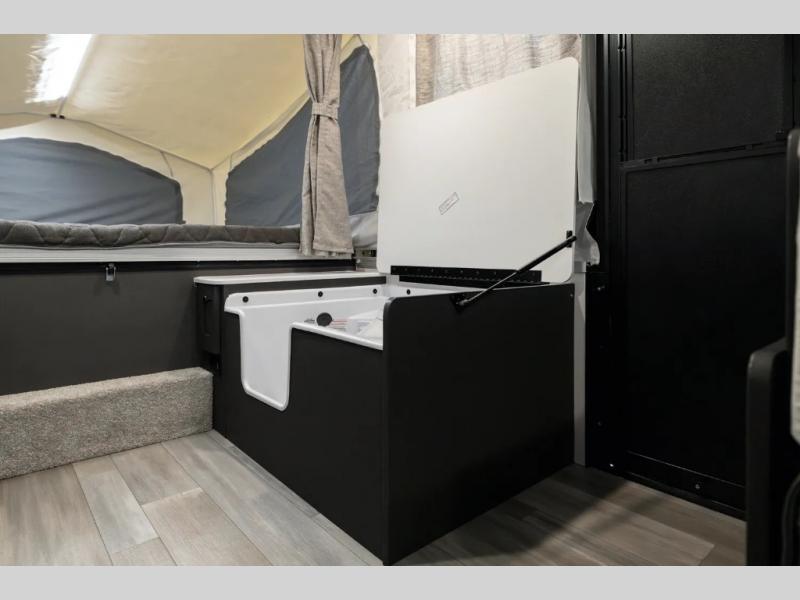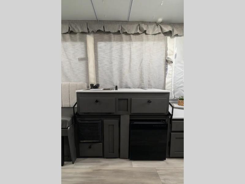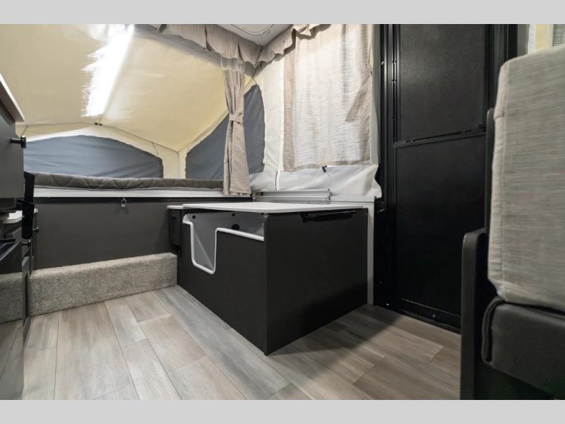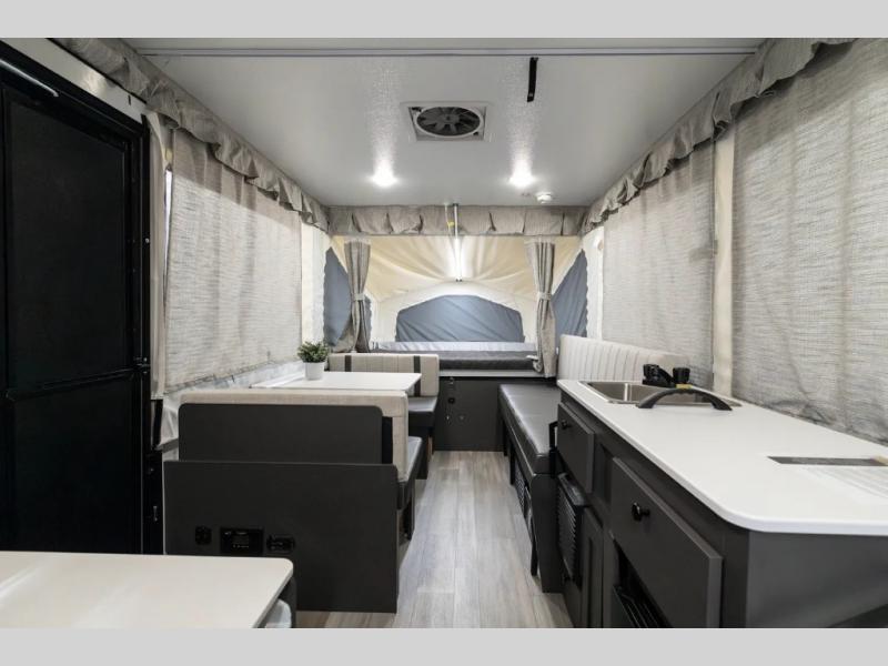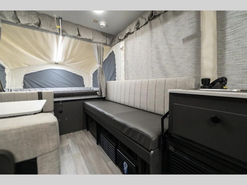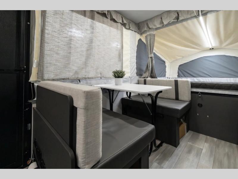 You'll be pleasantly surprised by the amount of comfort in these Flagstaff MAC Series folding pop-up campers by Forest River. Each one is built with a fiberglass laminated roof for added durability and a power roof lift for easy set up. There is also a clay exterior with an alloy band, solar panel prep on the frame, and four stabilizer jacks with sand pads to keep your camper secure. The interior features wood plank flooring, USB charging ports, and stylish Andover Sable wood.
