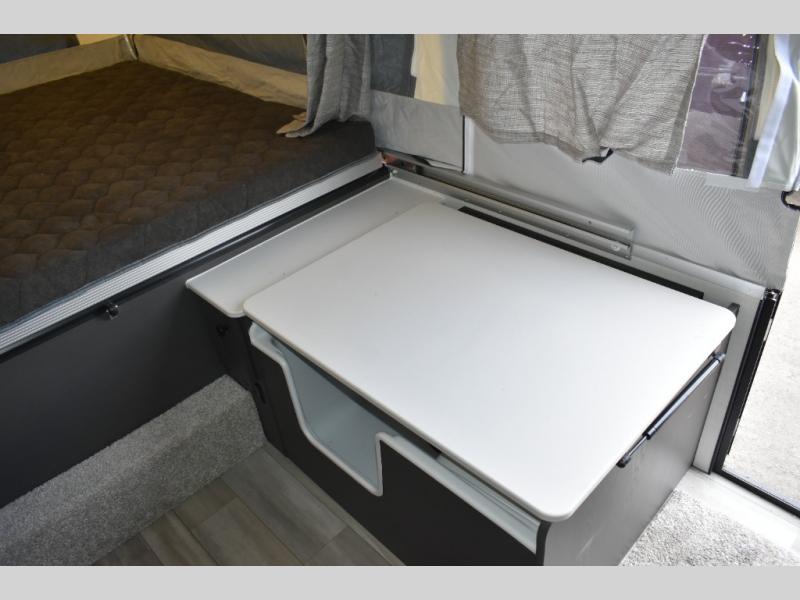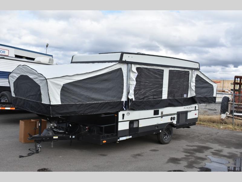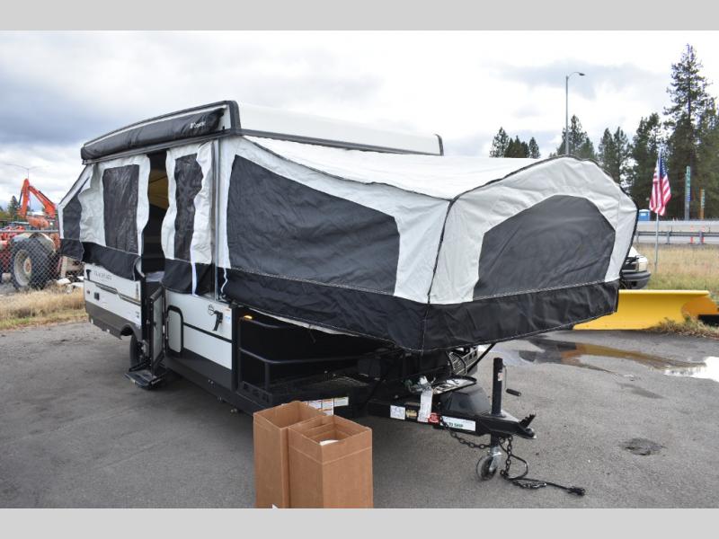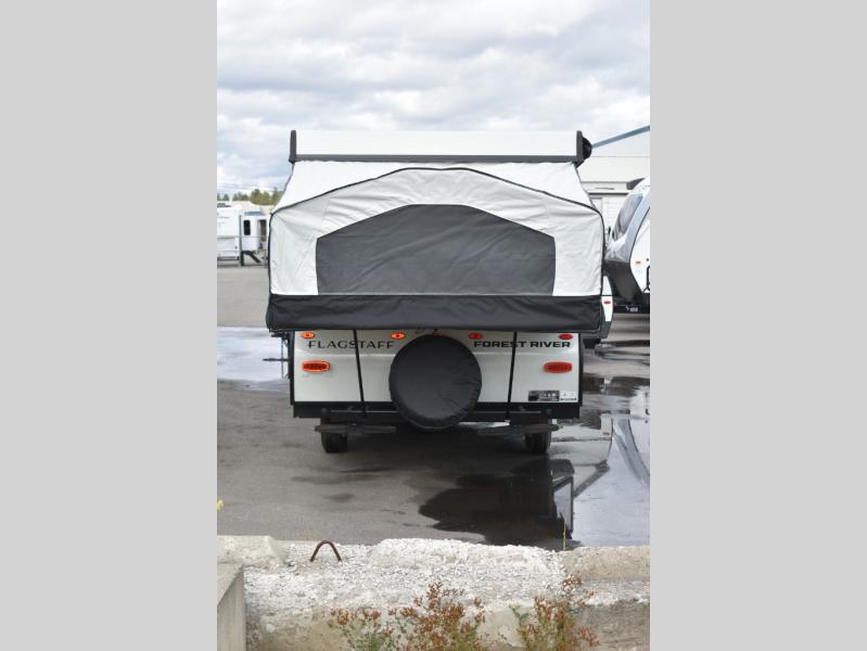 You'll be pleasantly surprised by the amount of comfort in these Flagstaff MAC Series folding pop-up campers by Forest River. Each one is built with a fiberglass laminated roof for added durability and a power roof lift for easy set up. There is also a clay exterior with an alloy band, solar panel prep on the frame, and four stabilizer jacks with sand pads to keep your camper secure. The interior features wood plank flooring, USB charging ports, and stylish Andover Sable wood.