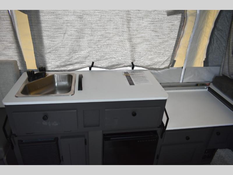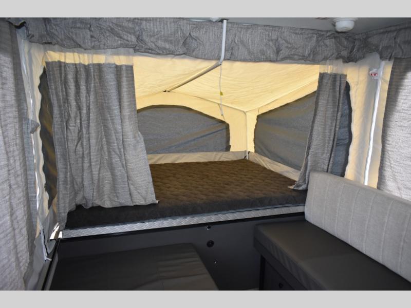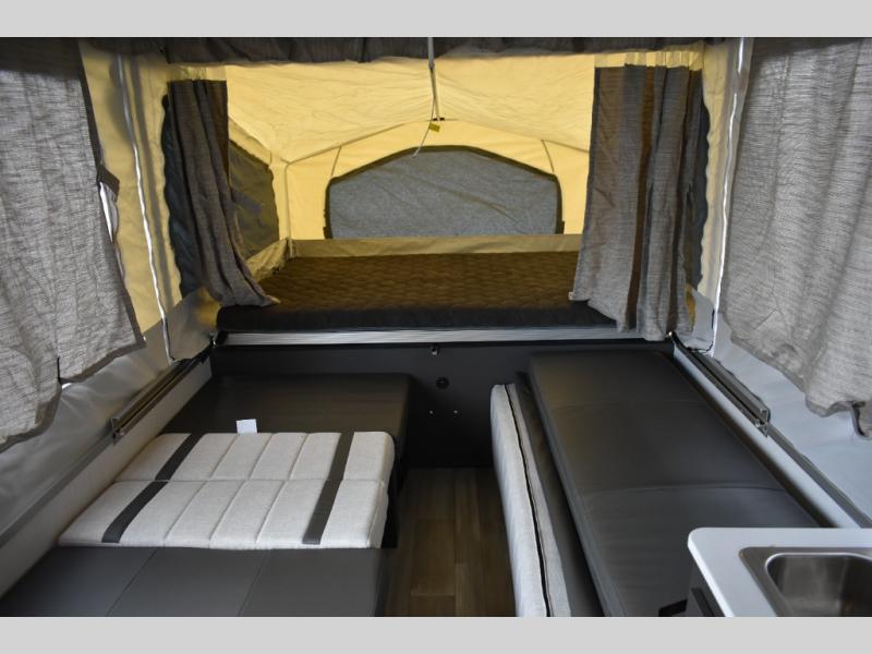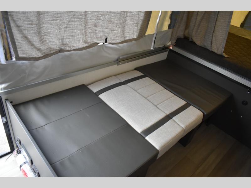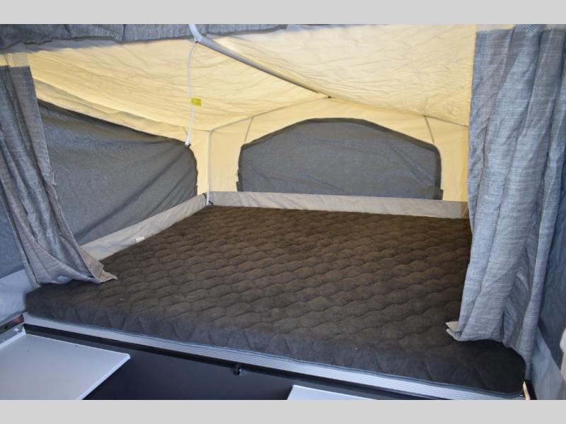 Enjoy time at the campground in this camper that can sleep five to six each night. There is a front 70" x 80" tent end bed, a 60" x 80" rear tent end bed, plus a booth dinette and a gaucho bed for plenty of seating. The exterior griddle will let you make meals each day, and the 12V refrigerator with a 125W roof solar panel will keep your food fresh. This unit also includes a wet bath cabinet that will also serve as counter space when you need it!