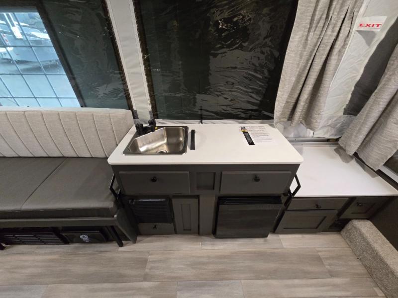 Enjoy time at the campground in this camper that can sleep five to six each night. There is a front 70" x 80" tent end bed, a 60" x 80" rear tent end bed, plus a booth dinette and a gaucho bed for plenty of seating. The exterior griddle will let you make meals each day, and the 12V refrigerator with a 125W roof solar panel will keep your food fresh. This unit also includes a wet bath cabinet that will also serve as counter space when you need it!
