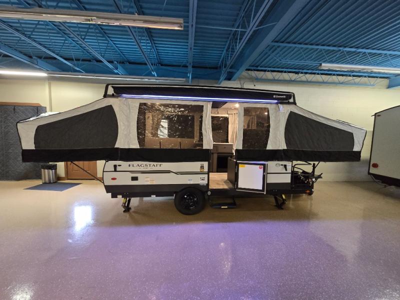 You'll be pleasantly surprised by the amount of comfort in these Flagstaff MAC Series folding pop-up campers by Forest River. Each one is built with a fiberglass laminated roof for added durability and a power roof lift for easy set up. There is also a clay exterior with an alloy band, solar panel prep on the frame, and four stabilizer jacks with sand pads to keep your camper secure. The interior features wood plank flooring, USB charging ports, and stylish Andover Sable wood.