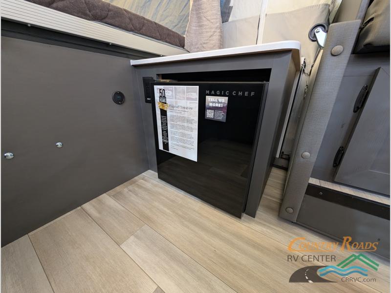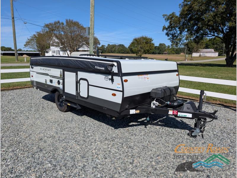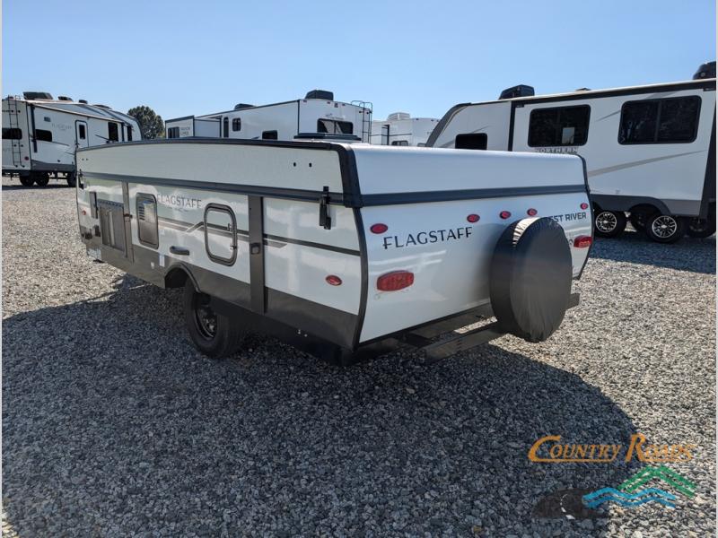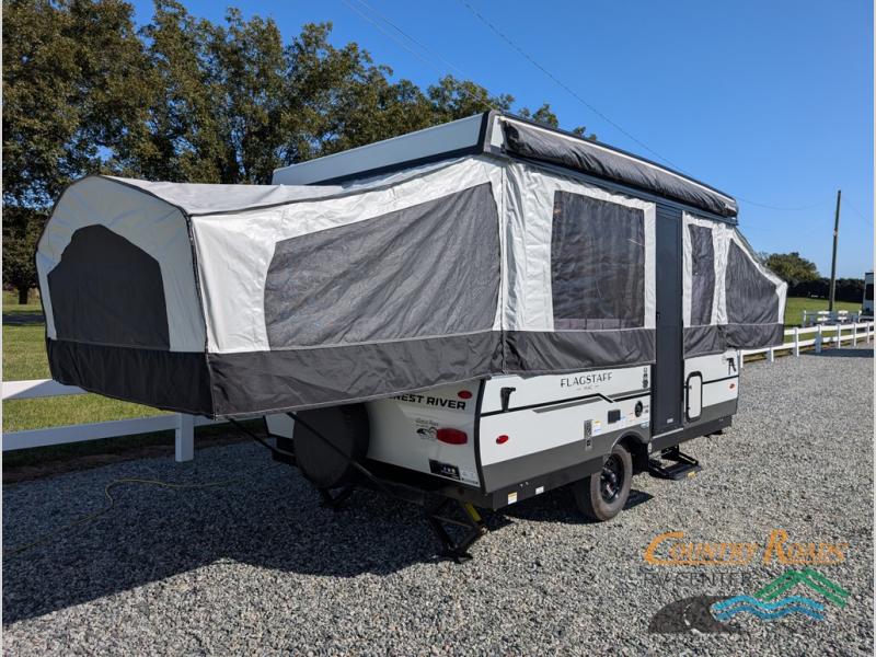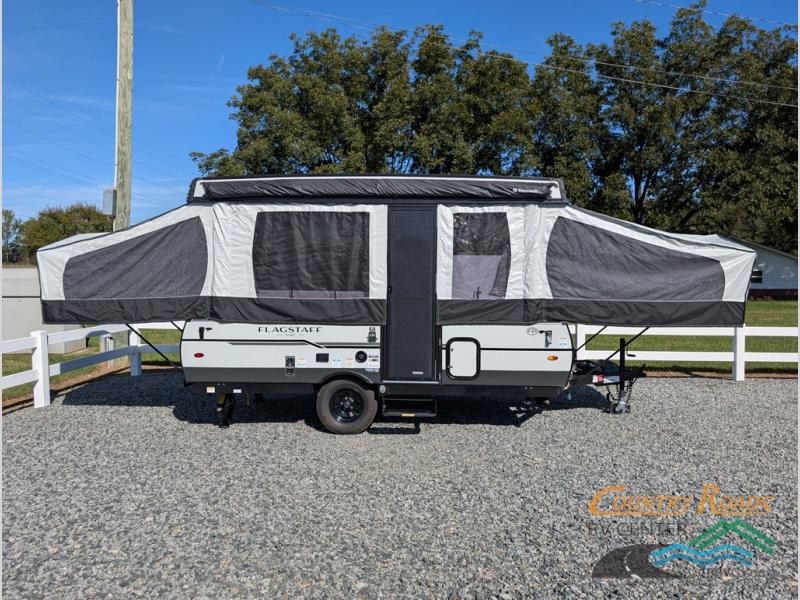 You'll be pleasantly surprised by the amount of comfort in these Flagstaff MAC Series folding pop-up campers by Forest River. Each one is built with a fiberglass laminated roof for added durability and a power roof lift for easy set up. There is also a clay exterior with an alloy band, solar panel prep on the frame, and four stabilizer jacks with sand pads to keep your camper secure. The interior features wood plank flooring, USB charging ports, and stylish Andover Sable wood.