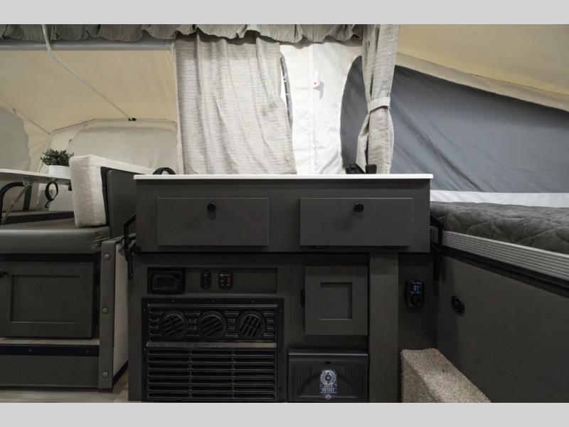 You'll be pleasantly surprised by the amount of comfort in these Flagstaff MAC Series folding pop-up campers by Forest River. Each one is built with a fiberglass laminated roof for added durability and a power roof lift for easy set up. There is also a clay exterior with an alloy band, solar panel prep on the frame, and four stabilizer jacks with sand pads to keep your camper secure. The interior features wood plank flooring, USB charging ports, and stylish Andover Sable wood.