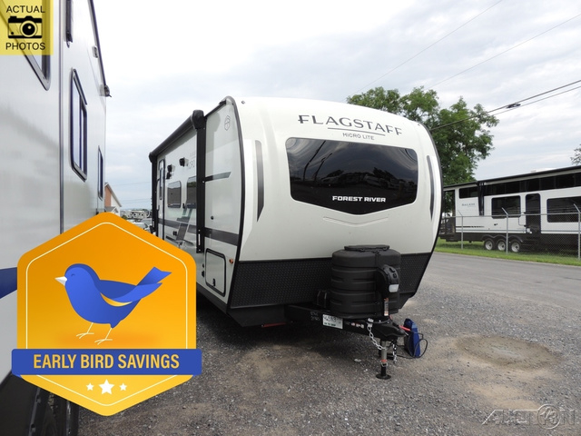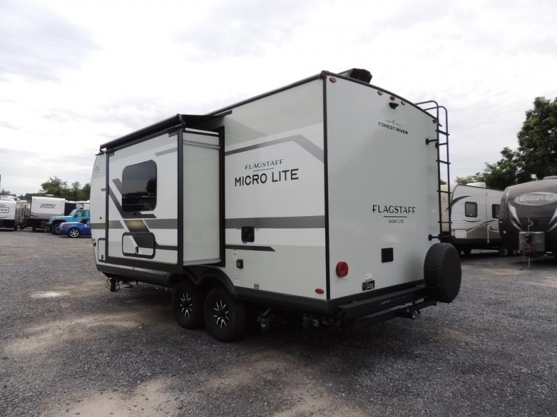 With any Flagstaff Micro Lite travel trailer by Forest River you will enjoy lightweight towing, durable construction, and added interior comforts to make each trip memorable! Each model features RoadTech tire pressure monitoring, Dexter Torflex axles, and nitrogen-filled Goodyear endurance tires for smooth towing from home to campground. The 6-sided aluminum framed construction provides a strong foundation so you can enjoy your RV for years to come, plus the radiant foil in the front cap, underbelly and slides help insulate your trailer. Additional exterior features include a 200W solar panel, back-up camera prep, frameless windows, and slam baggage doors. Each model includes the Great Expectations Package with roller shades, solid surface kitchen countertops, and hidden hinge cabinet doors. There is also an exterior hot/cold water port, outside speakers, a power tongue jack and stabilizer jacks, plus many more conveniences.