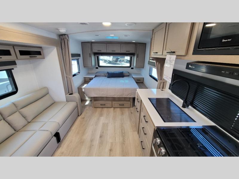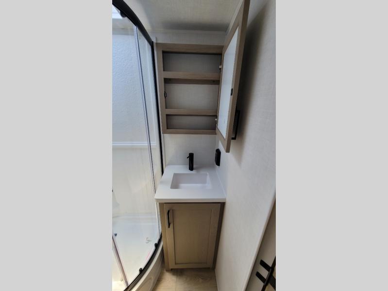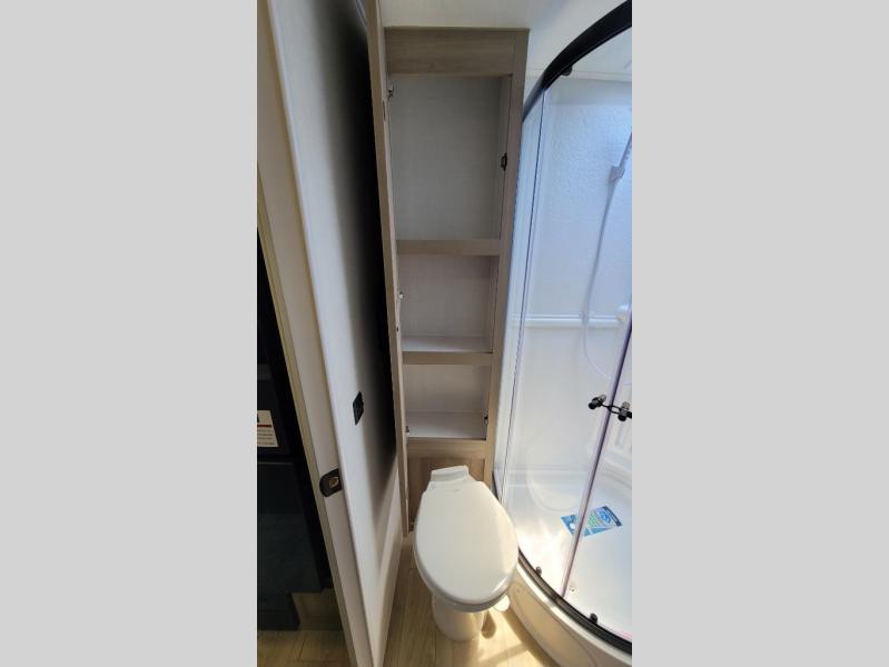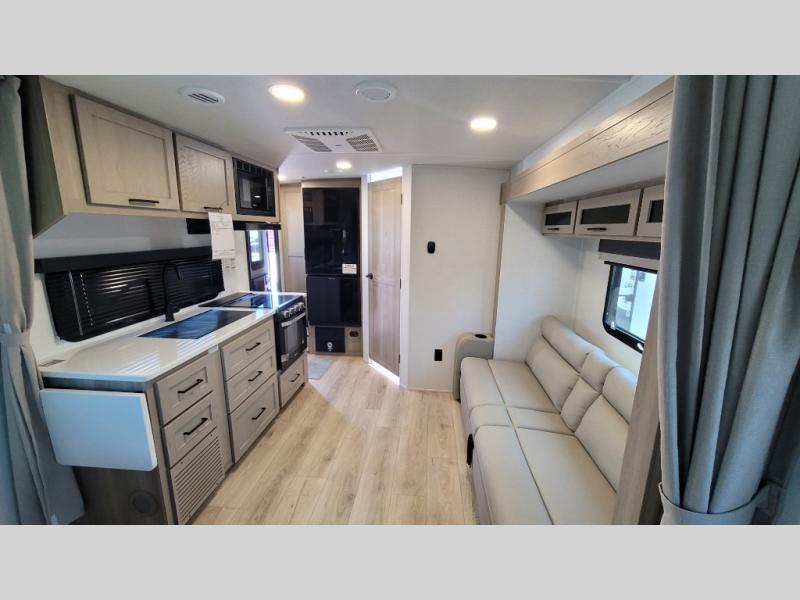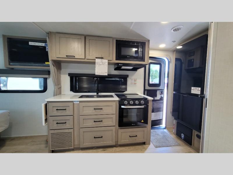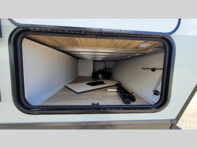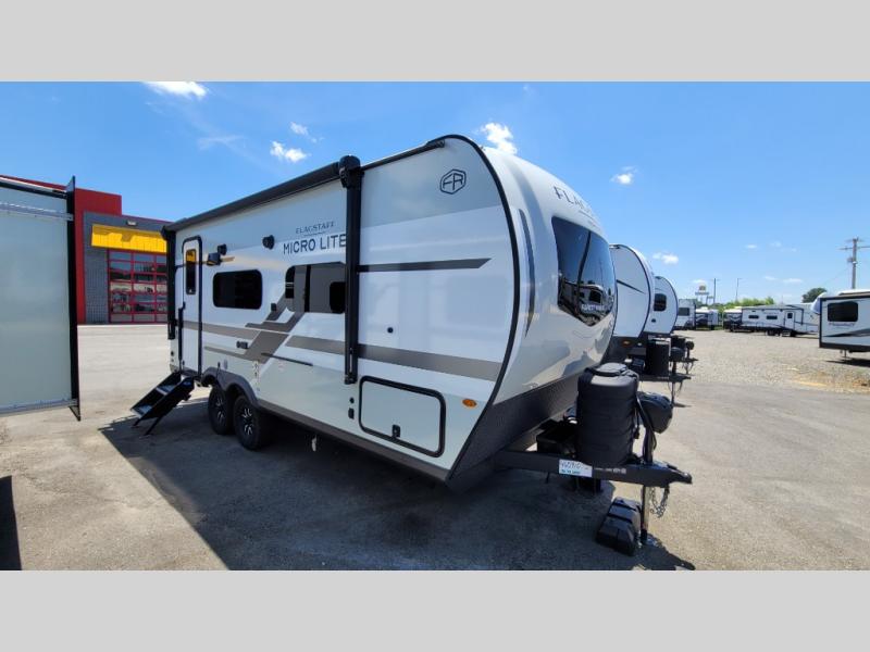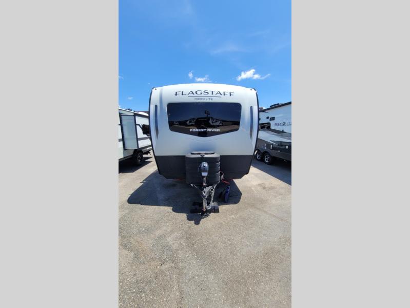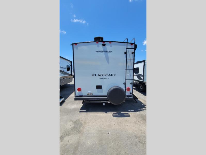 With any Flagstaff Micro Lite travel trailer by Forest River you will enjoy lightweight towing, durable construction, and added interior comforts to make each trip memorable! Each model features RoadTech tire pressure monitoring, Dexter Torflex axles, and nitrogen-filled Goodyear endurance tires for smooth towing from home to campground. The 6-sided aluminum framed construction provides a strong foundation so you can enjoy your RV for years to come, plus the radiant foil in the front cap, underbelly and slides help insulate your trailer. Additional exterior features include a 200W solar panel, back-up camera prep, frameless windows, and slam baggage doors. Each model includes the Great Expectations Package with roller shades, solid surface kitchen countertops, and hidden hinge cabinet doors. There is also an exterior hot/cold water port, outside speakers, a power tongue jack and stabilizer jacks, plus many more conveniences.
