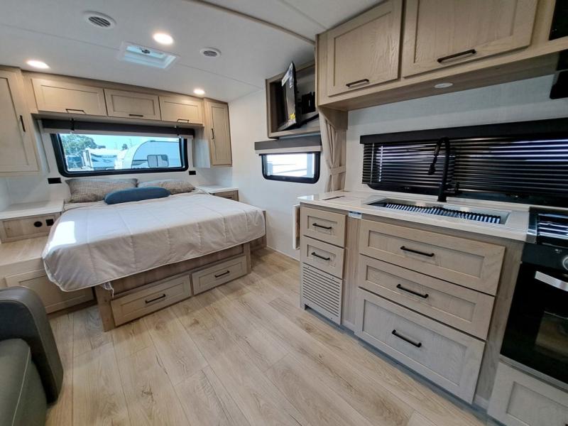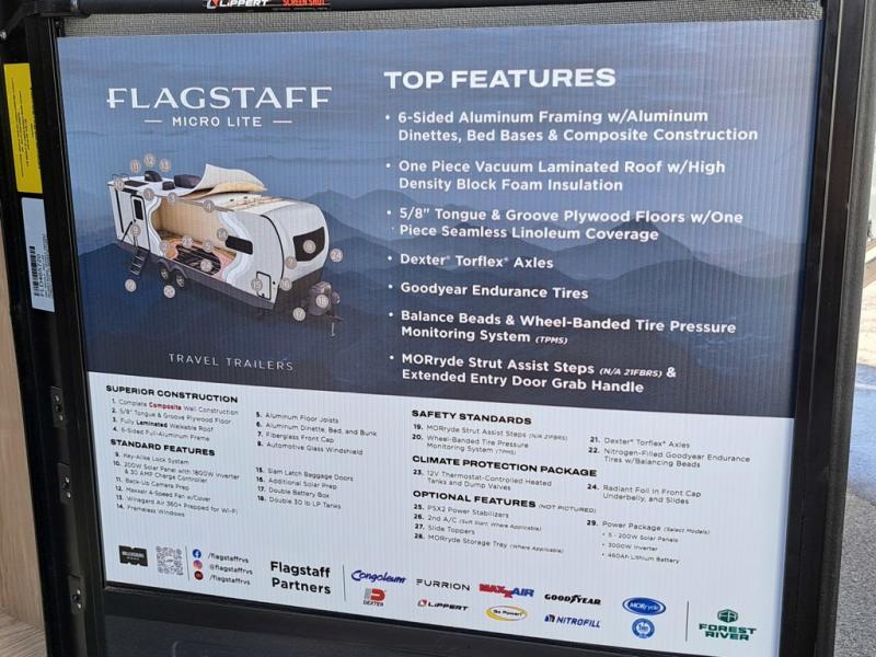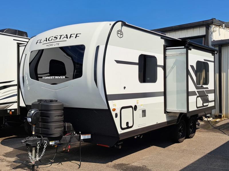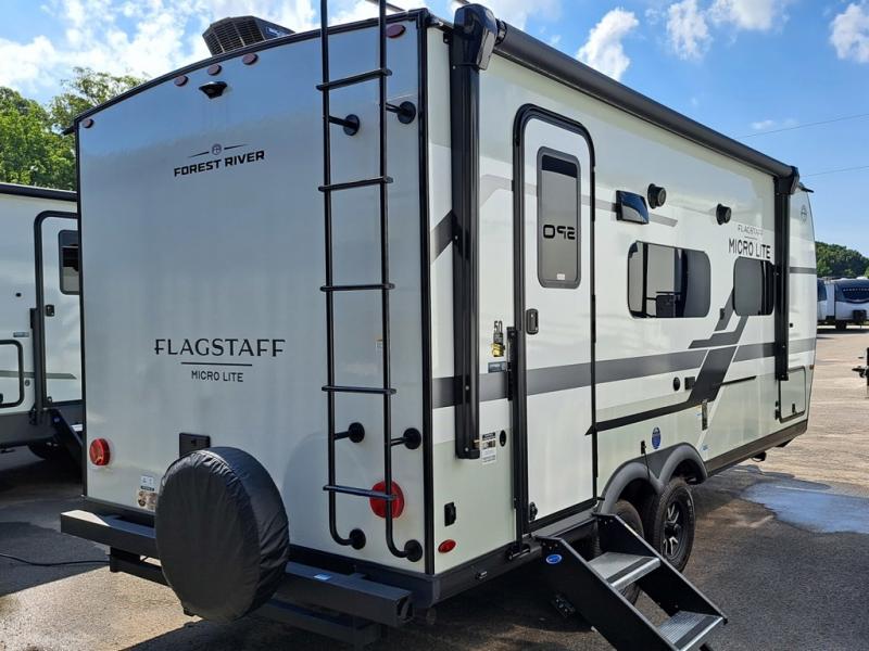 With any Flagstaff Micro Lite travel trailer by Forest River you will enjoy lightweight towing, durable construction, and added interior comforts to make each trip memorable! Each model features a torsion axle, Rubber-Ryde suspension, nitrogen filled, Goodyear Endurance tires, and easy lube axles with Nev-R-Adjust brakes for smooth towing from home to campground. The 6-sided aluminum framed construction provides a strong foundation so you can enjoy your RV for years to come, plus electronically controlled heated holding tanks and an enclosed underbelly will let you camp all year long. Head inside to find hybrid woven flooring in the slide outs, Sedona wood cabinetry, solid surface kitchen countertops, and many more amenities. These travel trailers also include exterior conveniences for hassle-free camping, like the power tongue jack, magnetic compartment door catches, Keyed Alike locks, and rear ladder to name a few!