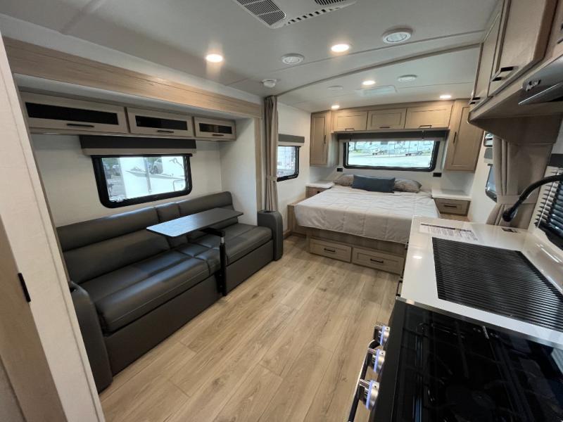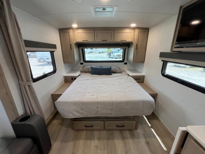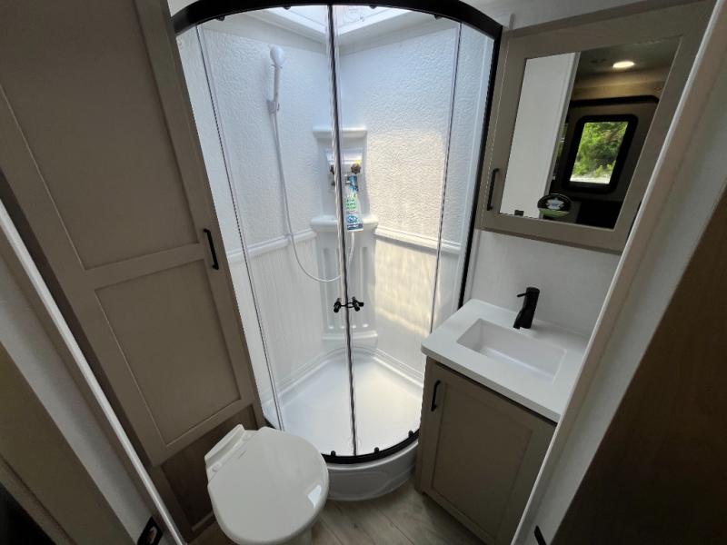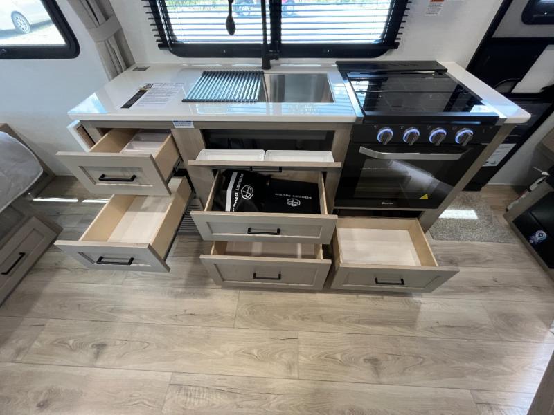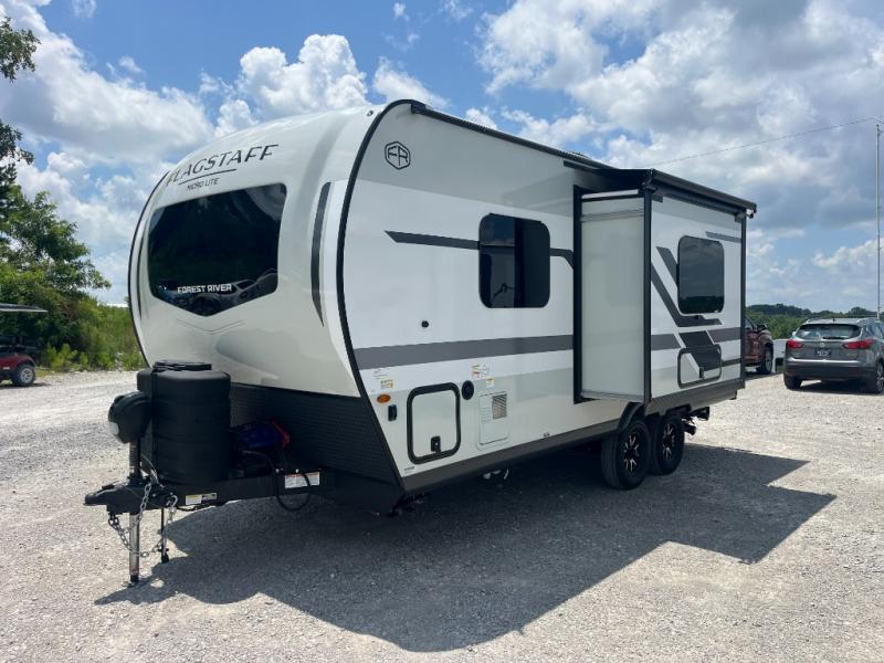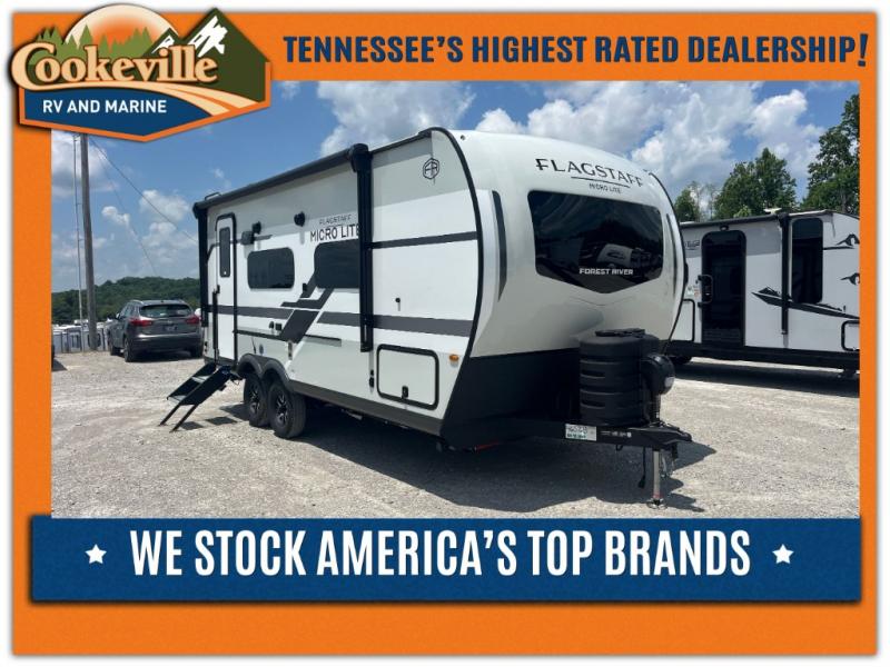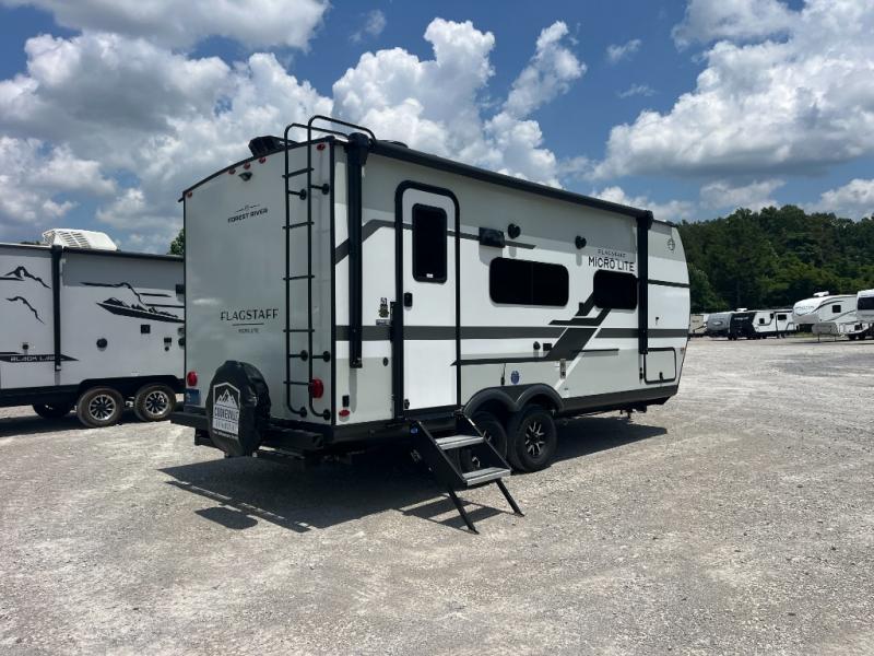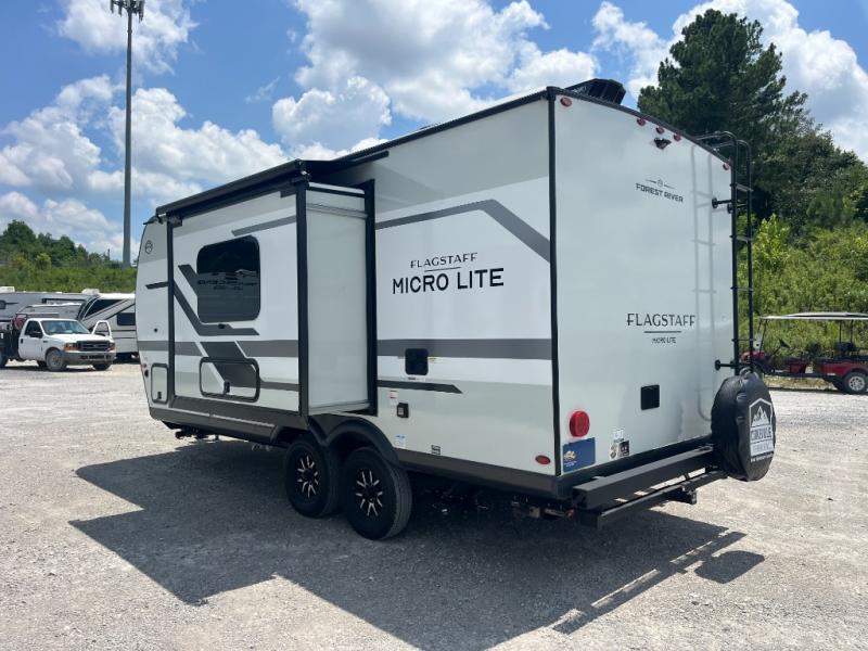 With any Flagstaff Micro Lite travel trailer by Forest River you will enjoy lightweight towing, durable construction, and added interior comforts to make each trip memorable! Each model features RoadTech tire pressure monitoring, Dexter Torflex axles, and nitrogen-filled Goodyear endurance tires for smooth towing from home to campground. The 6-sided aluminum framed construction provides a strong foundation so you can enjoy your RV for years to come, plus the radiant foil in the front cap, underbelly and slides help insulate your trailer. Additional exterior features include a 200W solar panel, back-up camera prep, frameless windows, and slam baggage doors. Each model includes the Great Expectations Package with roller shades, solid surface kitchen countertops, and hidden hinge cabinet doors. There is also an exterior hot/cold water port, outside speakers, a power tongue jack and stabilizer jacks, plus many more conveniences.