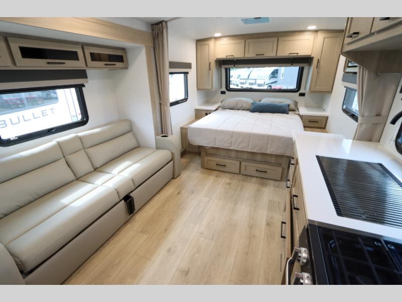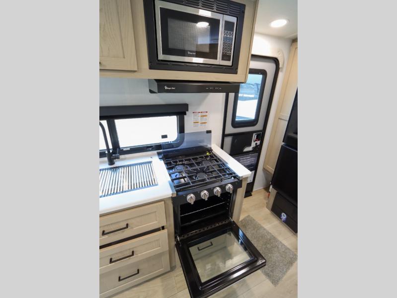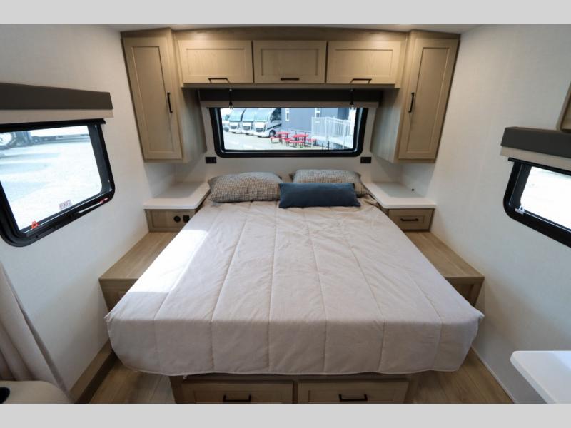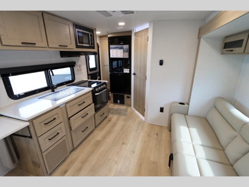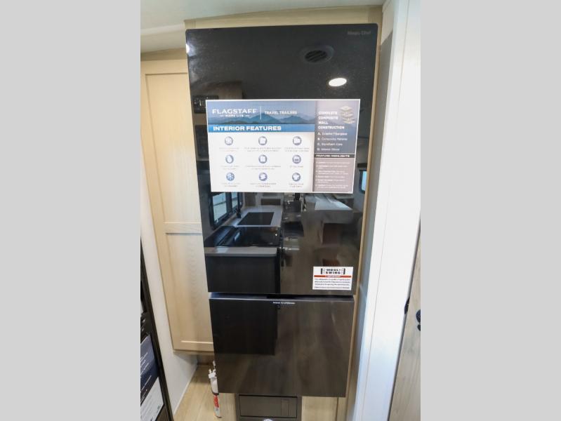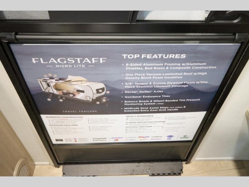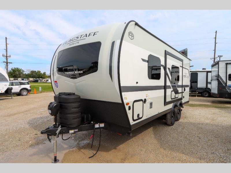 With any Flagstaff Micro Lite travel trailer by Forest River you will enjoy lightweight towing, durable construction, and added interior comforts to make each trip memorable! Each model features a torsion axle, Rubber-Ryde suspension, nitrogen filled, Goodyear Endurance tires, and easy lube axles with Nev-R-Adjust brakes for smooth towing from home to campground. The 6-sided aluminum framed construction provides a strong foundation so you can enjoy your RV for years to come, plus electronically controlled heated holding tanks and an enclosed underbelly will let you camp all year long. Head inside to find hybrid woven flooring in the slide outs, Sedona wood cabinetry, solid surface kitchen countertops, and many more amenities. These travel trailers also include exterior conveniences for hassle-free camping, like the power tongue jack, magnetic compartment door catches, Keyed Alike locks, and rear ladder to name a few!