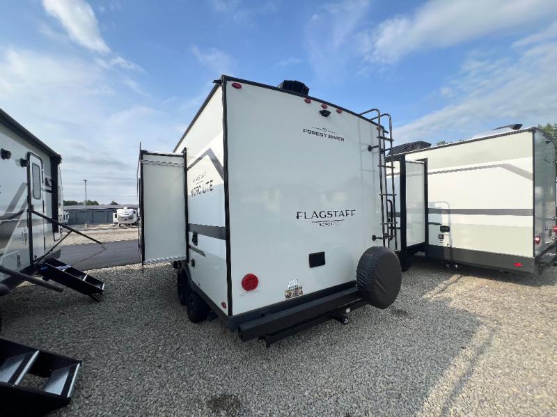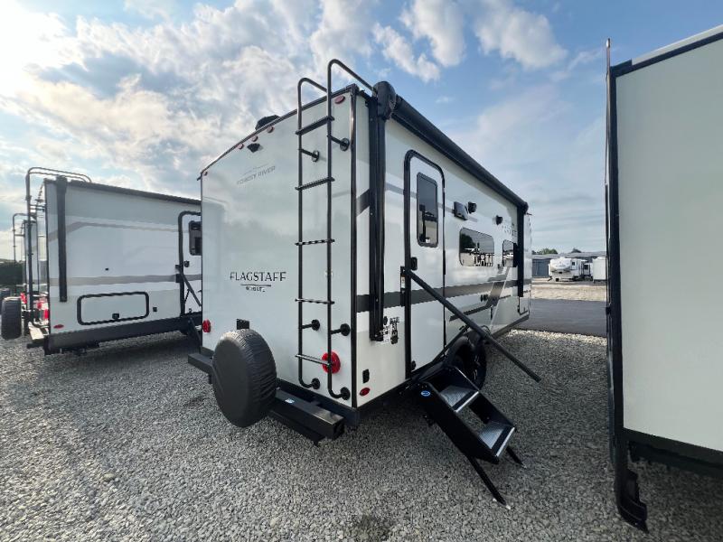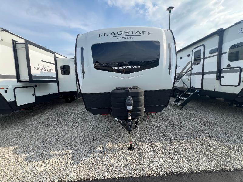 With any Flagstaff Micro Lite travel trailer by Forest River you will enjoy lightweight towing, durable construction, and added interior comforts to make each trip memorable! Each model features RoadTech tire pressure monitoring, Dexter Torflex axles, and nitrogen-filled Goodyear endurance tires for smooth towing from home to campground. The 6-sided aluminum framed construction provides a strong foundation so you can enjoy your RV for years to come, plus the radiant foil in the front cap, underbelly and slides help insulate your trailer. Additional exterior features include a 200W solar panel, back-up camera prep, frameless windows, and slam baggage doors. Each model includes the Great Expectations Package with roller shades, solid surface kitchen countertops, and hidden hinge cabinet doors. There is also an exterior hot/cold water port, outside speakers, a power tongue jack and stabilizer jacks, plus many more conveniences.