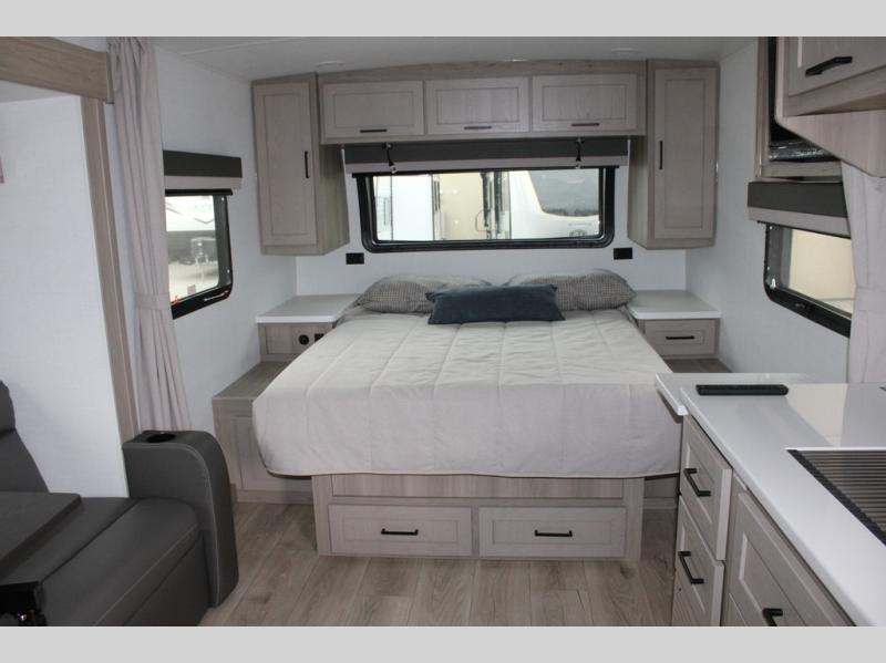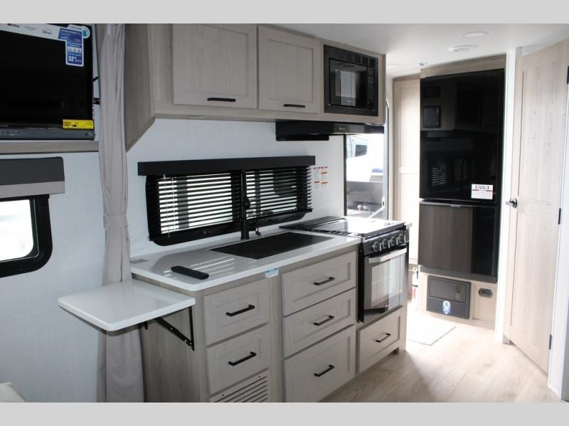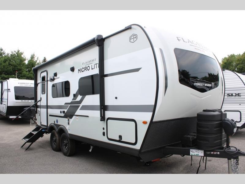 With any Flagstaff Micro Lite travel trailer by Forest River you will enjoy lightweight towing, durable construction, and added interior comforts to make each trip memorable! Each model features RoadTech tire pressure monitoring, Dexter Torflex axles, and nitrogen-filled Goodyear endurance tires for smooth towing from home to campground. The 6-sided aluminum framed construction provides a strong foundation so you can enjoy your RV for years to come, plus the radiant foil in the front cap, underbelly and slides help insulate your trailer. Additional exterior features include a 200W solar panel, back-up camera prep, frameless windows, and slam baggage doors. Each model includes the Great Expectations Package with roller shades, solid surface kitchen countertops, and hidden hinge cabinet doors. There is also an exterior hot/cold water port, outside speakers, a power tongue jack and stabilizer jacks, plus many more conveniences.