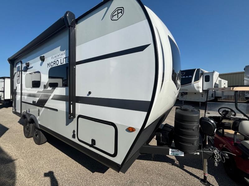 With any Flagstaff Micro Lite travel trailer by Forest River you will enjoy lightweight towing, durable construction, and added interior comforts to make each trip memorable! Each model features RoadTech tire pressure monitoring, Dexter Torflex axles, and nitrogen-filled Goodyear endurance tires for smooth towing from home to campground. The 6-sided aluminum framed construction provides a strong foundation so you can enjoy your RV for years to come, plus the radiant foil in the front cap, underbelly and slides help insulate your trailer. Additional exterior features include a 200W solar panel, back-up camera prep, frameless windows, and slam baggage doors. Each model includes the Great Expectations Package with roller shades, solid surface kitchen countertops, and hidden hinge cabinet doors. There is also an exterior hot/cold water port, outside speakers, a power tongue jack and stabilizer jacks, plus many more conveniences.