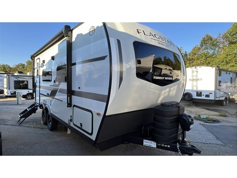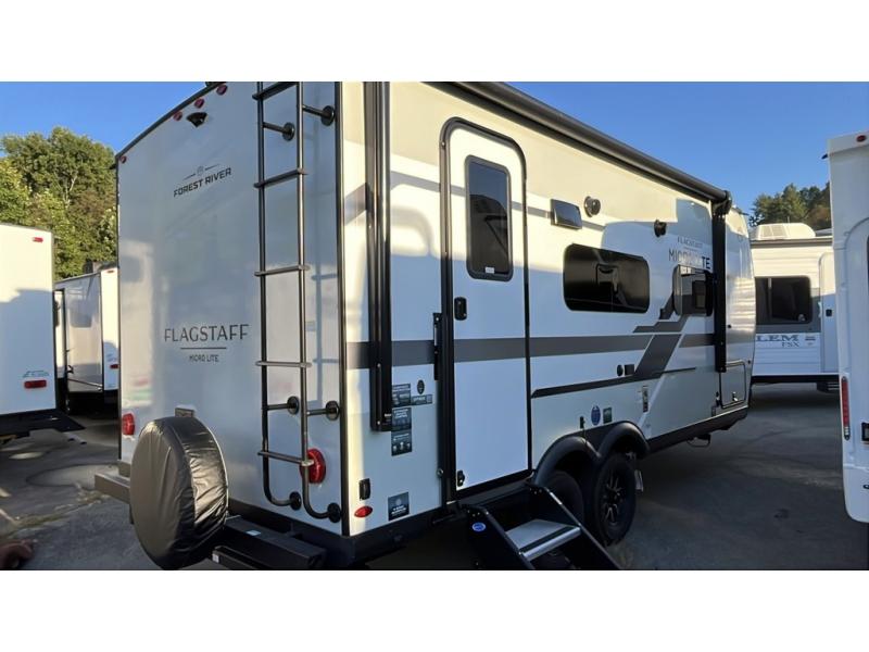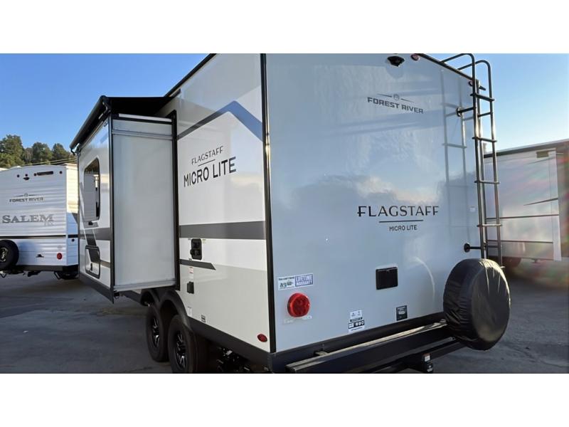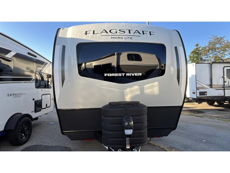 With any Flagstaff Micro Lite travel trailer by Forest River you will enjoy lightweight towing, durable construction, and added interior comforts to make each trip memorable! Each model features RoadTech tire pressure monitoring, Dexter Torflex axles, and nitrogen-filled Goodyear endurance tires for smooth towing from home to campground. The 6-sided aluminum framed construction provides a strong foundation so you can enjoy your RV for years to come, plus the radiant foil in the front cap, underbelly and slides help insulate your trailer. Additional exterior features include a 200W solar panel, back-up camera prep, frameless windows, and slam baggage doors. Each model includes the Great Expectations Package with roller shades, solid surface kitchen countertops, and hidden hinge cabinet doors. There is also an exterior hot/cold water port, outside speakers, a power tongue jack and stabilizer jacks, plus many more conveniences.