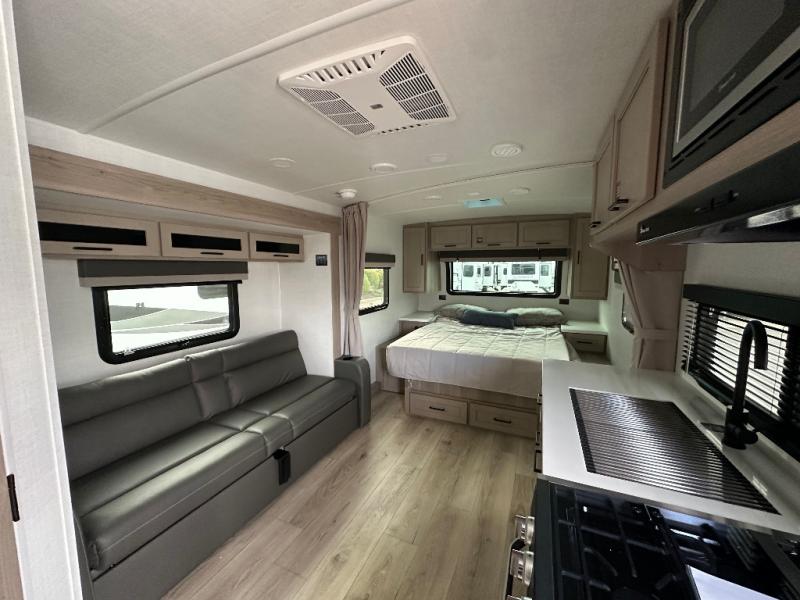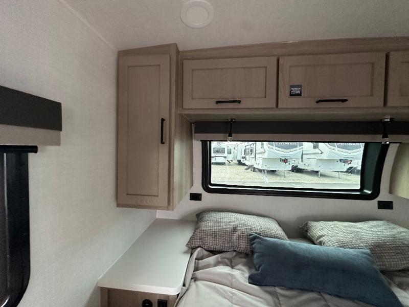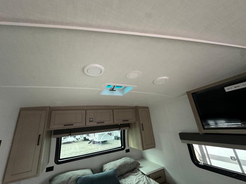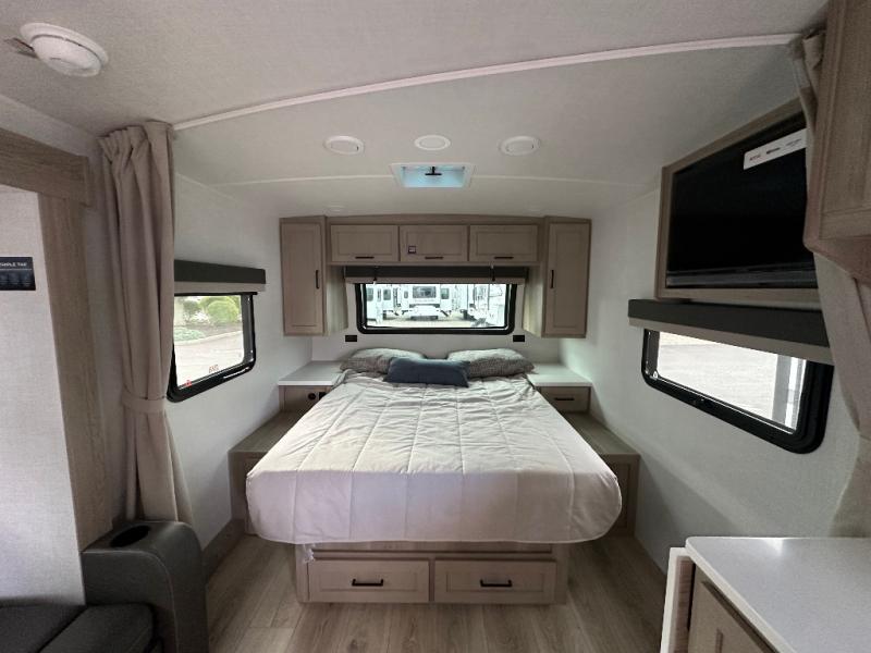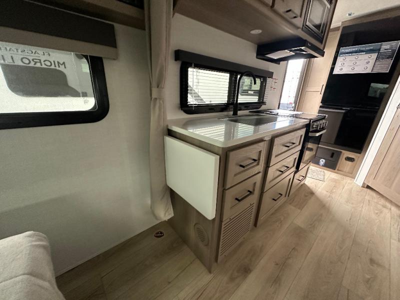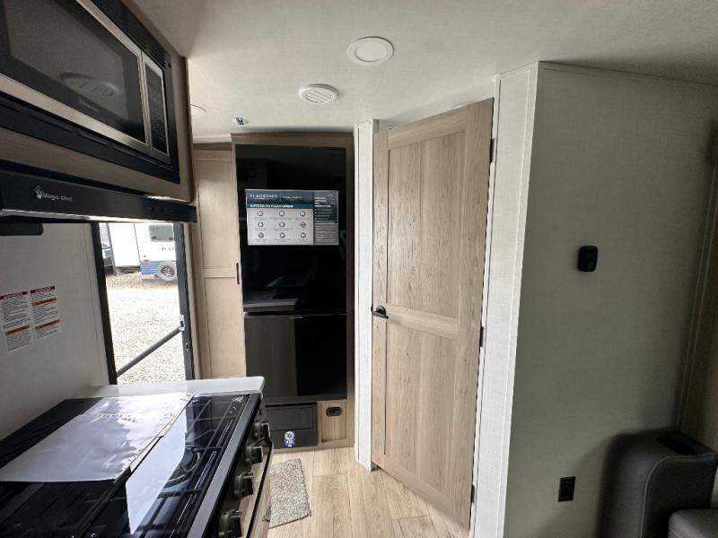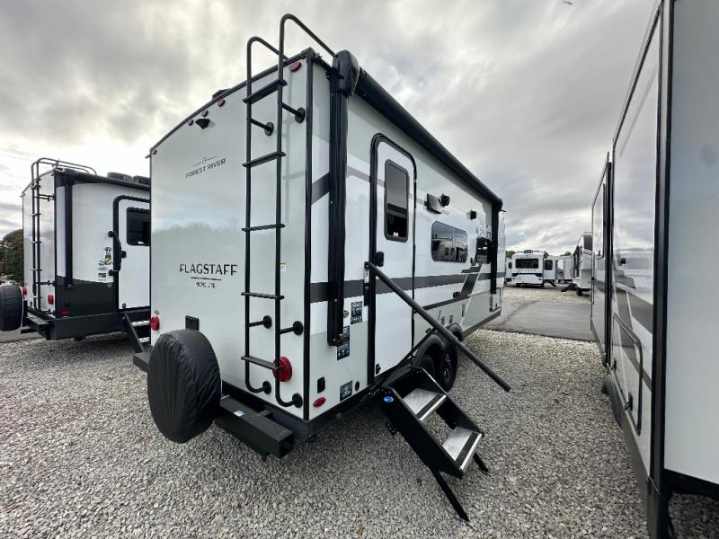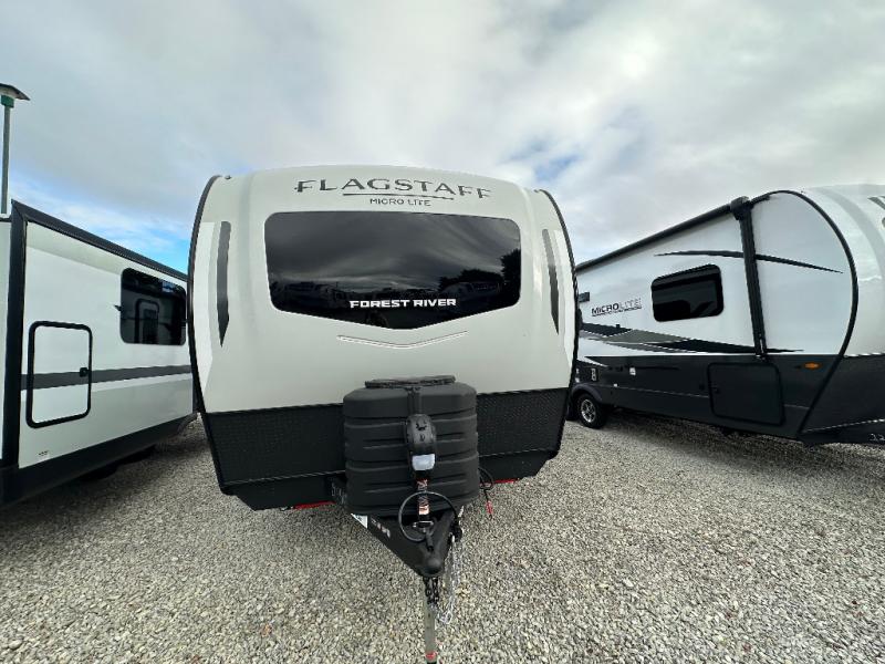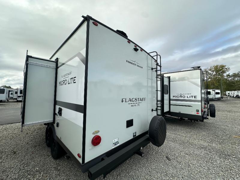 With any Flagstaff Micro Lite travel trailer by Forest River you will enjoy lightweight towing, durable construction, and added interior comforts to make each trip memorable! Each model features RoadTech tire pressure monitoring, Dexter Torflex axles, and nitrogen-filled Goodyear endurance tires for smooth towing from home to campground. The 6-sided aluminum framed construction provides a strong foundation so you can enjoy your RV for years to come, plus the radiant foil in the front cap, underbelly and slides help insulate your trailer. Additional exterior features include a 200W solar panel, back-up camera prep, frameless windows, and slam baggage doors. Each model includes the Great Expectations Package with roller shades, solid surface kitchen countertops, and hidden hinge cabinet doors. There is also an exterior hot/cold water port, outside speakers, a power tongue jack and stabilizer jacks, plus many more conveniences.