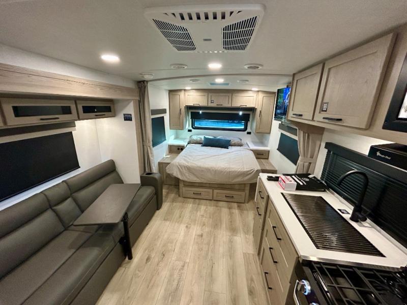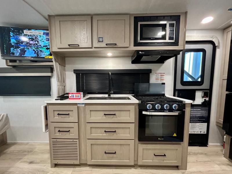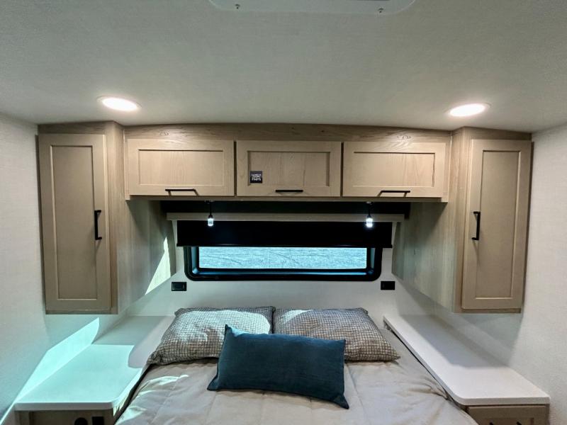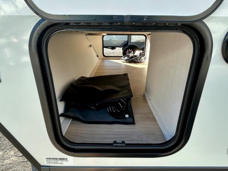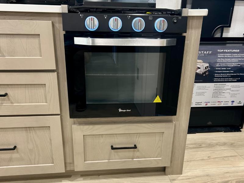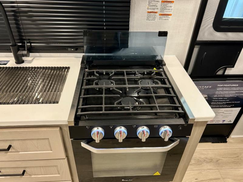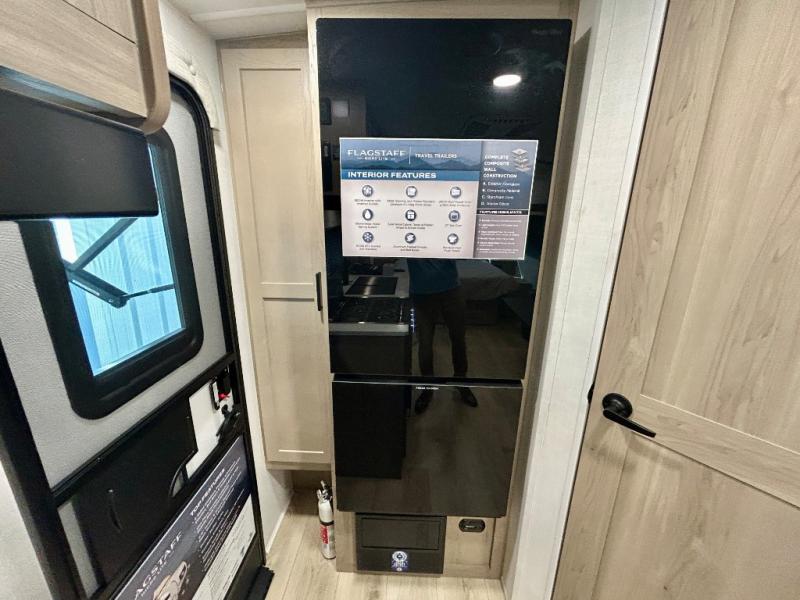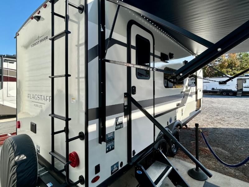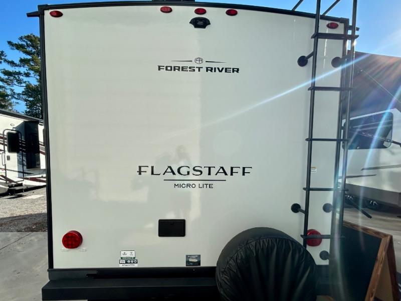With any Flagstaff Micro Lite travel trailer by Forest River you will enjoy lightweight towing, durable construction, and added interior comforts to make each trip memorable! Each model features RoadTech tire pressure monitoring, Dexter Torflex axles, and nitrogen-filled Goodyear endurance tires for smooth towing from home to campground. The 6-sided aluminum framed construction provides a strong foundation so you can enjoy your RV for years to come, plus the radiant foil in the front cap, underbelly and slides help insulate your trailer. Additional exterior features include a 200W solar panel, back-up camera prep, frameless windows, and slam baggage doors. Each model includes the Great Expectations Package with roller shades, solid surface kitchen countertops, and hidden hinge cabinet doors. There is also an exterior hot/cold water port, outside speakers, a power tongue jack and stabilizer jacks, plus many more conveniences.
