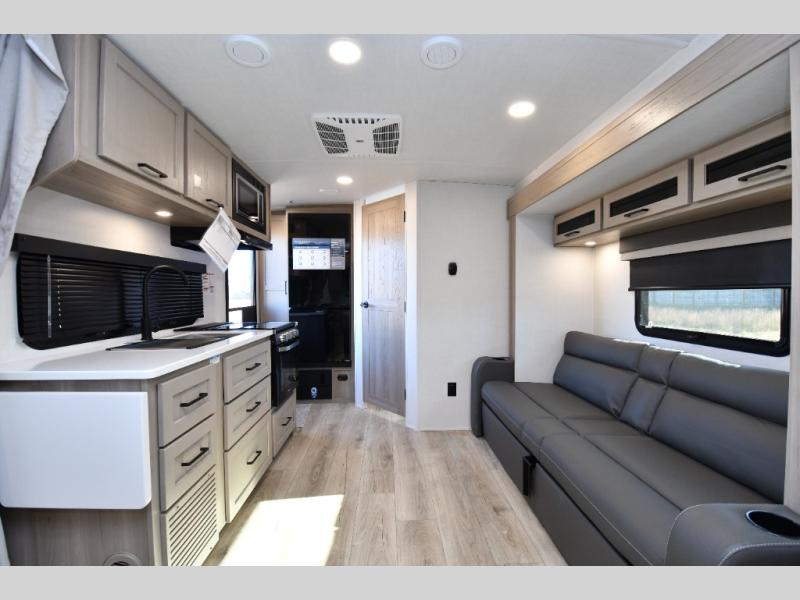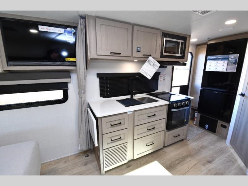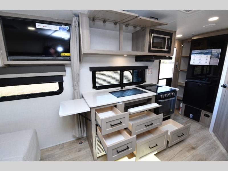 Couples ready to escape the daily grind will love the 2026 Flagstaff Micro Lite 21FBRS. With a front RV queen bed, rear corner bath with radius shower, and clever storage solutions under the bed, this trailer makes weekend getaways or extended adventures effortless. The single slide with a 72" sofa opens up the living area, while the table in front of the sofa offers a cozy spot for meals, games, or work. Outside, the 14' power awning with LED lighting and pass-through storage make camping convenient and fun.