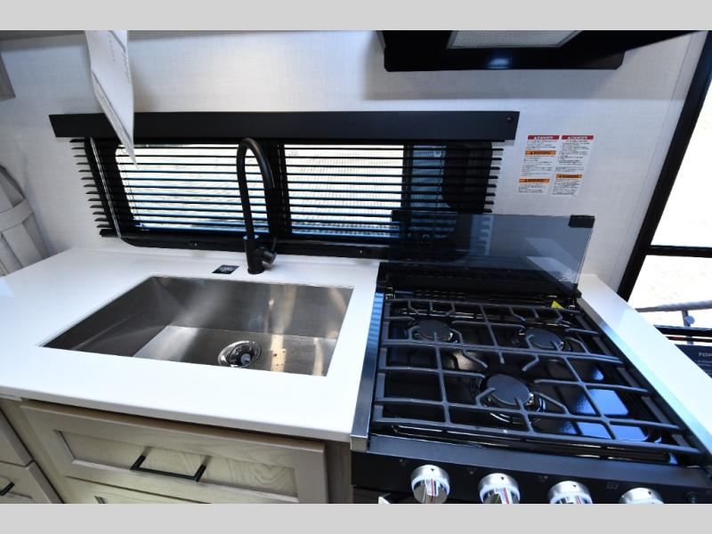 Cooking is simple with the three-burner cooktop, while additional storage compartments keep gear, luggage, and outdoor toys organized. Lightweight towing, solid construction, and thoughtful interior touches ensure every trip is smooth and enjoyable. This trailer is perfect for couples who want a nimble, efficient camper without sacrificing comfort.
