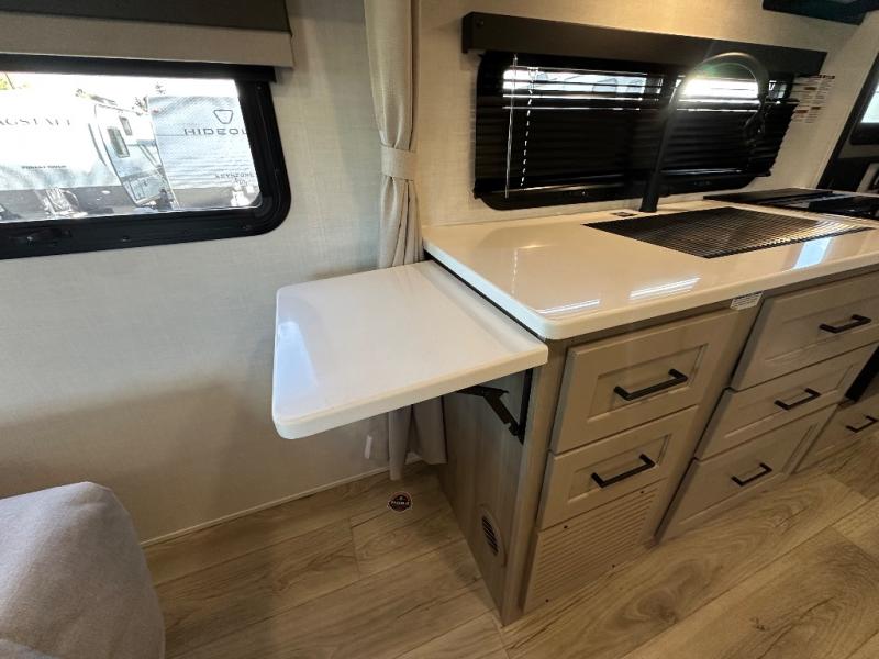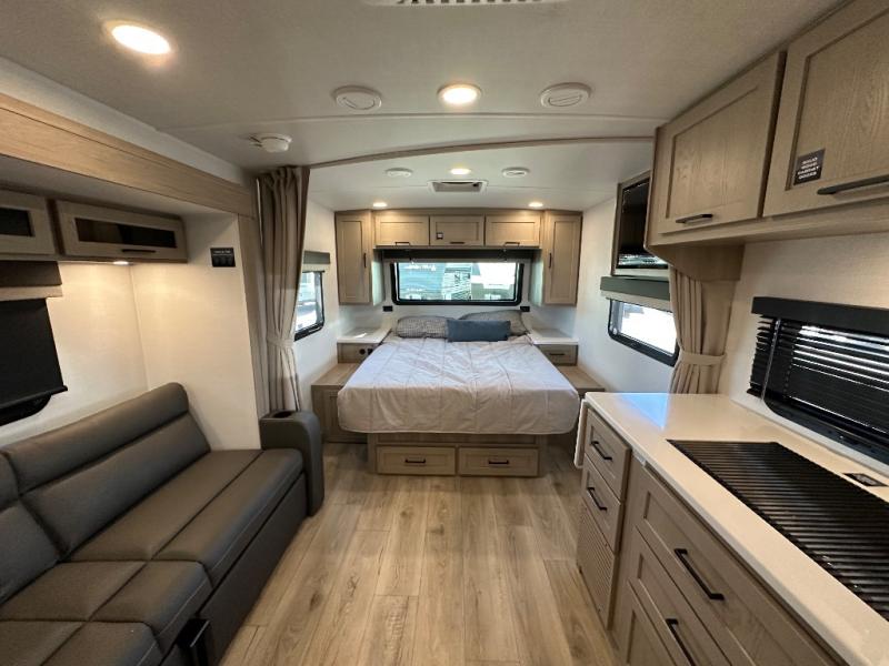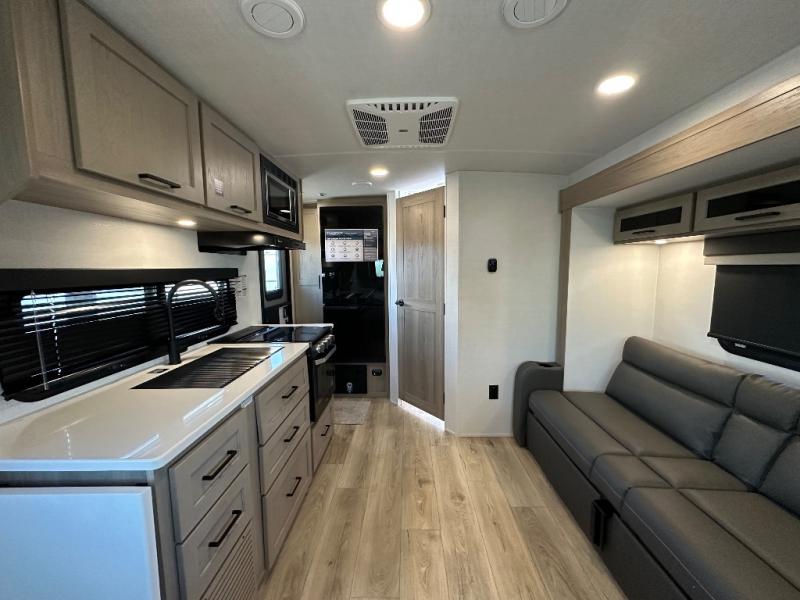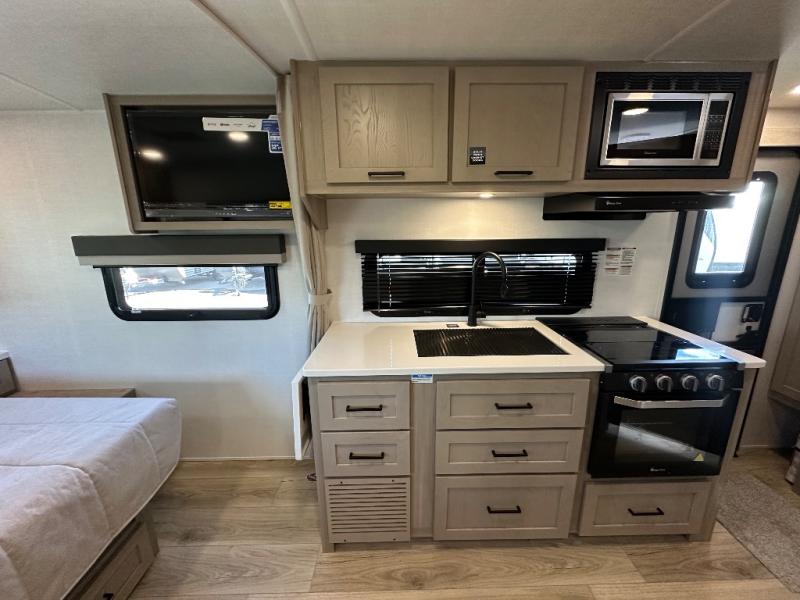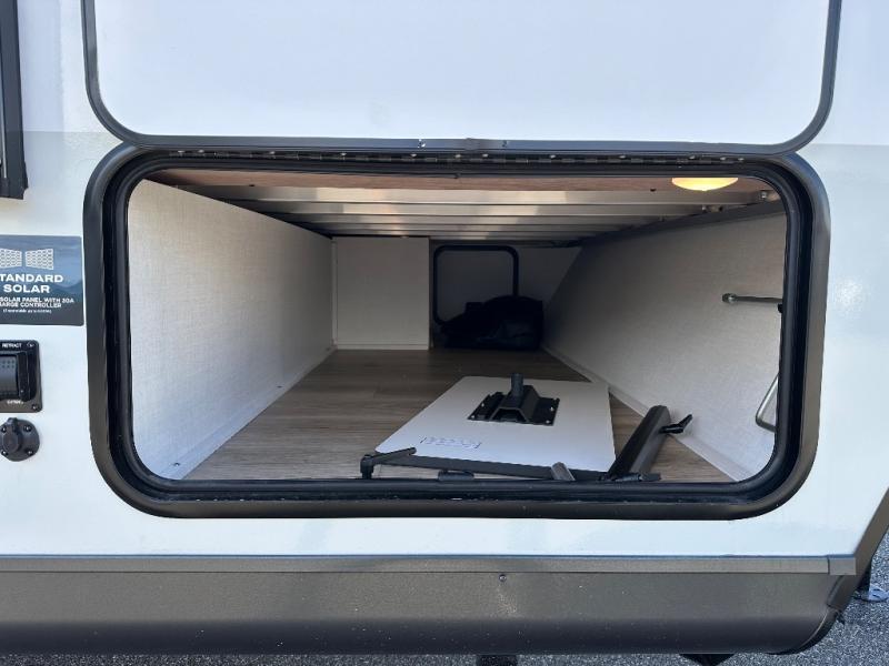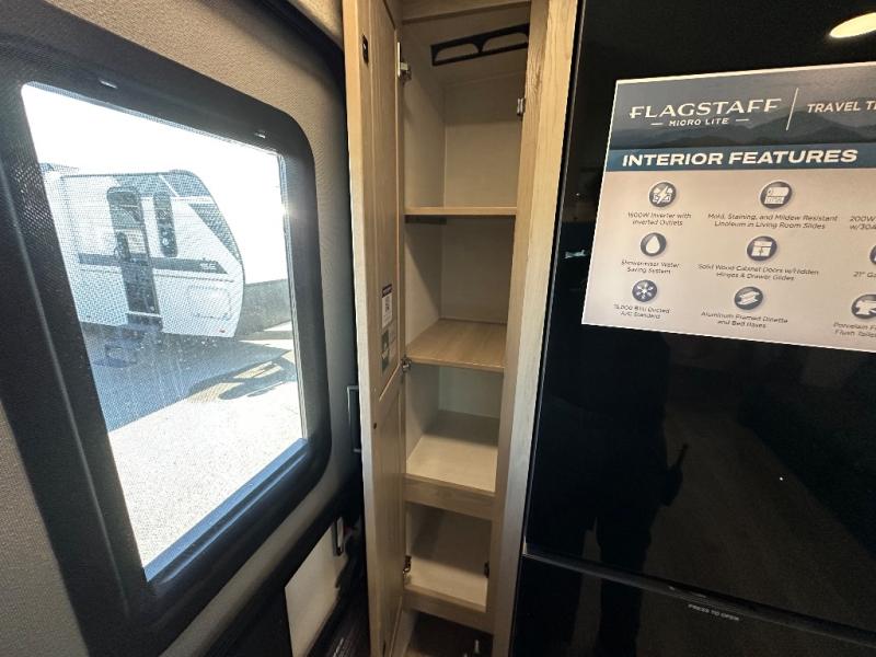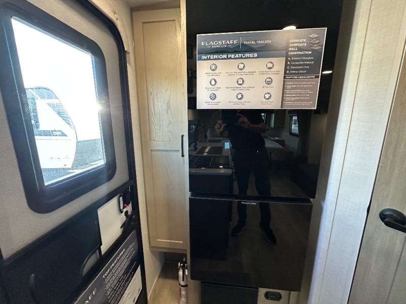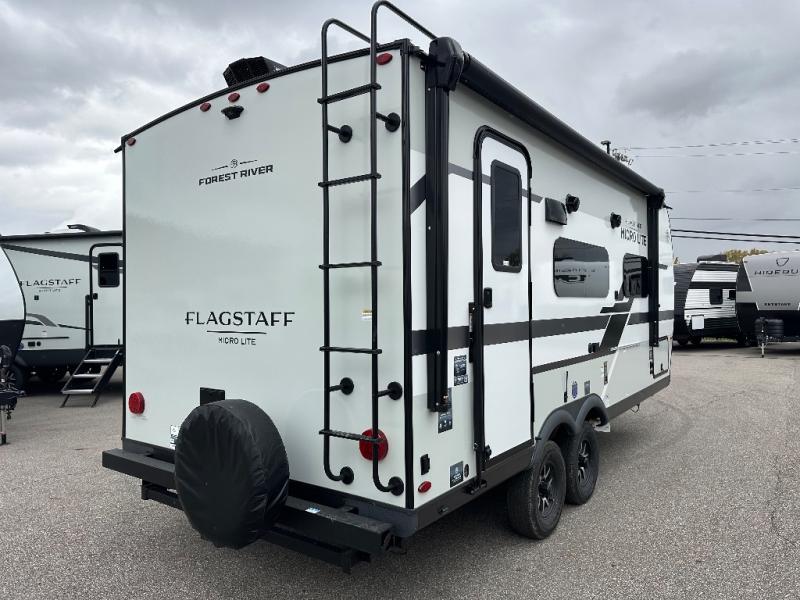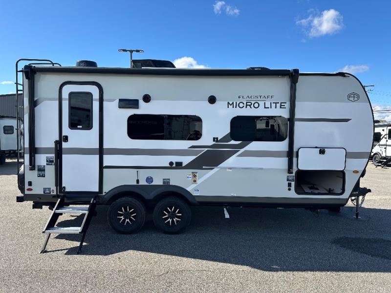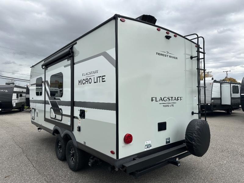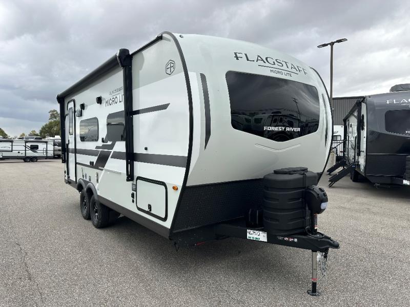 With any Flagstaff Micro Lite travel trailer by Forest River you will enjoy lightweight towing, durable construction, and added interior comforts to make each trip memorable! Each model features RoadTech tire pressure monitoring, Dexter Torflex axles, and nitrogen-filled Goodyear endurance tires for smooth towing from home to campground. The 6-sided aluminum framed construction provides a strong foundation so you can enjoy your RV for years to come, plus the radiant foil in the front cap, underbelly and slides help insulate your trailer. Additional exterior features include a 200W solar panel, back-up camera prep, frameless windows, and slam baggage doors. Each model includes the Great Expectations Package with roller shades, solid surface kitchen countertops, and hidden hinge cabinet doors. There is also an exterior hot/cold water port, outside speakers, a power tongue jack and stabilizer jacks, plus many more conveniences.