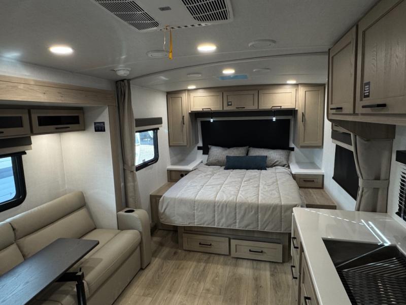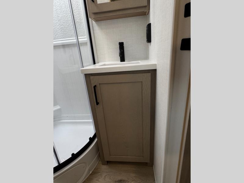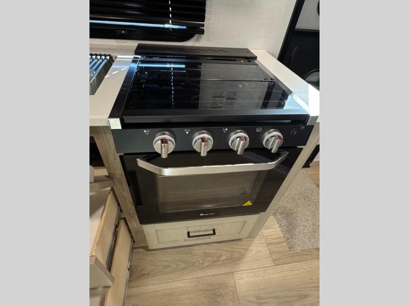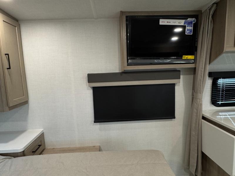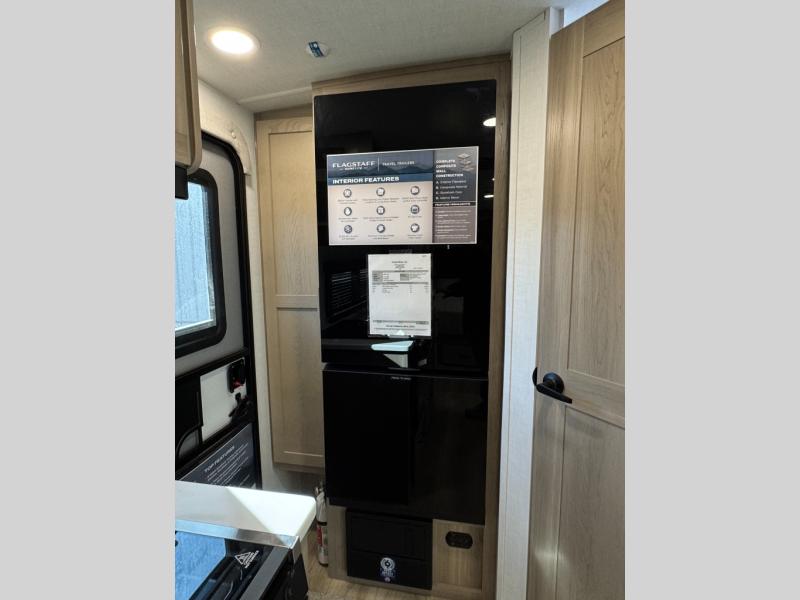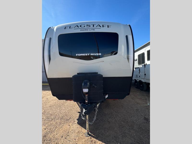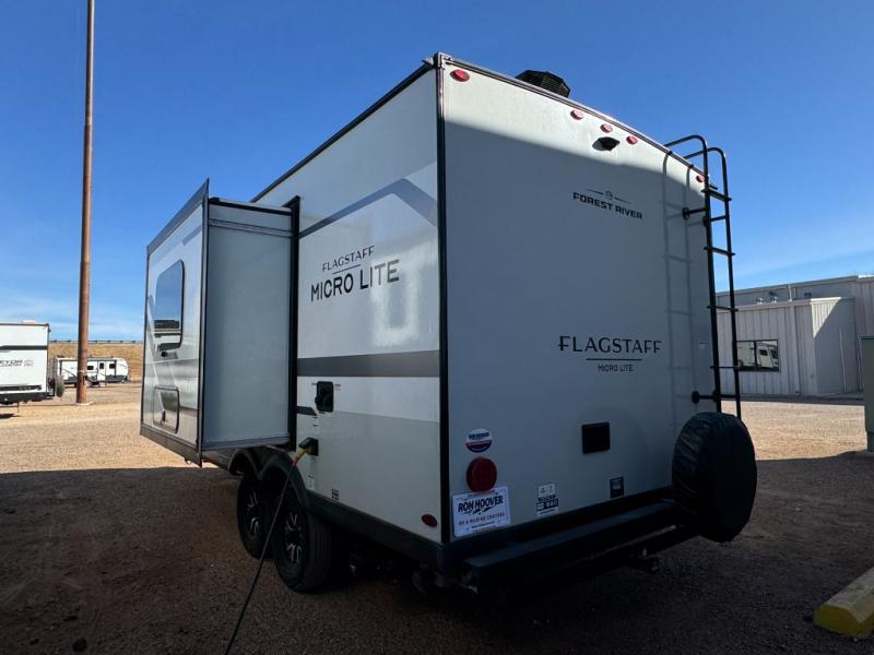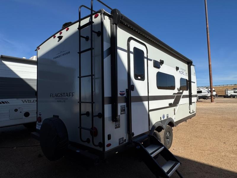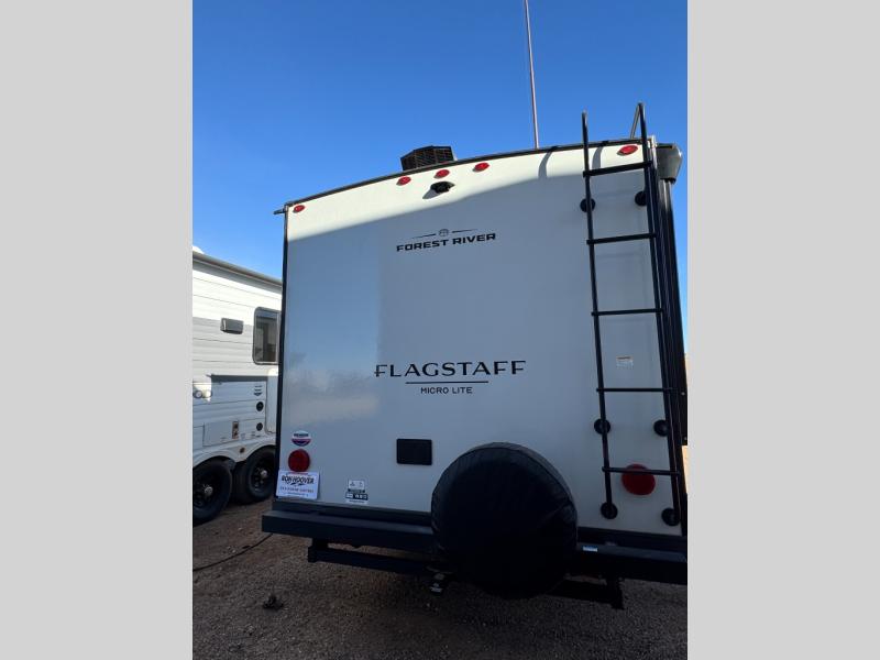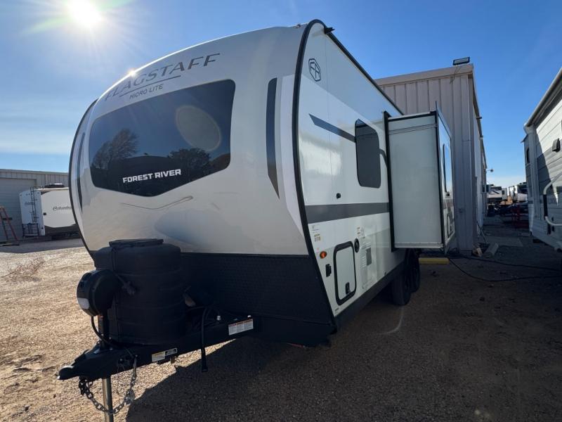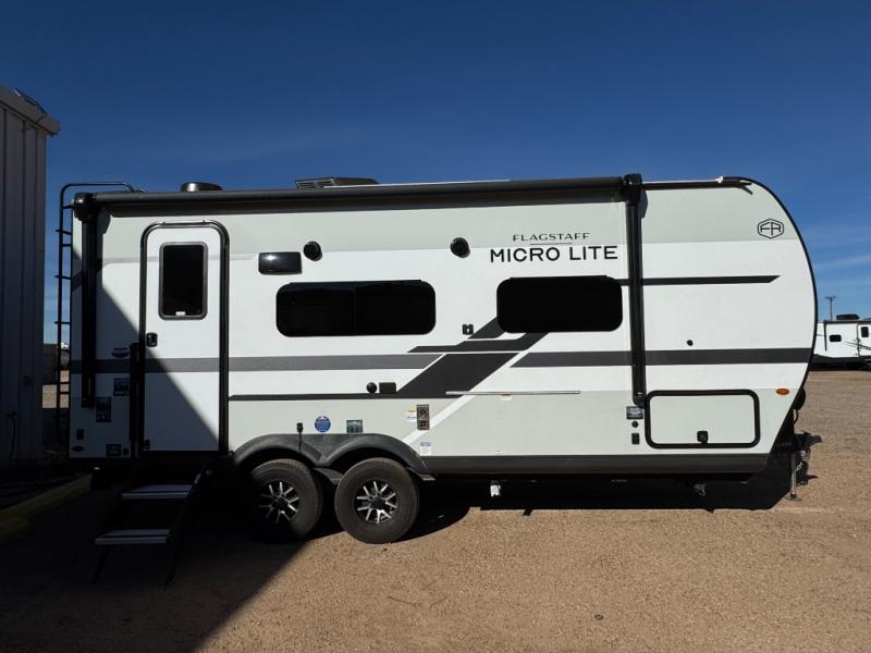 With any Flagstaff Micro Lite travel trailer by Forest River you will enjoy lightweight towing, durable construction, and added interior comforts to make each trip memorable! Each model features RoadTech tire pressure monitoring, Dexter Torflex axles, and nitrogen-filled Goodyear endurance tires for smooth towing from home to campground. The 6-sided aluminum framed construction provides a strong foundation so you can enjoy your RV for years to come, plus the radiant foil in the front cap, underbelly and slides help insulate your trailer. Additional exterior features include a 200W solar panel, back-up camera prep, frameless windows, and slam baggage doors. Each model includes the Great Expectations Package with roller shades, solid surface kitchen countertops, and hidden hinge cabinet doors. There is also an exterior hot/cold water port, outside speakers, a power tongue jack and stabilizer jacks, plus many more conveniences.