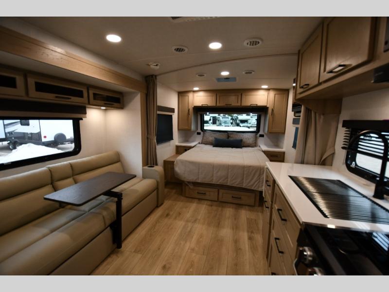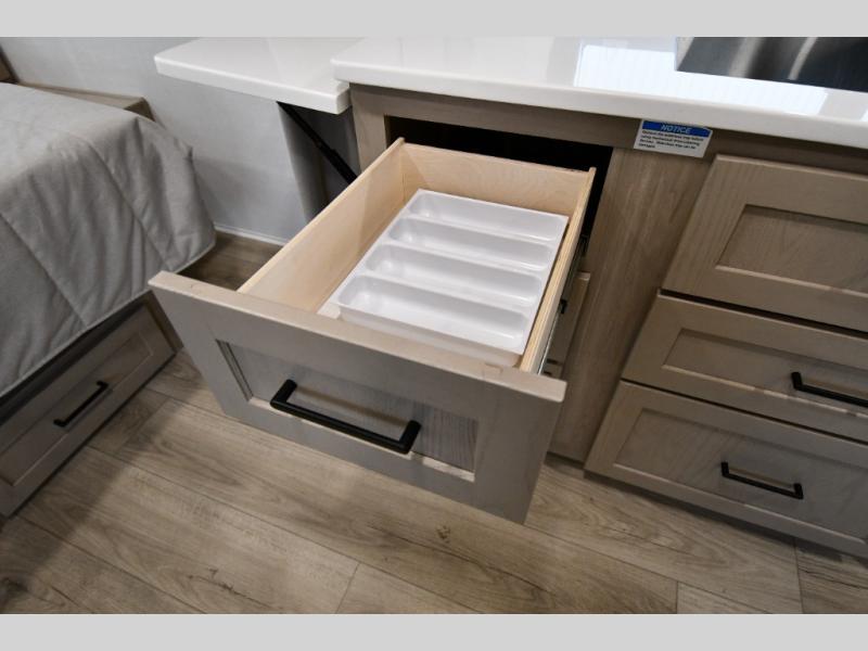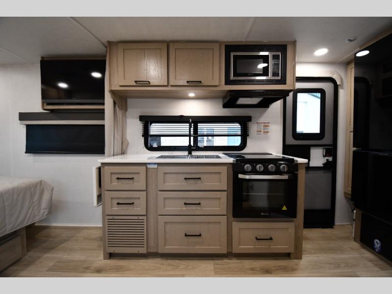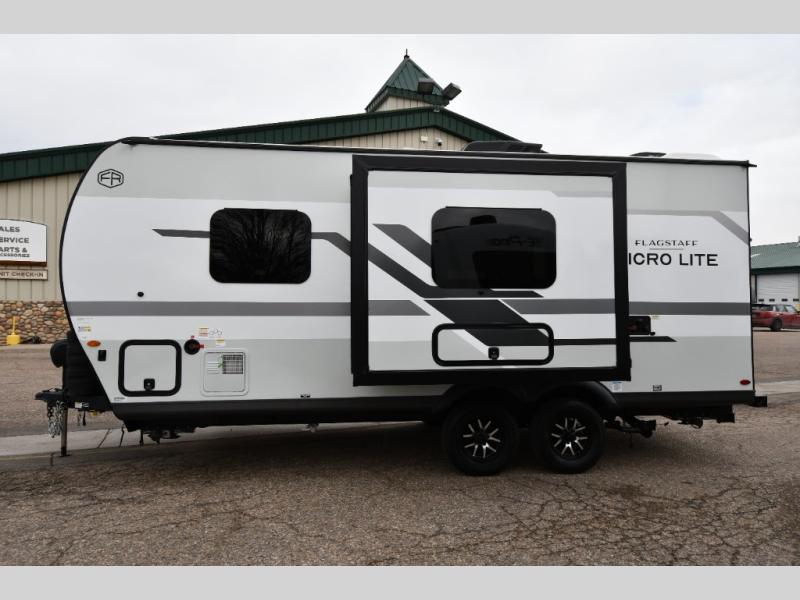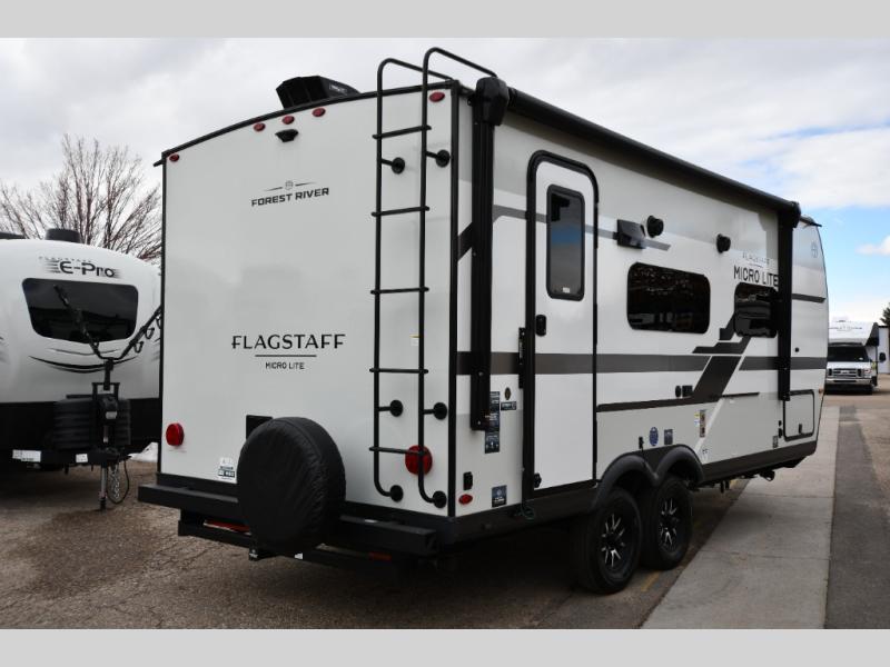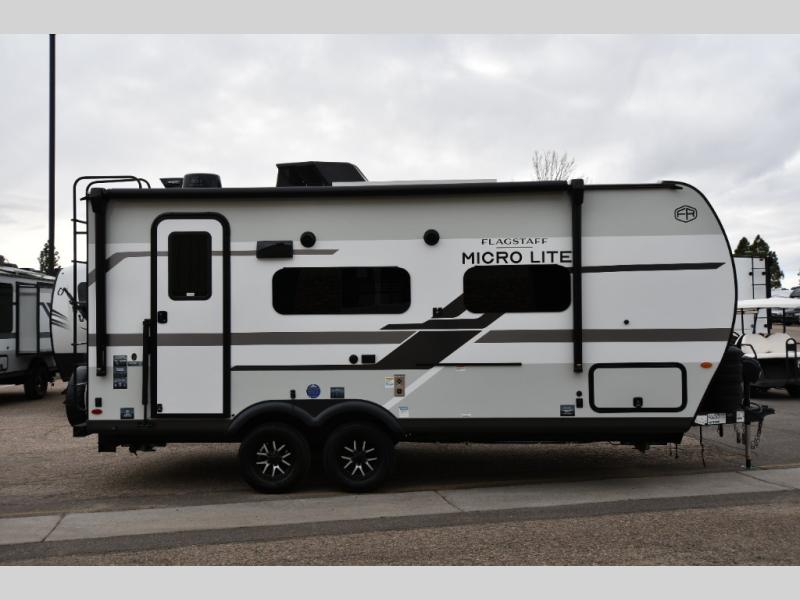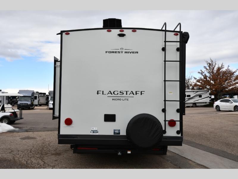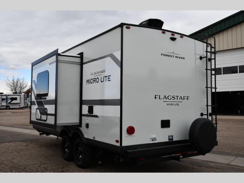 With any Flagstaff Micro Lite travel trailer by Forest River you will enjoy lightweight towing, durable construction, and added interior comforts to make each trip memorable! Each model features RoadTech tire pressure monitoring, Dexter Torflex axles, and nitrogen-filled Goodyear endurance tires for smooth towing from home to campground. The 6-sided aluminum framed construction provides a strong foundation so you can enjoy your RV for years to come, plus the radiant foil in the front cap, underbelly and slides help insulate your trailer. Additional exterior features include a 200W solar panel, back-up camera prep, frameless windows, and slam baggage doors. Each model includes the Great Expectations Package with roller shades, solid surface kitchen countertops, and hidden hinge cabinet doors. There is also an exterior hot/cold water port, outside speakers, a power tongue jack and stabilizer jacks, plus many more conveniences.