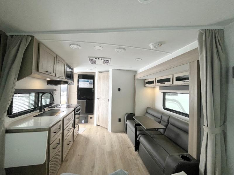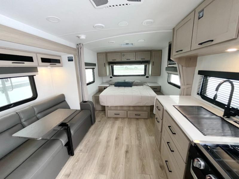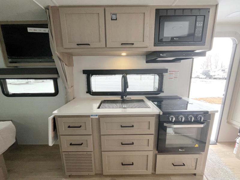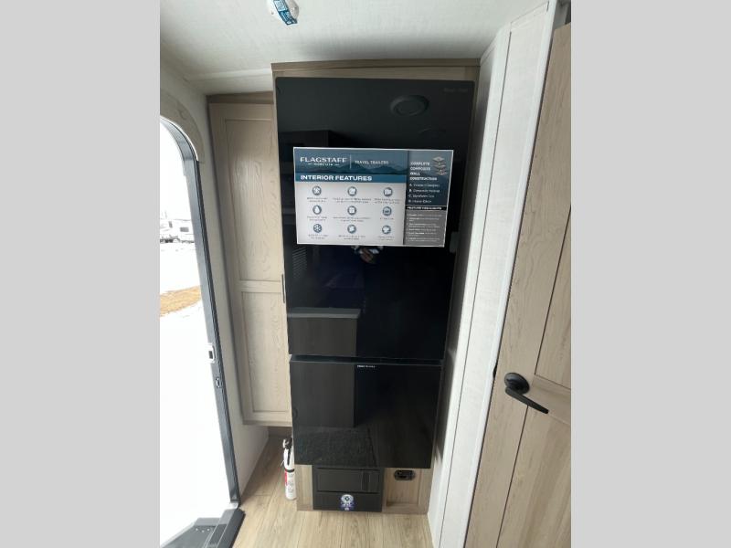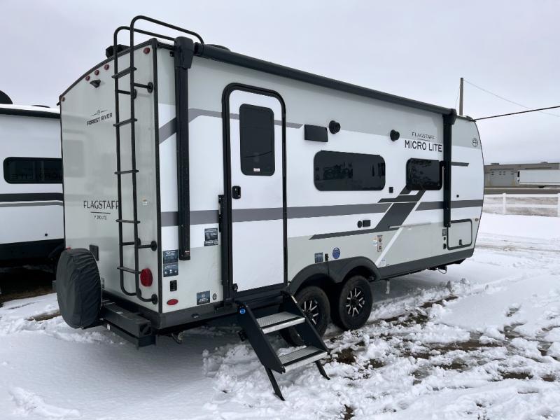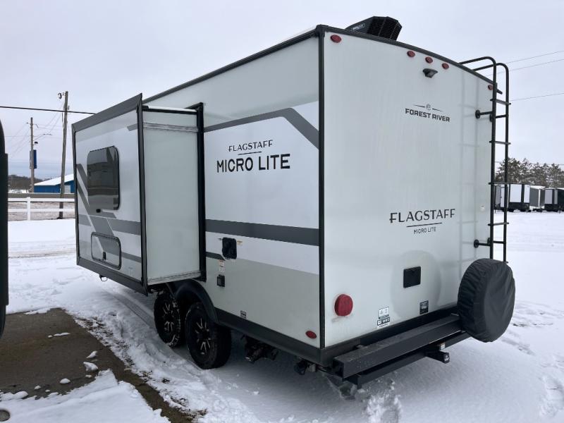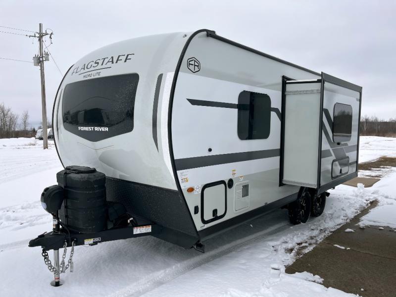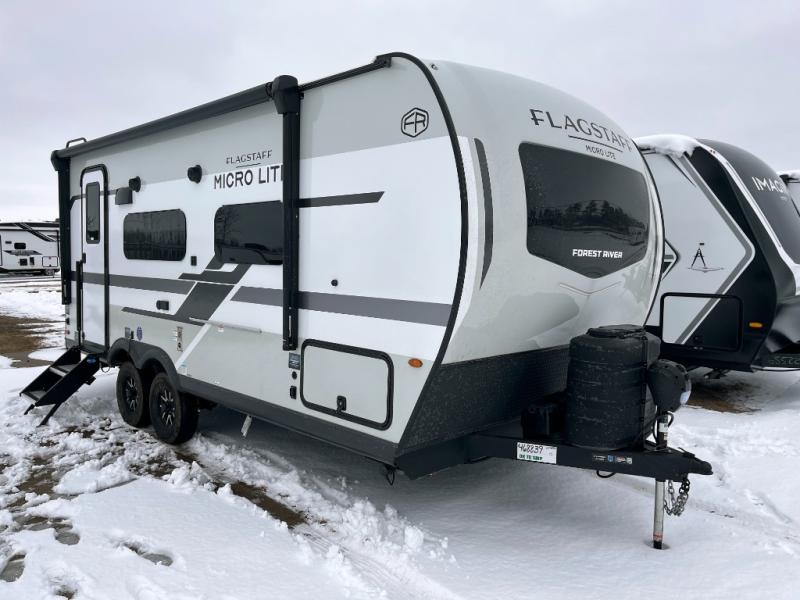 With any Flagstaff Micro Lite travel trailer by Forest River you will enjoy lightweight towing, durable construction, and added interior comforts to make each trip memorable! Each model features RoadTech tire pressure monitoring, Dexter Torflex axles, and nitrogen-filled Goodyear endurance tires for smooth towing from home to campground. The 6-sided aluminum framed construction provides a strong foundation so you can enjoy your RV for years to come, plus the radiant foil in the front cap, underbelly and slides help insulate your trailer. Additional exterior features include a 200W solar panel, back-up camera prep, frameless windows, and slam baggage doors. Each model includes the Great Expectations Package with roller shades, solid surface kitchen countertops, and hidden hinge cabinet doors. There is also an exterior hot/cold water port, outside speakers, a power tongue jack and stabilizer jacks, plus many more conveniences.