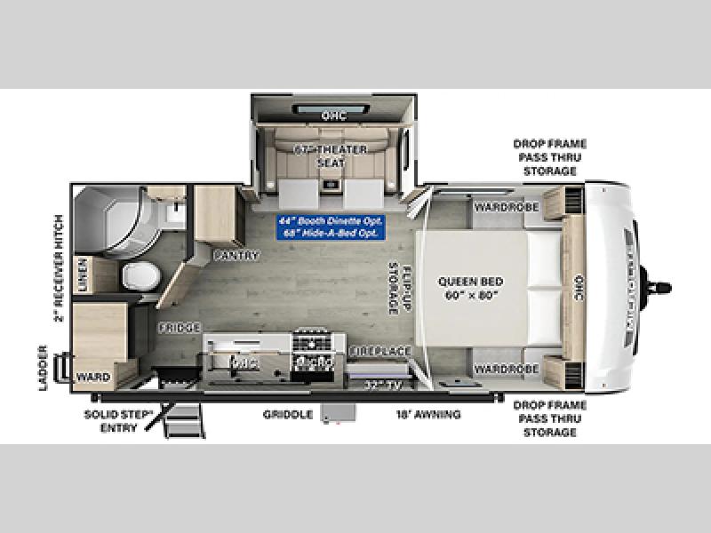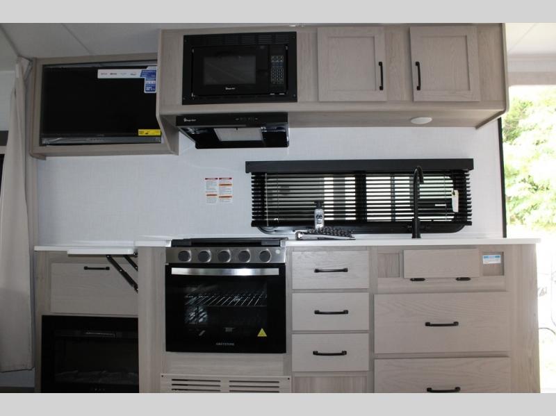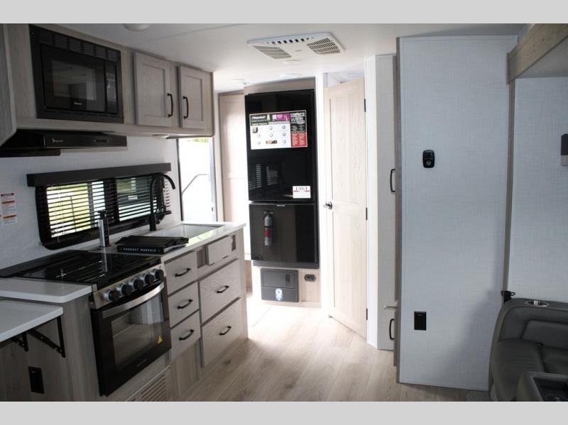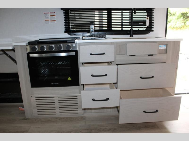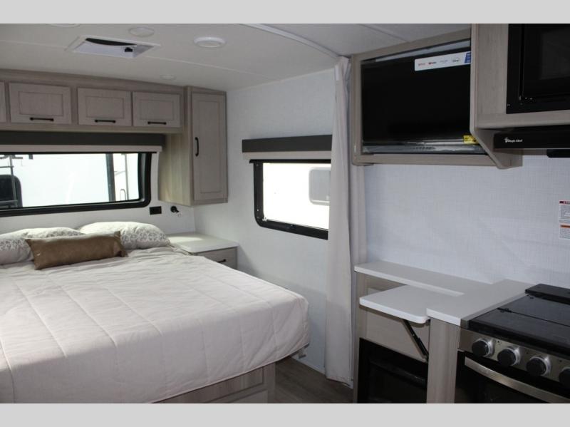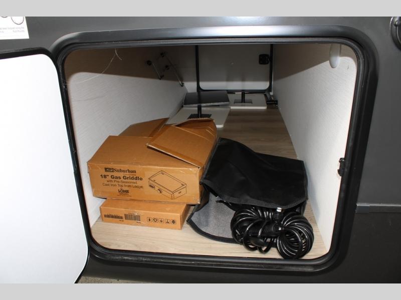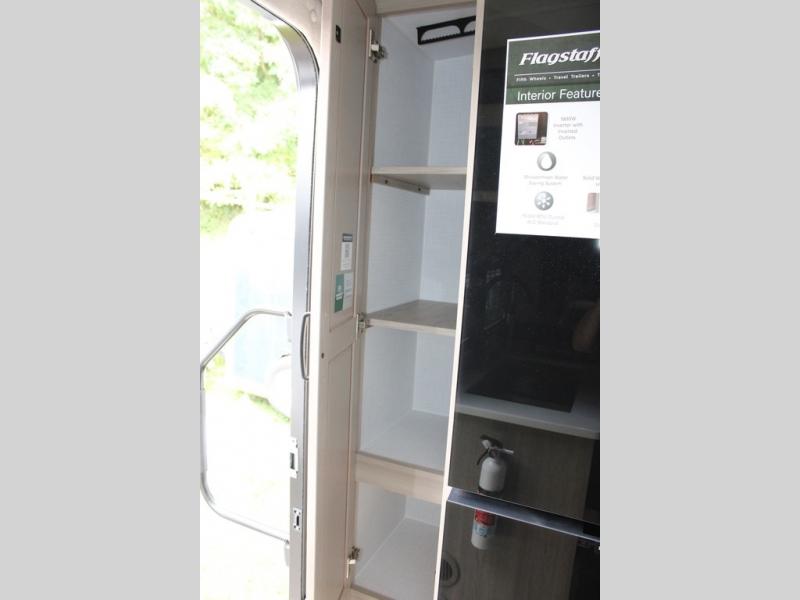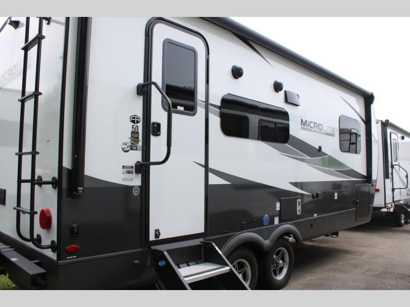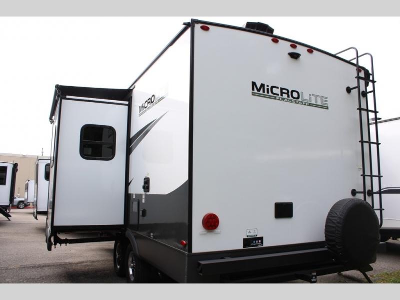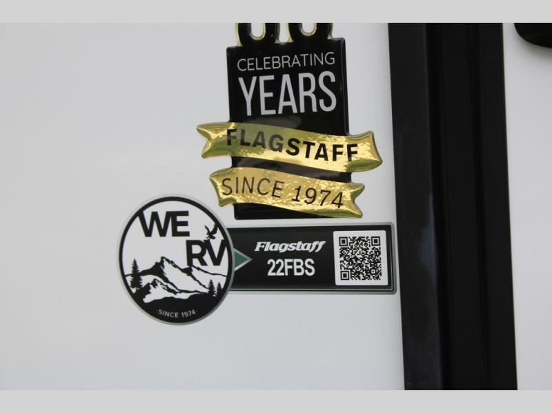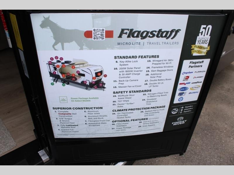With any Flagstaff Micro Lite travel trailer by Forest River you will enjoy lightweight towing, durable construction, and added interior comforts to make each trip memorable! Each model features RoadTech tire pressure monitoring, Dexter Torflex axles, and nitrogen-filled Goodyear endurance tires for smooth towing from home to campground. The 6-sided aluminum framed construction provides a strong foundation so you can enjoy your RV for years to come, plus the radiant foil in the front cap, underbelly and slides help insulate your trailer. Additional exterior features include a 200W solar panel, back-up camera prep, frameless windows, and slam baggage doors. Each model includes the Great Expectations Package with roller shades, solid surface kitchen countertops, and hidden hinge cabinet doors. There is also an exterior hot/cold water port, outside speakers, a power tongue jack and stabilizer jacks, plus many more conveniences.
