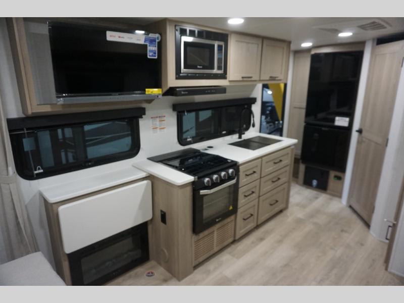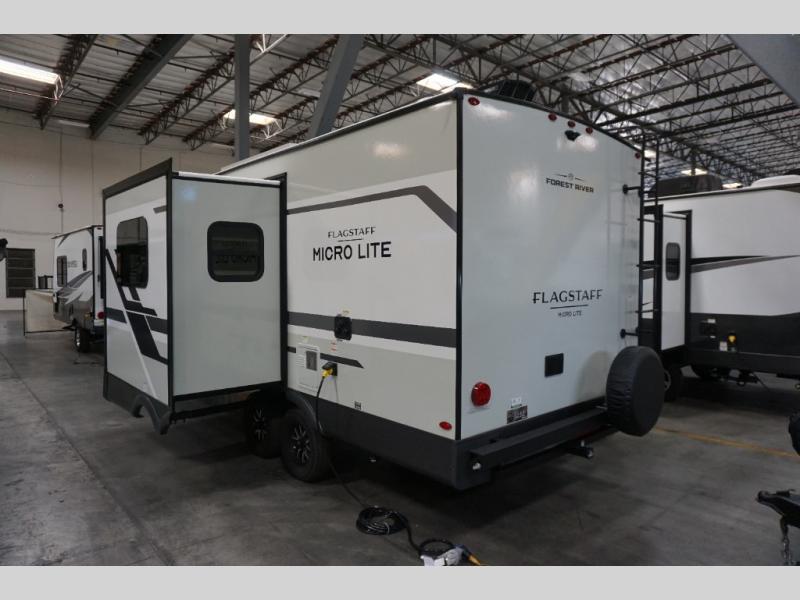 With any Flagstaff Micro Lite travel trailer by Forest River you will enjoy lightweight towing, durable construction, and added interior comforts to make each trip memorable! Each model features a torsion axle, Rubber-Ryde suspension, nitrogen filled, Goodyear Endurance tires, and easy lube axles with Nev-R-Adjust brakes for smooth towing from home to campground. The 6-sided aluminum framed construction provides a strong foundation so you can enjoy your RV for years to come, plus electronically controlled heated holding tanks and an enclosed underbelly will let you camp all year long. Head inside to find hybrid woven flooring in the slide outs, Sedona wood cabinetry, solid surface kitchen countertops, and many more amenities. These travel trailers also include exterior conveniences for hassle-free camping, like the power tongue jack, magnetic compartment door catches, Keyed Alike locks, and rear ladder to name a few!