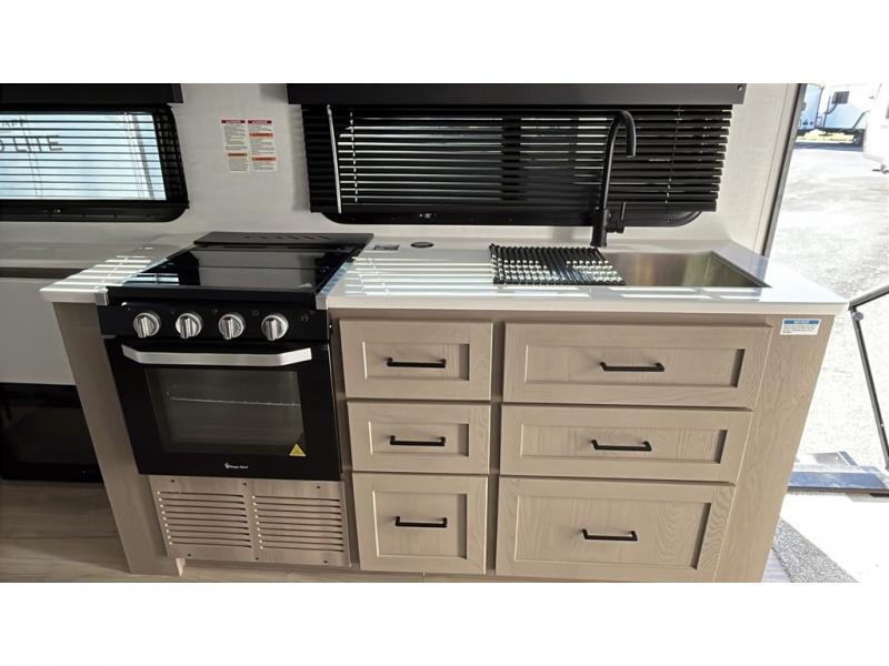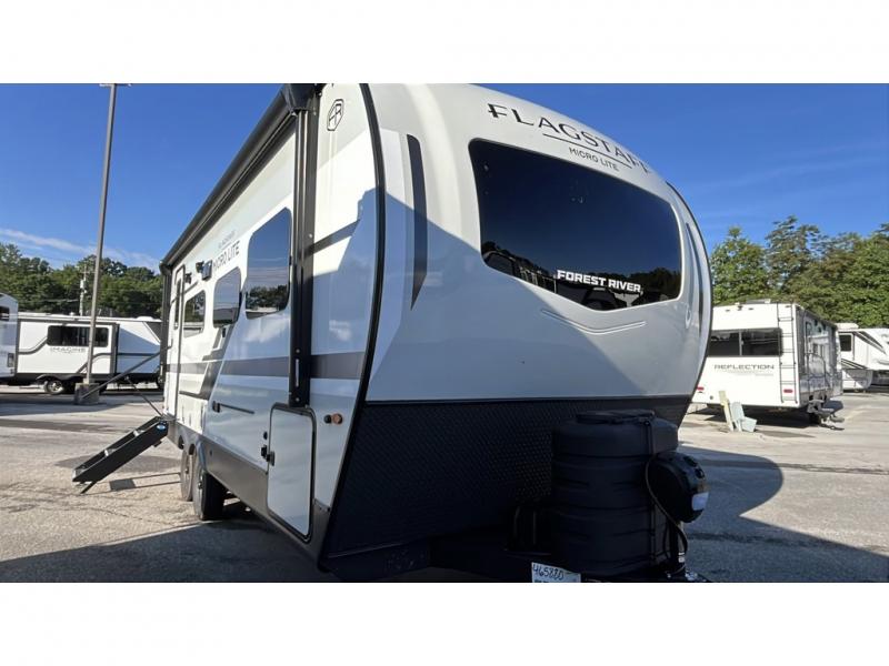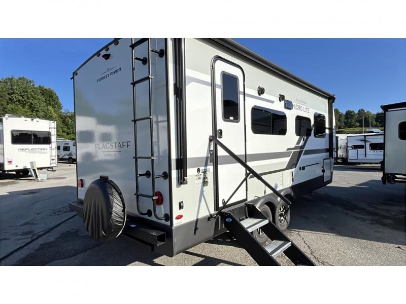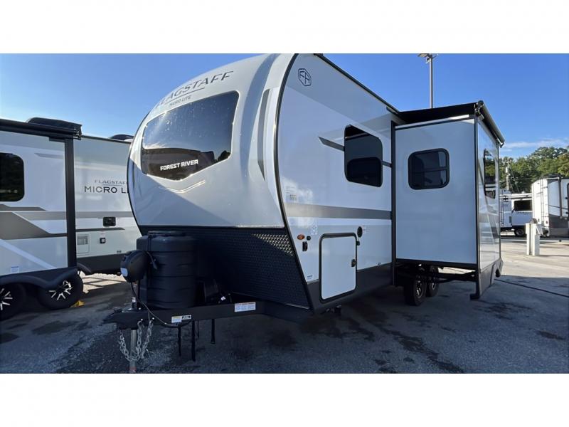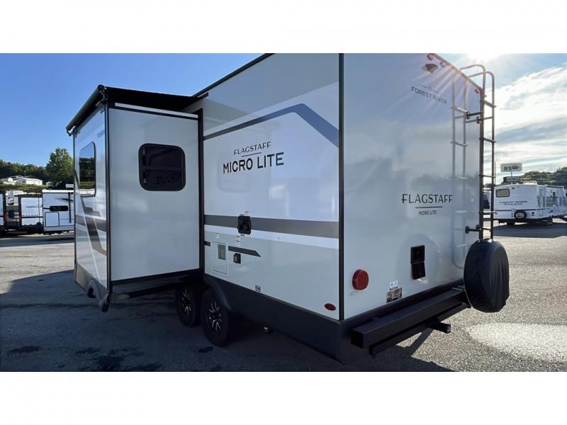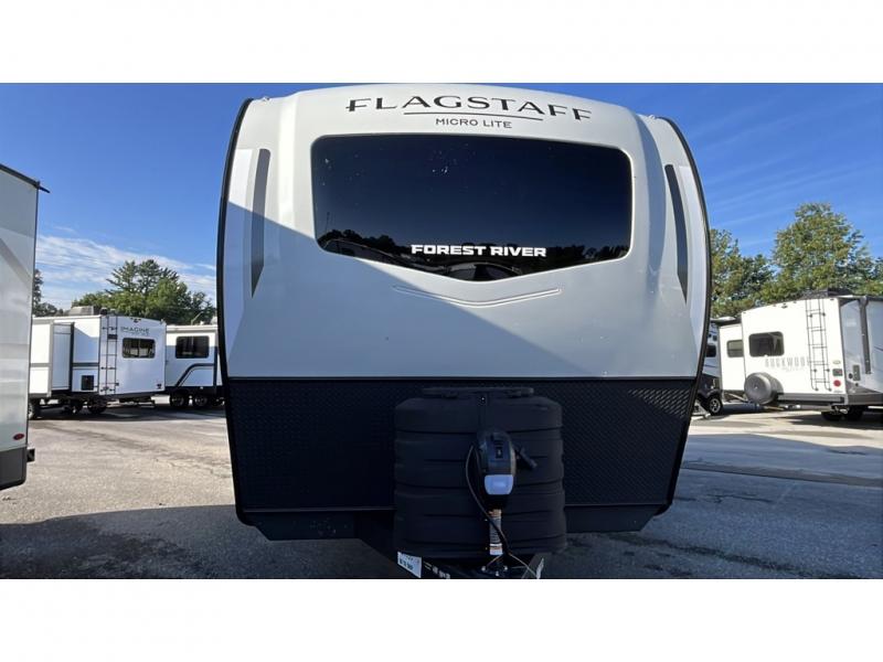 With any Flagstaff Micro Lite travel trailer by Forest River you will enjoy lightweight towing, durable construction, and added interior comforts to make each trip memorable! Each model features RoadTech tire pressure monitoring, Dexter Torflex axles, and nitrogen-filled Goodyear endurance tires for smooth towing from home to campground. The 6-sided aluminum framed construction provides a strong foundation so you can enjoy your RV for years to come, plus the radiant foil in the front cap, underbelly and slides help insulate your trailer. Additional exterior features include a 200W solar panel, back-up camera prep, frameless windows, and slam baggage doors. Each model includes the Great Expectations Package with roller shades, solid surface kitchen countertops, and hidden hinge cabinet doors. There is also an exterior hot/cold water port, outside speakers, a power tongue jack and stabilizer jacks, plus many more conveniences.