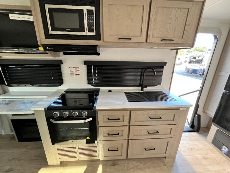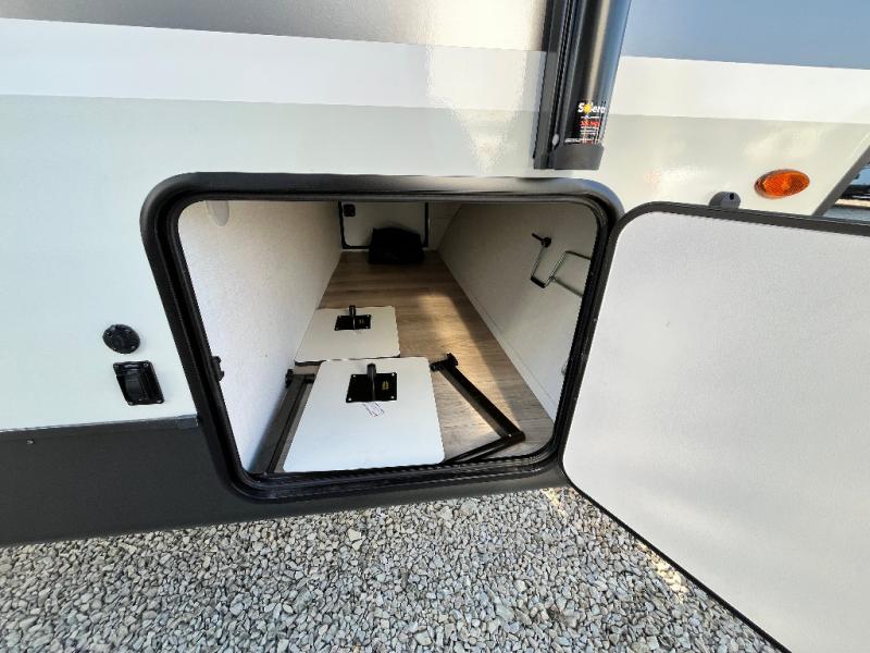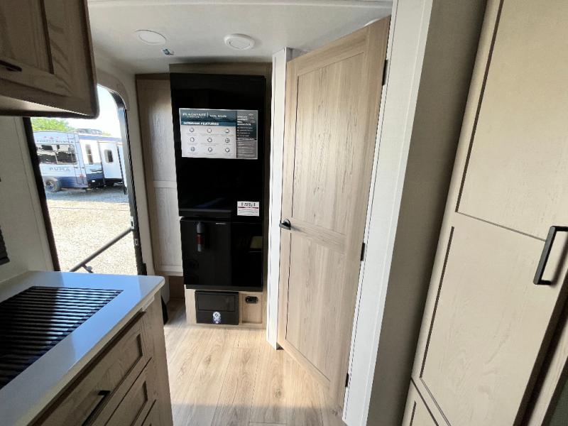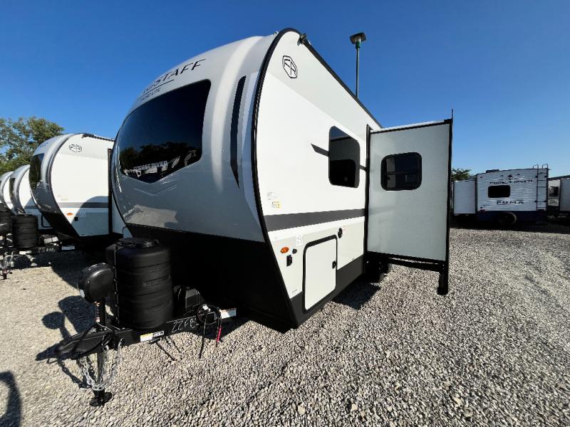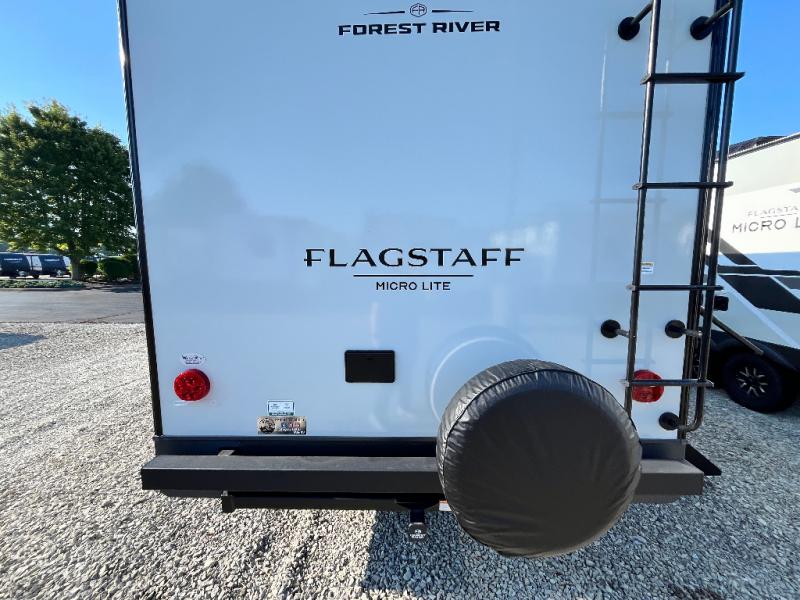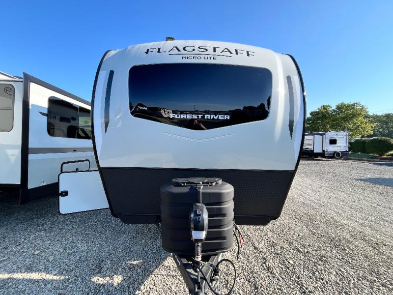 With any Flagstaff Micro Lite travel trailer by Forest River you will enjoy lightweight towing, durable construction, and added interior comforts to make each trip memorable! Each model features RoadTech tire pressure monitoring, Dexter Torflex axles, and nitrogen-filled Goodyear endurance tires for smooth towing from home to campground. The 6-sided aluminum framed construction provides a strong foundation so you can enjoy your RV for years to come, plus the radiant foil in the front cap, underbelly and slides help insulate your trailer. Additional exterior features include a 200W solar panel, back-up camera prep, frameless windows, and slam baggage doors. Each model includes the Great Expectations Package with roller shades, solid surface kitchen countertops, and hidden hinge cabinet doors. There is also an exterior hot/cold water port, outside speakers, a power tongue jack and stabilizer jacks, plus many more conveniences.