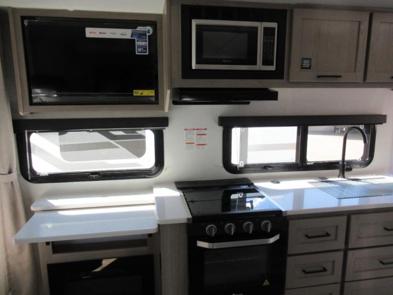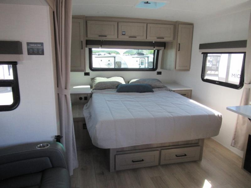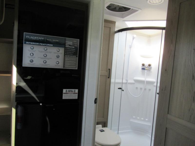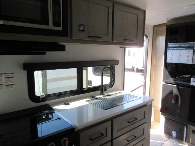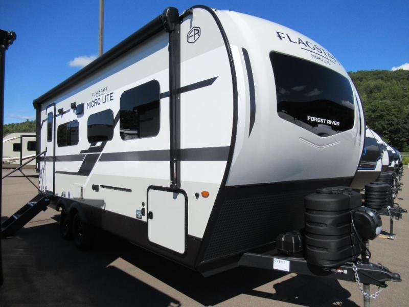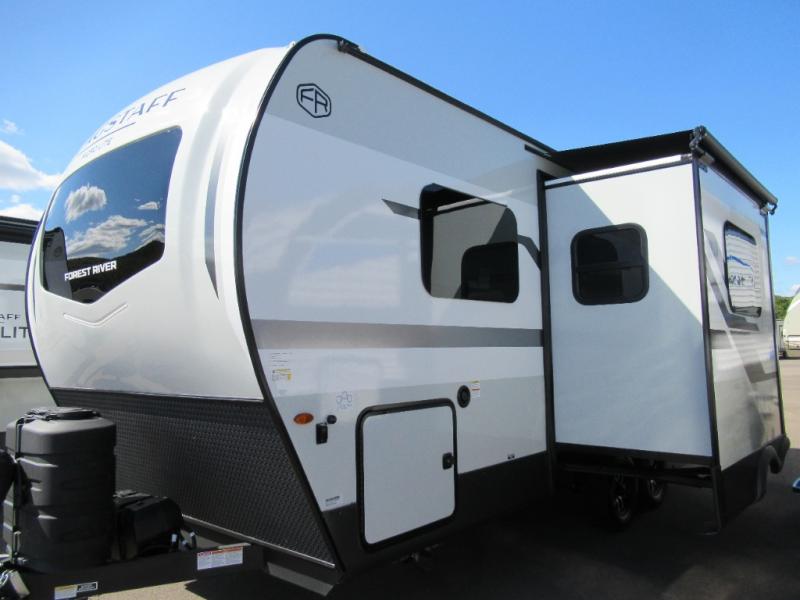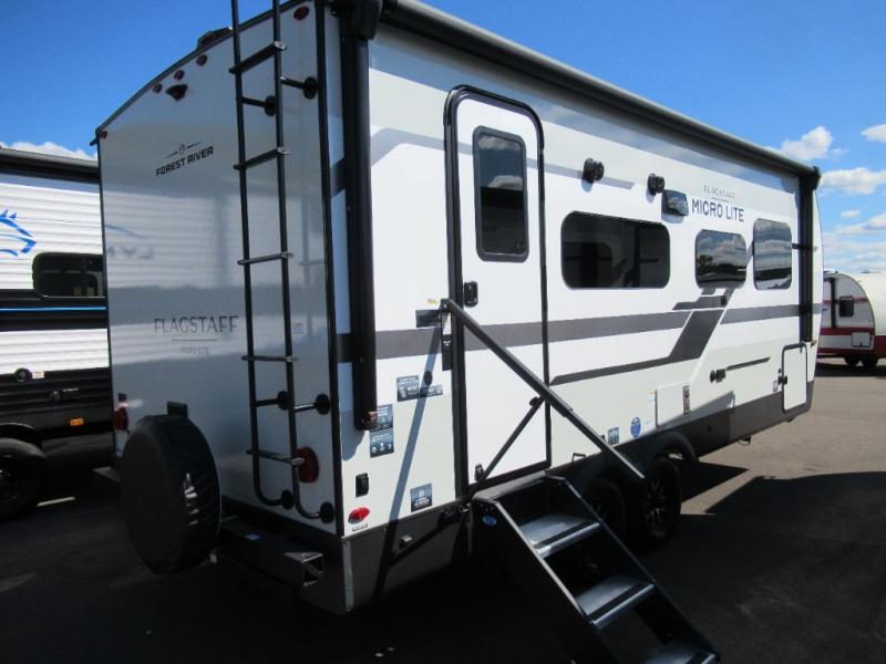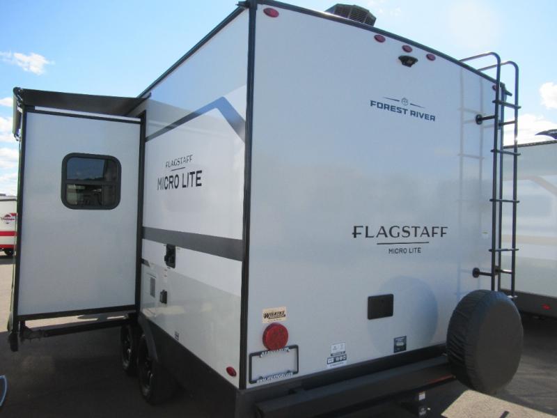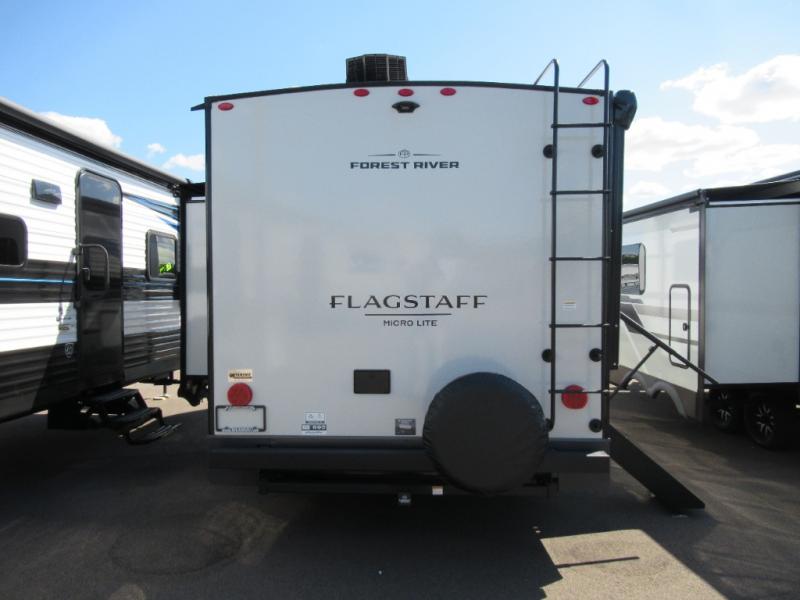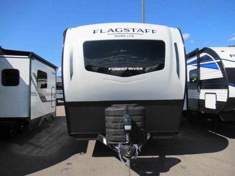 With any Flagstaff Micro Lite travel trailer by Forest River you will enjoy lightweight towing, durable construction, and added interior comforts to make each trip memorable! Each model features RoadTech tire pressure monitoring, Dexter Torflex axles, and nitrogen-filled Goodyear endurance tires for smooth towing from home to campground. The 6-sided aluminum framed construction provides a strong foundation so you can enjoy your RV for years to come, plus the radiant foil in the front cap, underbelly and slides help insulate your trailer. Additional exterior features include a 200W solar panel, back-up camera prep, frameless windows, and slam baggage doors. Each model includes the Great Expectations Package with roller shades, solid surface kitchen countertops, and hidden hinge cabinet doors. There is also an exterior hot/cold water port, outside speakers, a power tongue jack and stabilizer jacks, plus many more conveniences.