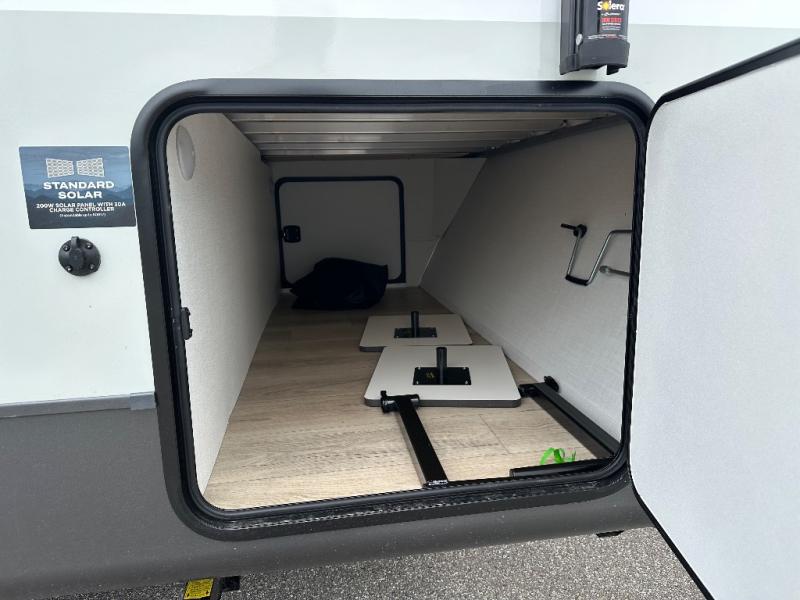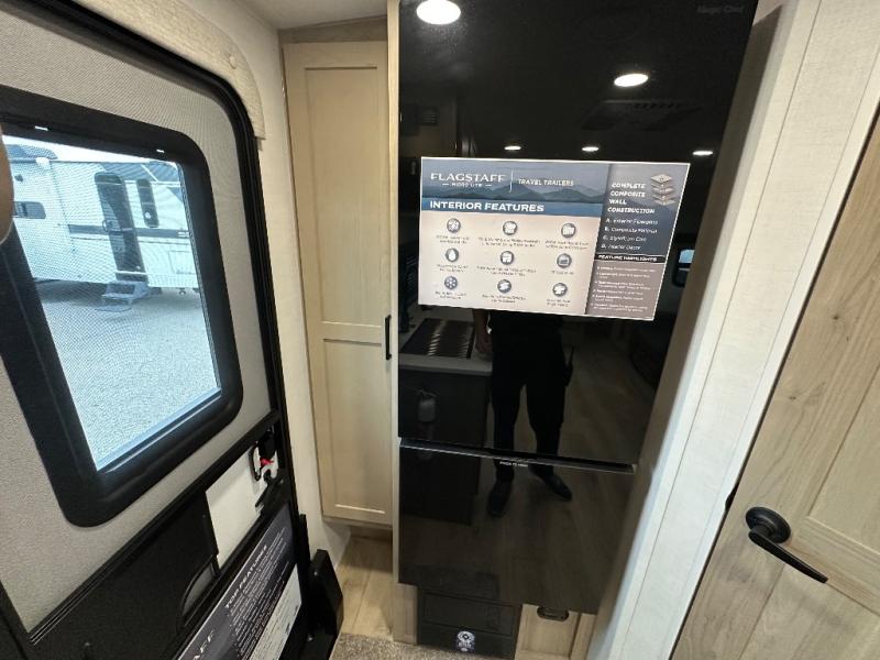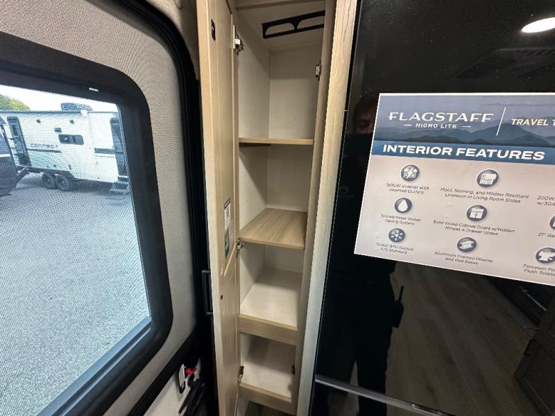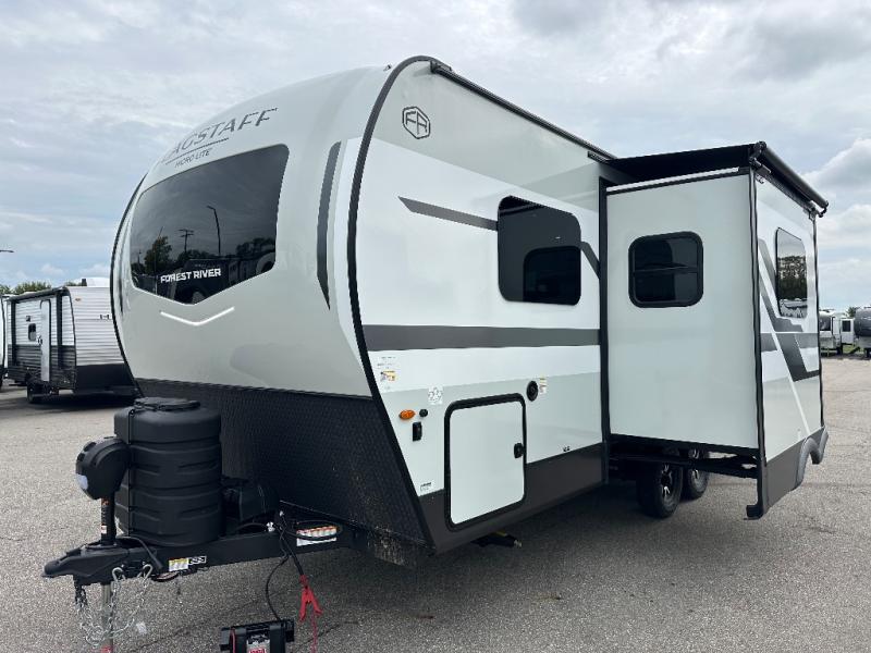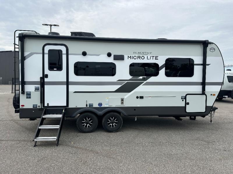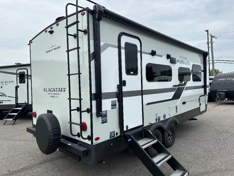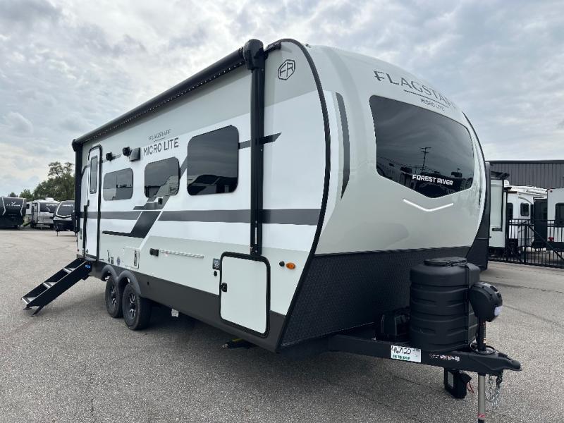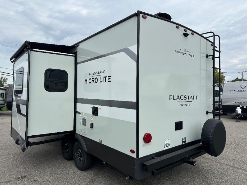 With any Flagstaff Micro Lite travel trailer by Forest River you will enjoy lightweight towing, durable construction, and added interior comforts to make each trip memorable! Each model features RoadTech tire pressure monitoring, Dexter Torflex axles, and nitrogen-filled Goodyear endurance tires for smooth towing from home to campground. The 6-sided aluminum framed construction provides a strong foundation so you can enjoy your RV for years to come, plus the radiant foil in the front cap, underbelly and slides help insulate your trailer. Additional exterior features include a 200W solar panel, back-up camera prep, frameless windows, and slam baggage doors. Each model includes the Great Expectations Package with roller shades, solid surface kitchen countertops, and hidden hinge cabinet doors. There is also an exterior hot/cold water port, outside speakers, a power tongue jack and stabilizer jacks, plus many more conveniences.