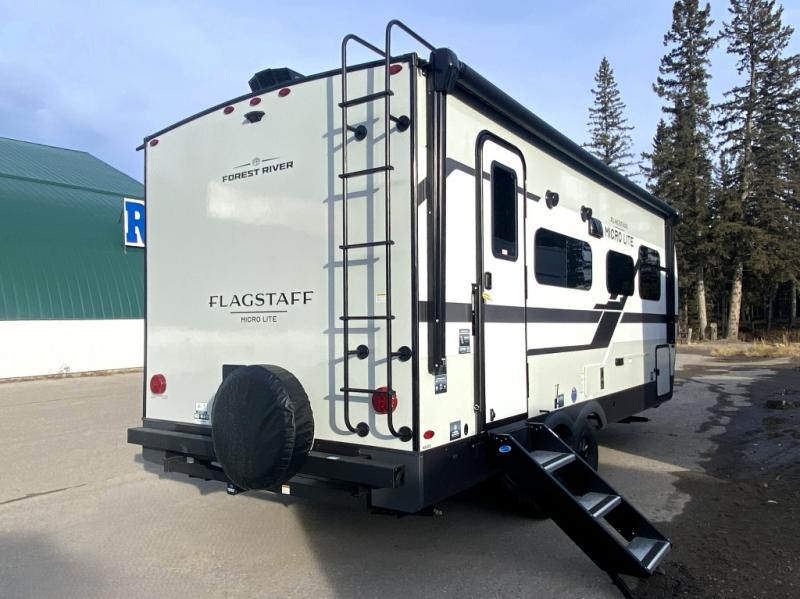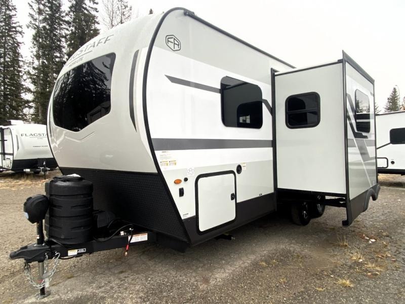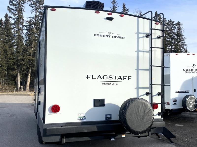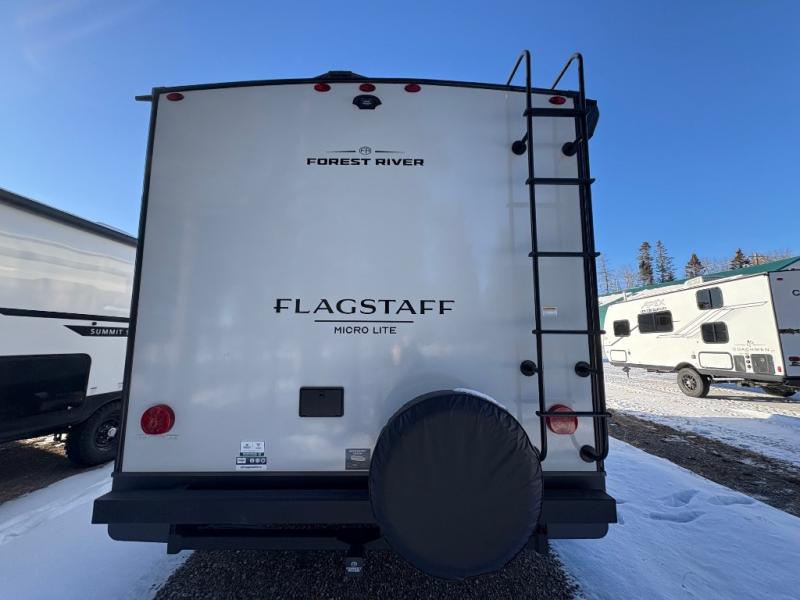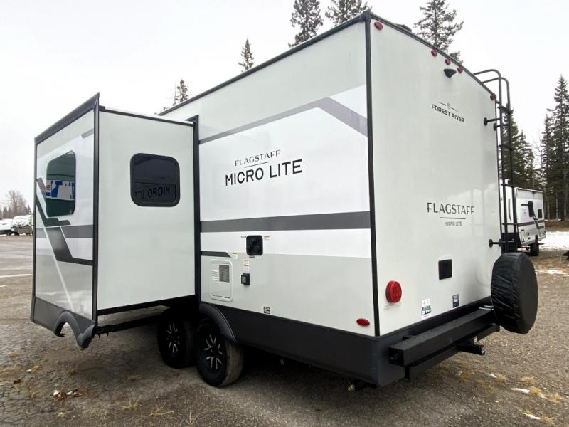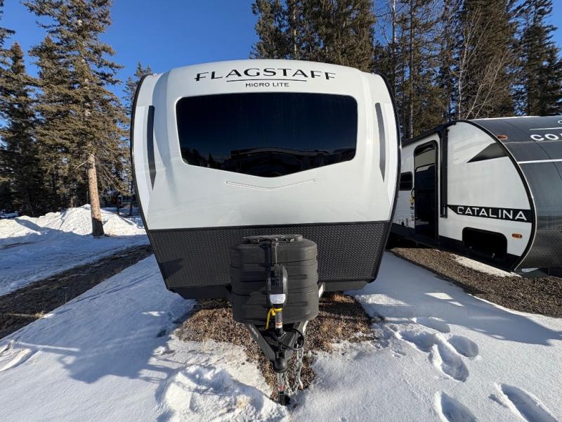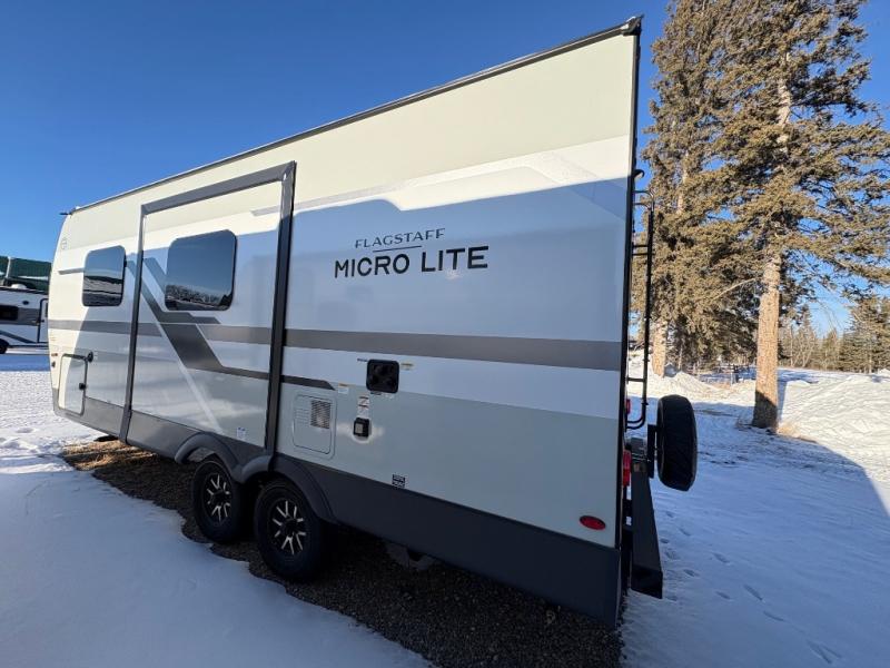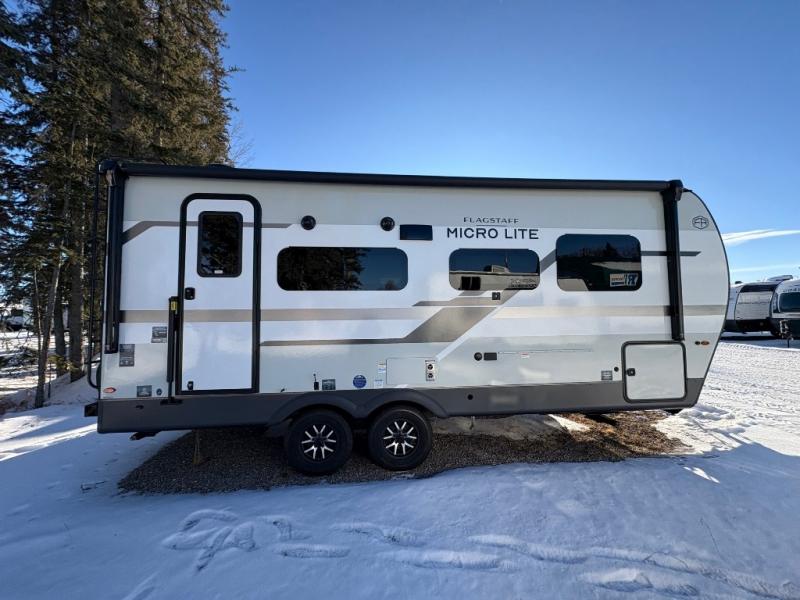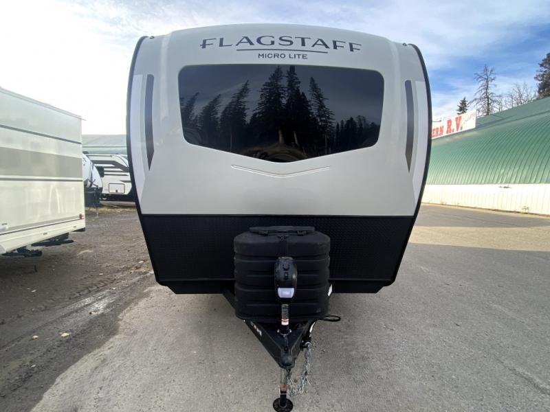 With any Flagstaff Micro Lite travel trailer by Forest River you will enjoy lightweight towing, durable construction, and added interior comforts to make each trip memorable! Each model features RoadTech tire pressure monitoring, Dexter Torflex axles, and nitrogen-filled Goodyear endurance tires for smooth towing from home to campground. The 6-sided aluminum framed construction provides a strong foundation so you can enjoy your RV for years to come, plus the radiant foil in the front cap, underbelly and slides help insulate your trailer. Additional exterior features include a 200W solar panel, back-up camera prep, frameless windows, and slam baggage doors. Each model includes the Great Expectations Package with roller shades, solid surface kitchen countertops, and hidden hinge cabinet doors. There is also an exterior hot/cold water port, outside speakers, a power tongue jack and stabilizer jacks, plus many more conveniences.