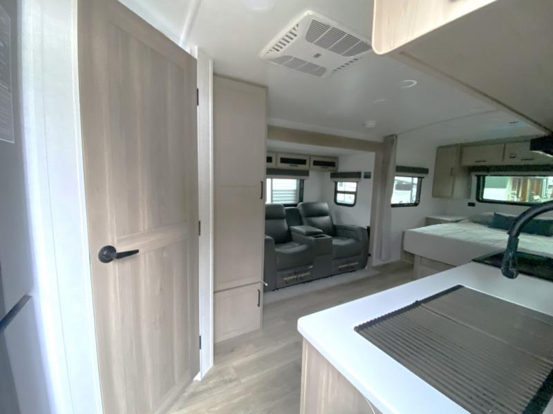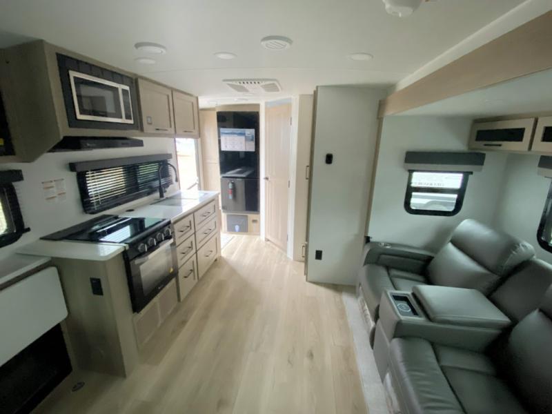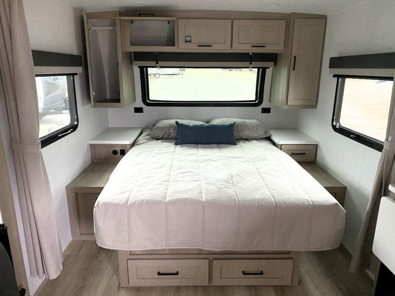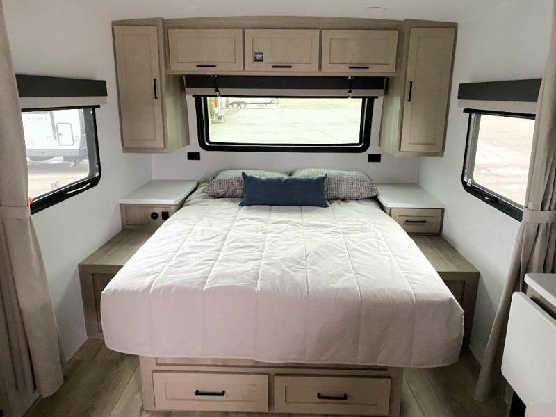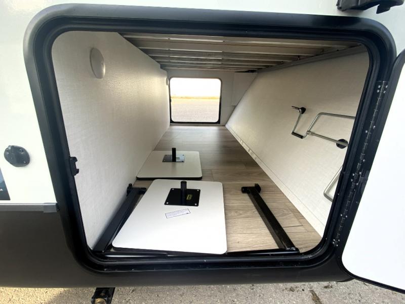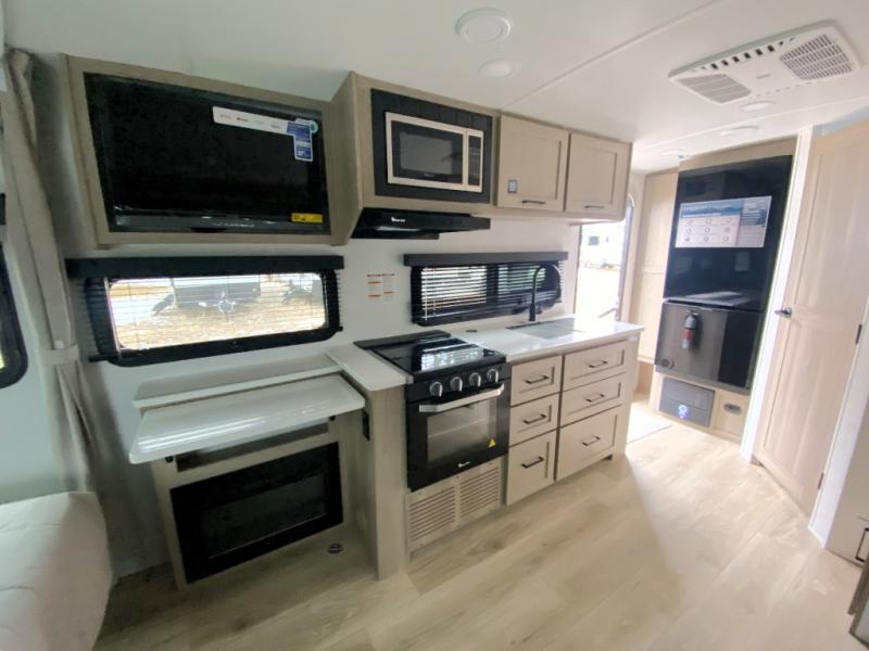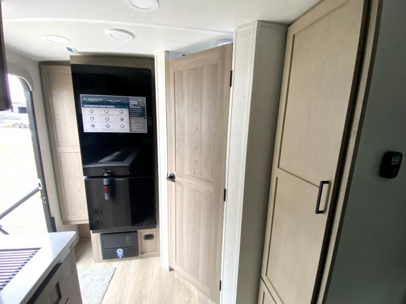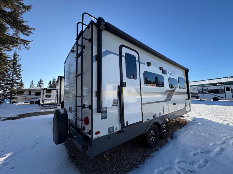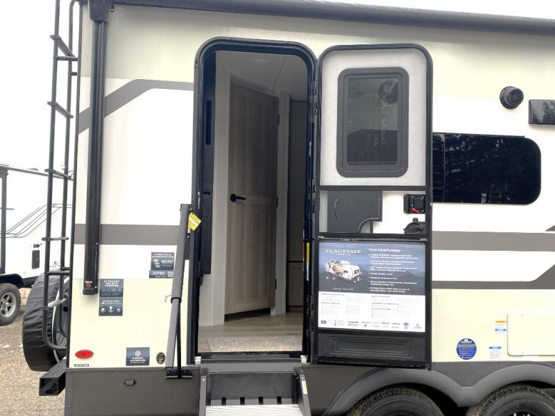 With any Flagstaff Micro Lite travel trailer by Forest River you will enjoy lightweight towing, durable construction, and added interior comforts to make each trip memorable! Each model features RoadTech tire pressure monitoring, Dexter Torflex axles, and nitrogen-filled Goodyear endurance tires for smooth towing from home to campground. The 6-sided aluminum framed construction provides a strong foundation so you can enjoy your RV for years to come, plus the radiant foil in the front cap, underbelly and slides help insulate your trailer. Additional exterior features include a 200W solar panel, back-up camera prep, frameless windows, and slam baggage doors. Each model includes the Great Expectations Package with roller shades, solid surface kitchen countertops, and hidden hinge cabinet doors. There is also an exterior hot/cold water port, outside speakers, a power tongue jack and stabilizer jacks, plus many more conveniences.