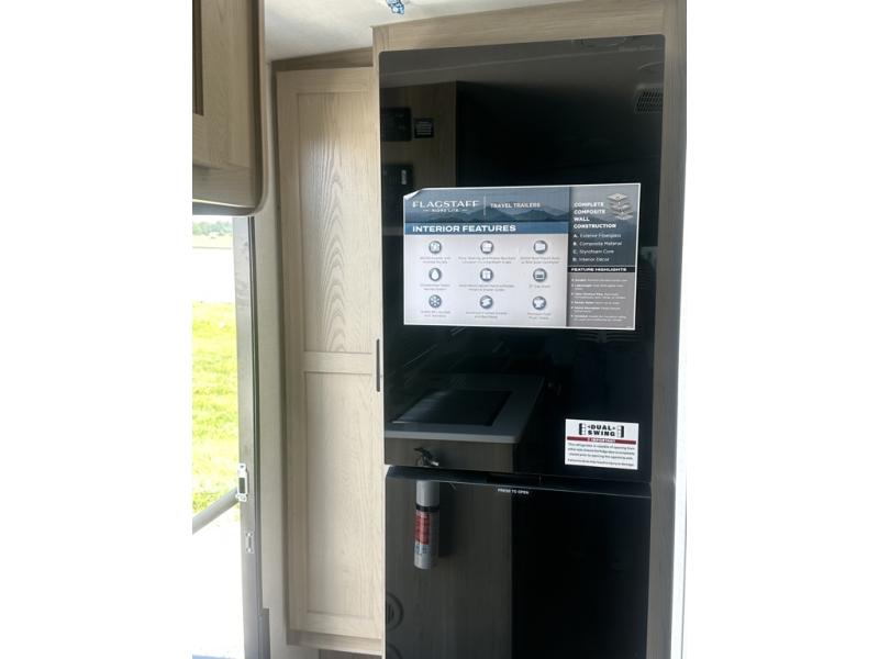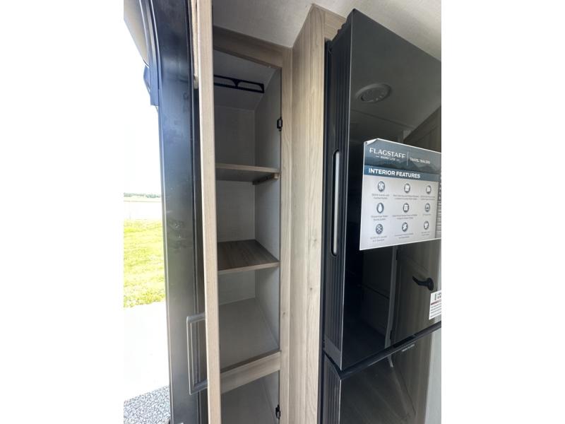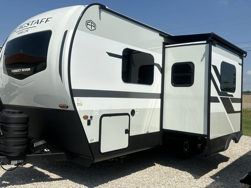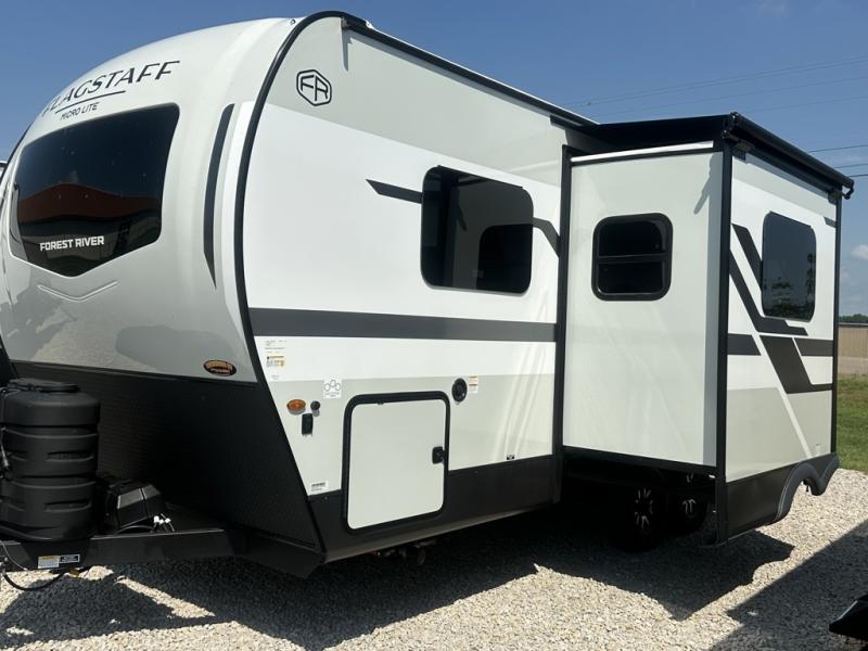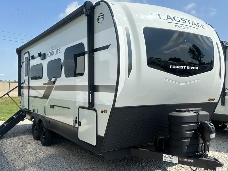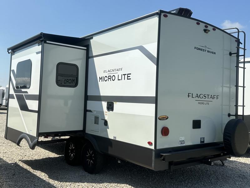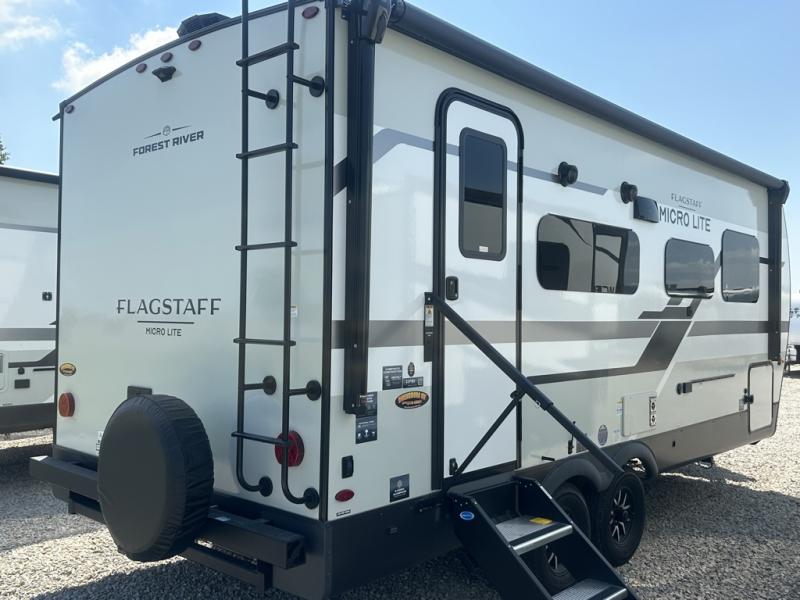 With any Flagstaff Micro Lite travel trailer by Forest River you will enjoy lightweight towing, durable construction, and added interior comforts to make each trip memorable! Each model features RoadTech tire pressure monitoring, Dexter Torflex axles, and nitrogen-filled Goodyear endurance tires for smooth towing from home to campground. The 6-sided aluminum framed construction provides a strong foundation so you can enjoy your RV for years to come, plus the radiant foil in the front cap, underbelly and slides help insulate your trailer. Additional exterior features include a 200W solar panel, back-up camera prep, frameless windows, and slam baggage doors. Each model includes the Great Expectations Package with roller shades, solid surface kitchen countertops, and hidden hinge cabinet doors. There is also an exterior hot/cold water port, outside speakers, a power tongue jack and stabilizer jacks, plus many more conveniences.