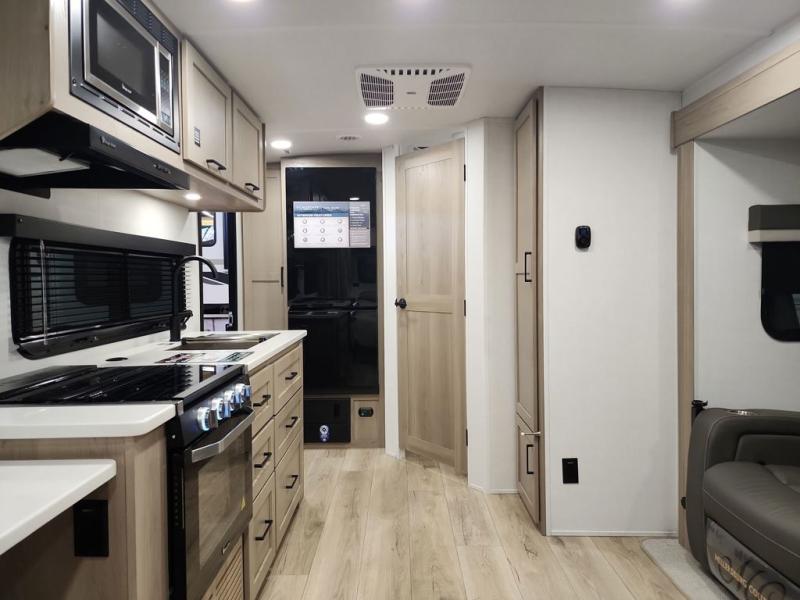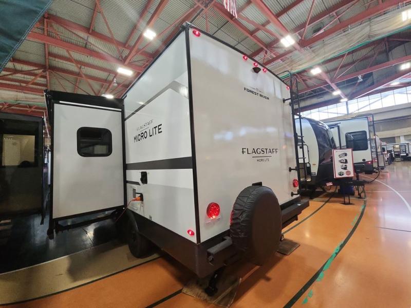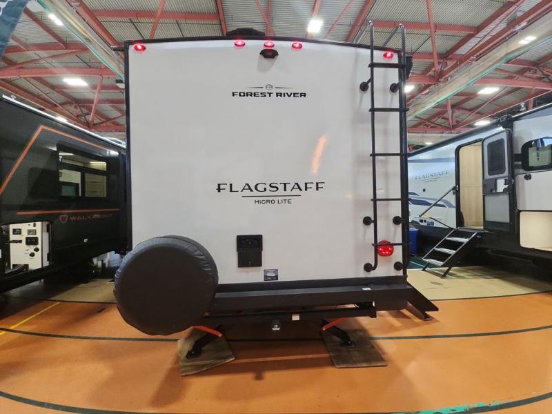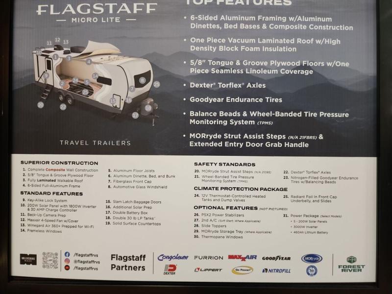 With any Flagstaff Micro Lite travel trailer by Forest River you will enjoy lightweight towing, durable construction, and added interior comforts to make each trip memorable! Each model features RoadTech tire pressure monitoring, Dexter Torflex axles, and nitrogen-filled Goodyear endurance tires for smooth towing from home to campground. The 6-sided aluminum framed construction provides a strong foundation so you can enjoy your RV for years to come, plus the radiant foil in the front cap, underbelly and slides help insulate your trailer. Additional exterior features include a 200W solar panel, back-up camera prep, frameless windows, and slam baggage doors. Each model includes the Great Expectations Package with roller shades, solid surface kitchen countertops, and hidden hinge cabinet doors. There is also an exterior hot/cold water port, outside speakers, a power tongue jack and stabilizer jacks, plus many more conveniences.