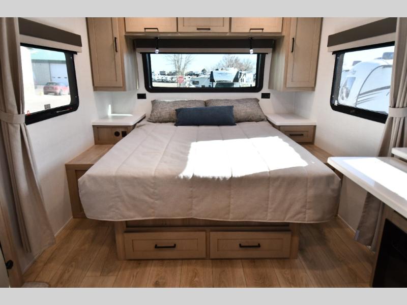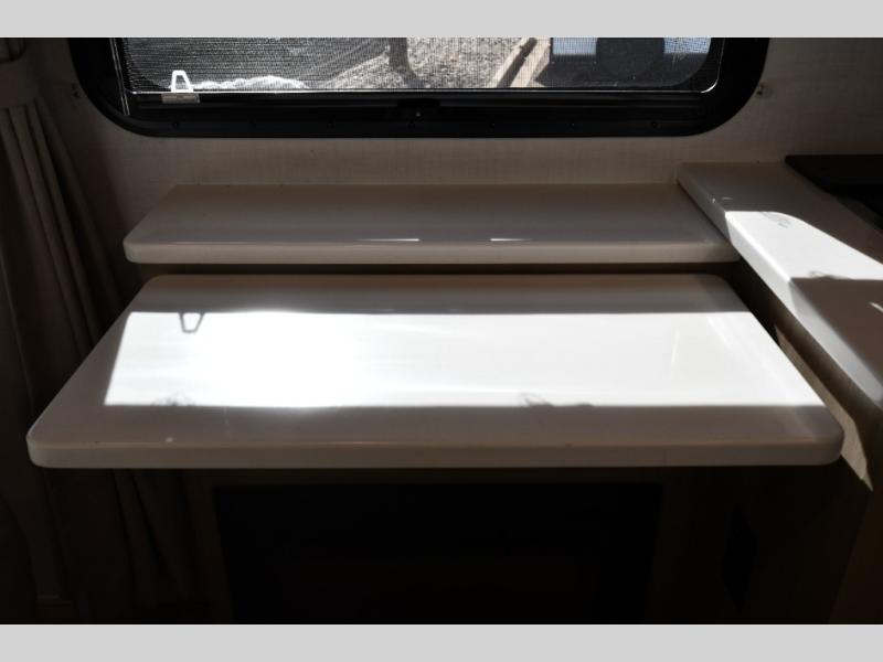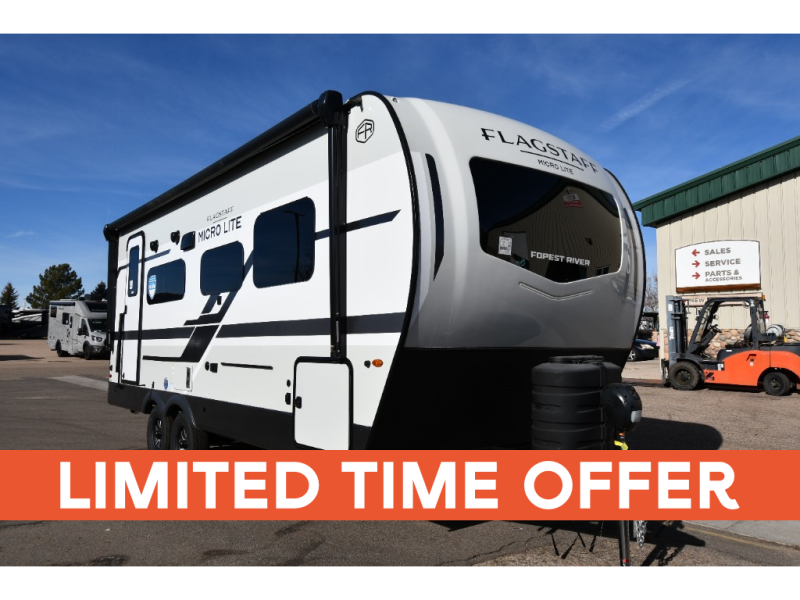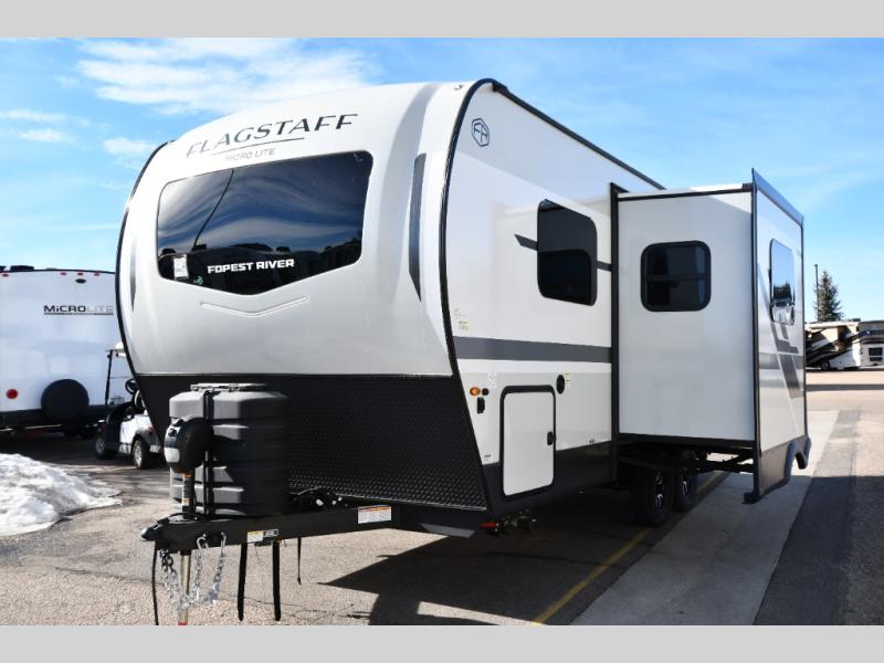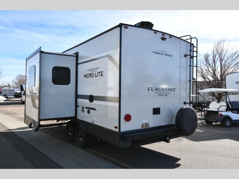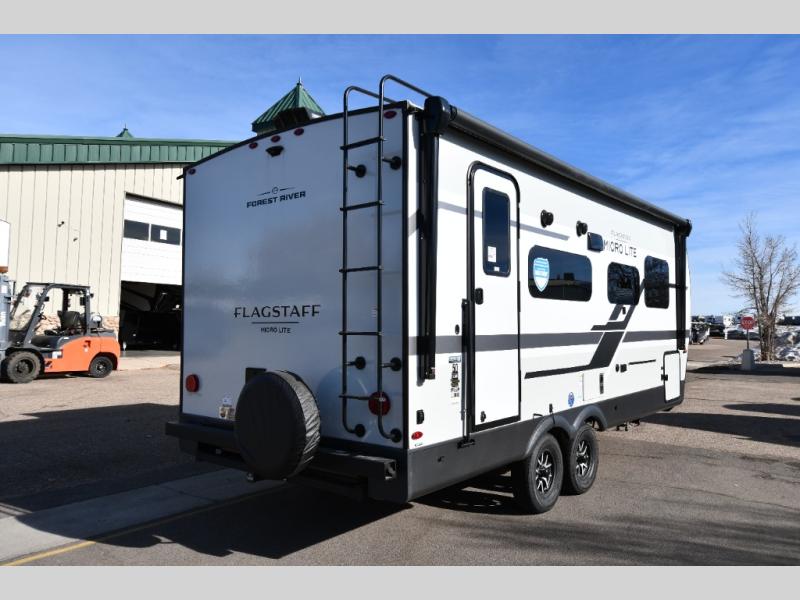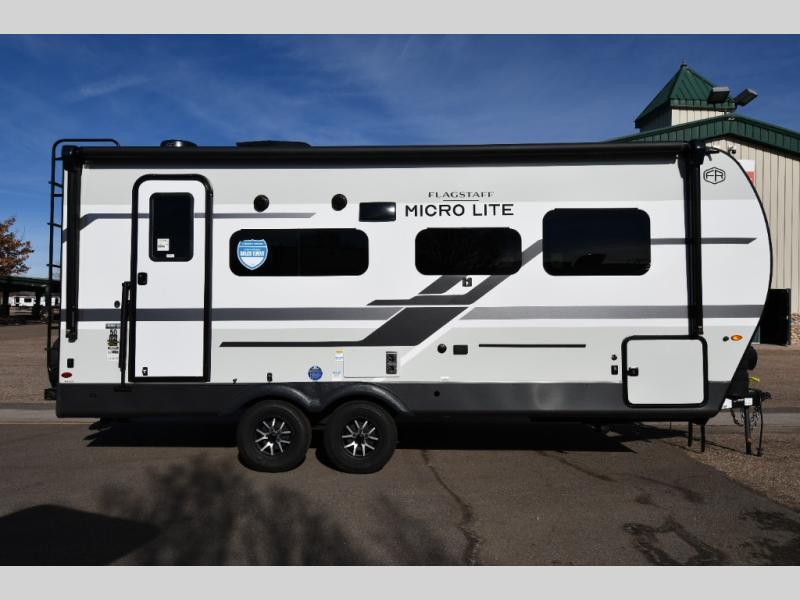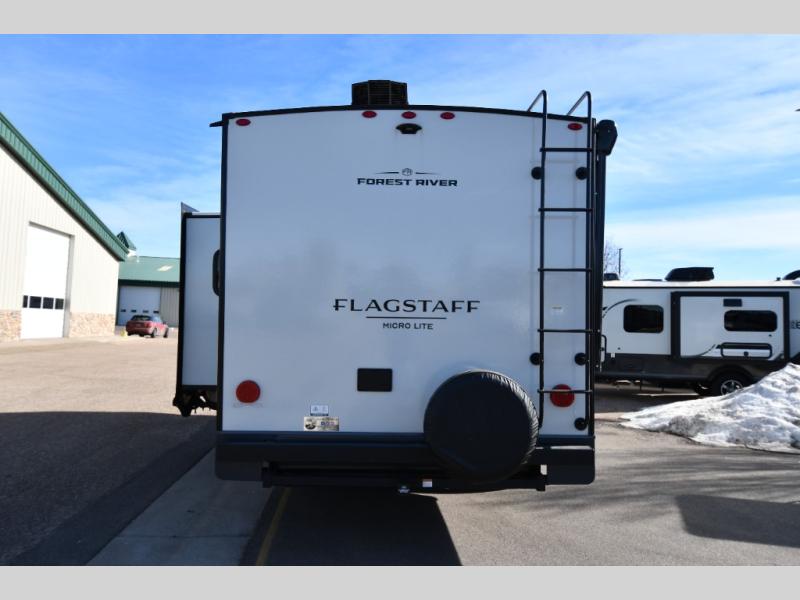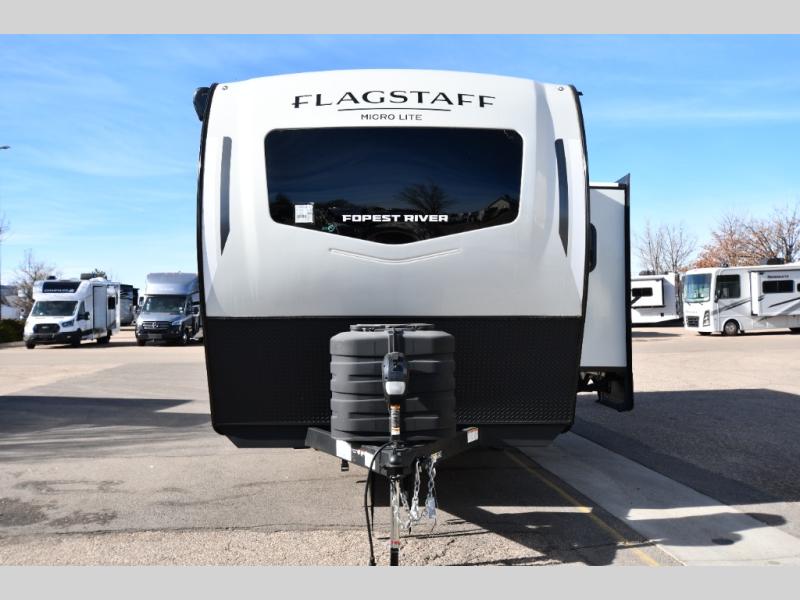 With any Flagstaff Micro Lite travel trailer by Forest River you will enjoy lightweight towing, durable construction, and added interior comforts to make each trip memorable! Each model features RoadTech tire pressure monitoring, Dexter Torflex axles, and nitrogen-filled Goodyear endurance tires for smooth towing from home to campground. The 6-sided aluminum framed construction provides a strong foundation so you can enjoy your RV for years to come, plus the radiant foil in the front cap, underbelly and slides help insulate your trailer. Additional exterior features include a 200W solar panel, back-up camera prep, frameless windows, and slam baggage doors. Each model includes the Great Expectations Package with roller shades, solid surface kitchen countertops, and hidden hinge cabinet doors. There is also an exterior hot/cold water port, outside speakers, a power tongue jack and stabilizer jacks, plus many more conveniences.