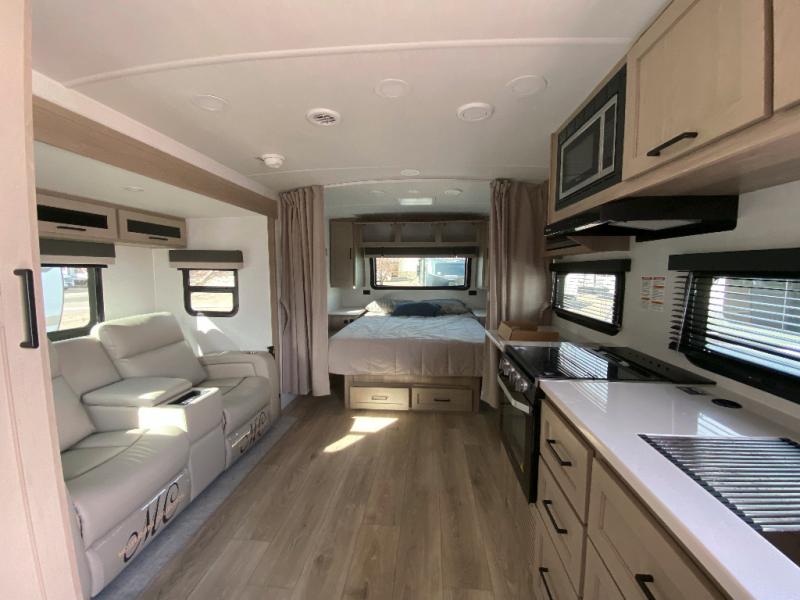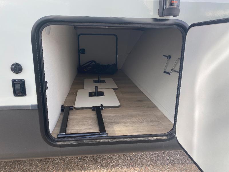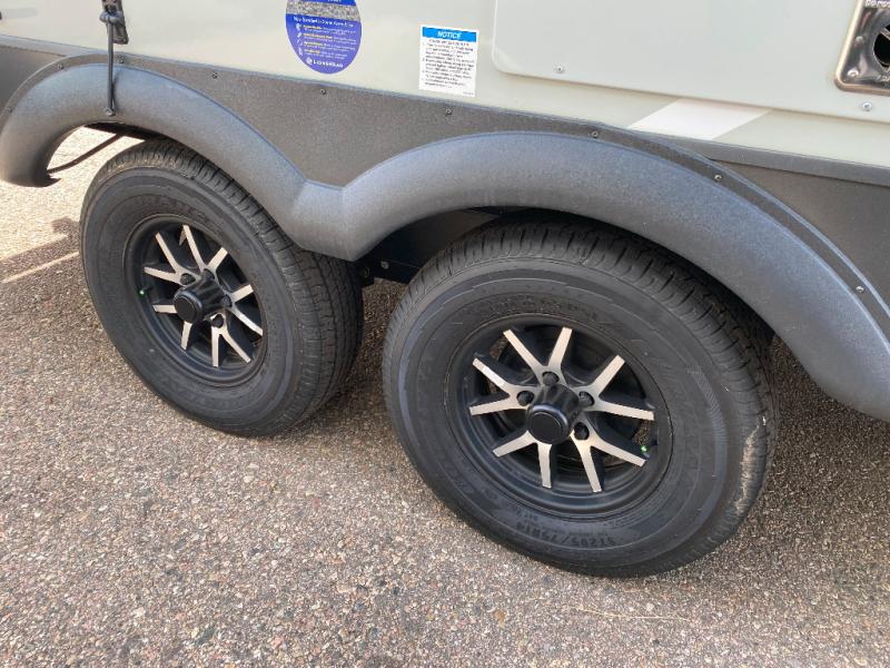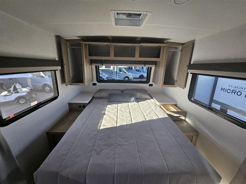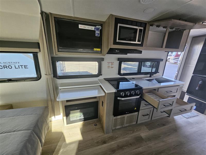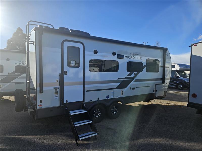 With any Flagstaff Micro Lite travel trailer by Forest River you will enjoy lightweight towing, durable construction, and added interior comforts to make each trip memorable! Each model features RoadTech tire pressure monitoring, Dexter Torflex axles, and nitrogen-filled Goodyear endurance tires for smooth towing from home to campground. The 6-sided aluminum framed construction provides a strong foundation so you can enjoy your RV for years to come, plus the radiant foil in the front cap, underbelly and slides help insulate your trailer. Additional exterior features include a 200W solar panel, back-up camera prep, frameless windows, and slam baggage doors. Each model includes the Great Expectations Package with roller shades, solid surface kitchen countertops, and hidden hinge cabinet doors. There is also an exterior hot/cold water port, outside speakers, a power tongue jack and stabilizer jacks, plus many more conveniences.