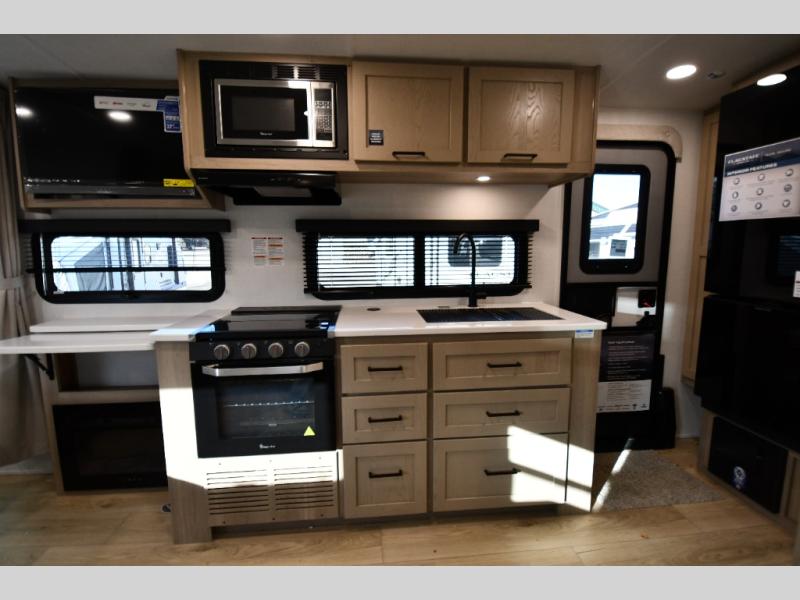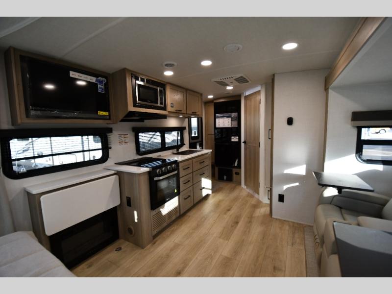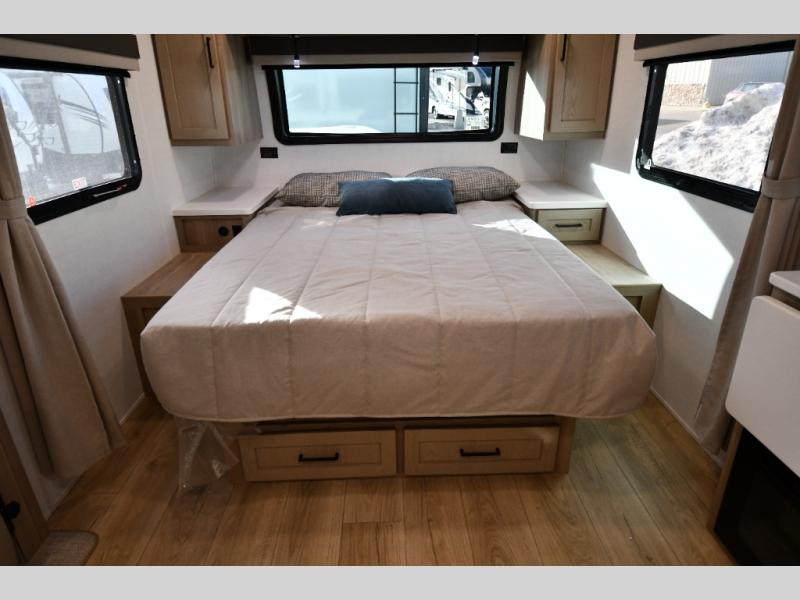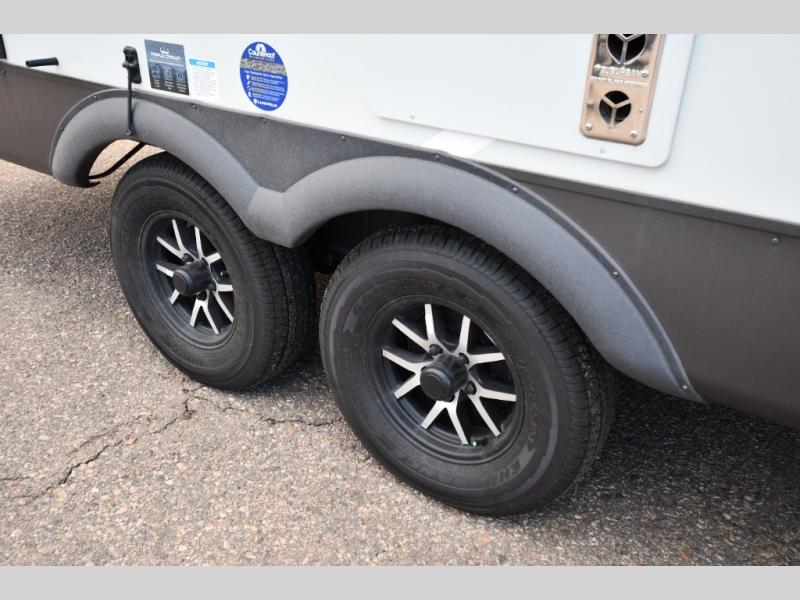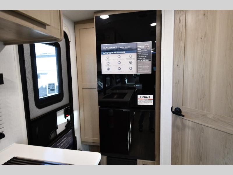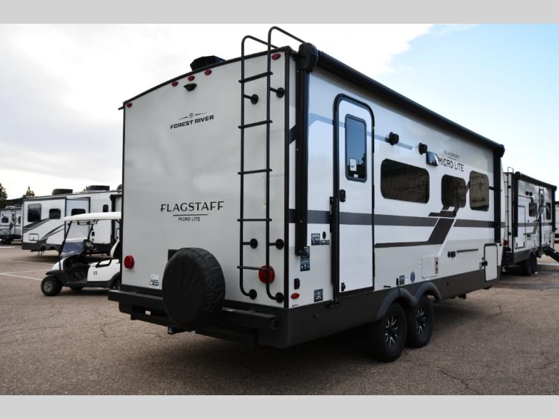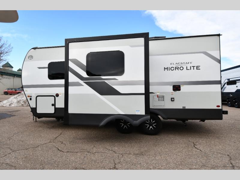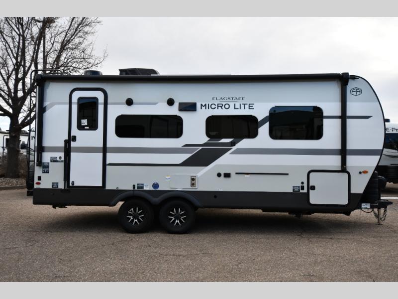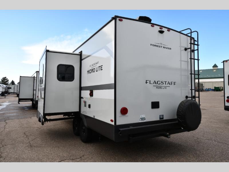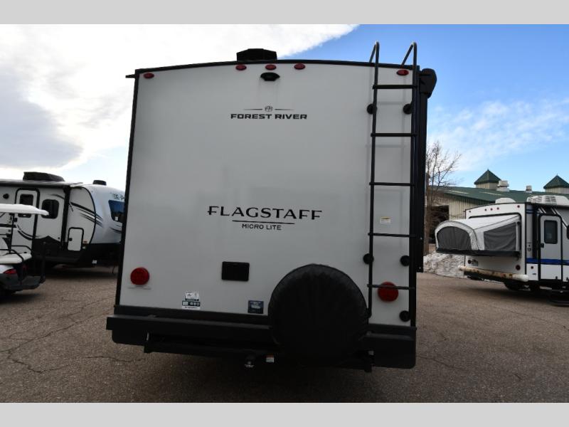 With any Flagstaff Micro Lite travel trailer by Forest River you will enjoy lightweight towing, durable construction, and added interior comforts to make each trip memorable! Each model features RoadTech tire pressure monitoring, Dexter Torflex axles, and nitrogen-filled Goodyear endurance tires for smooth towing from home to campground. The 6-sided aluminum framed construction provides a strong foundation so you can enjoy your RV for years to come, plus the radiant foil in the front cap, underbelly and slides help insulate your trailer. Additional exterior features include a 200W solar panel, back-up camera prep, frameless windows, and slam baggage doors. Each model includes the Great Expectations Package with roller shades, solid surface kitchen countertops, and hidden hinge cabinet doors. There is also an exterior hot/cold water port, outside speakers, a power tongue jack and stabilizer jacks, plus many more conveniences.
