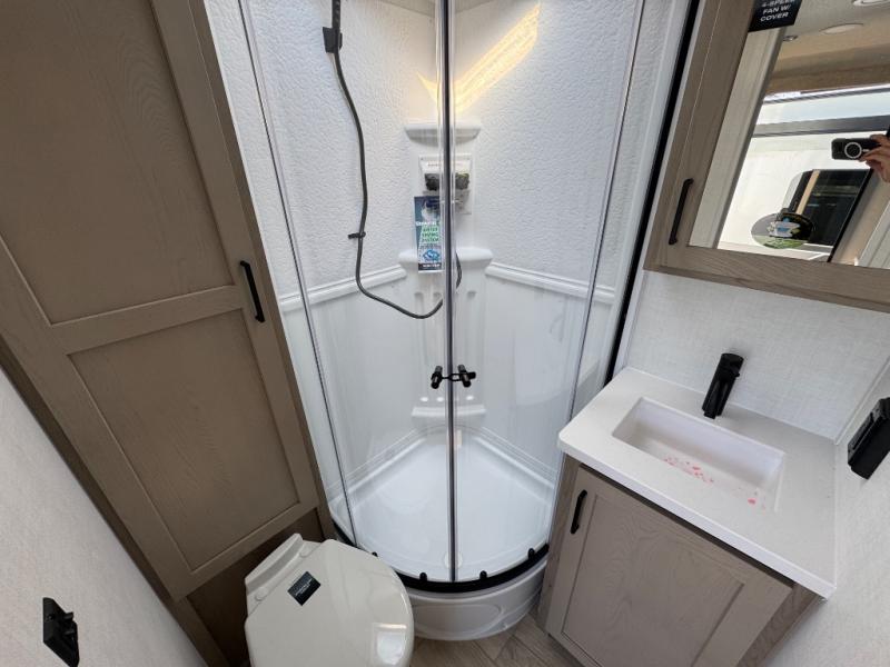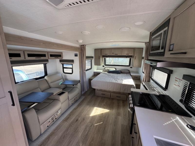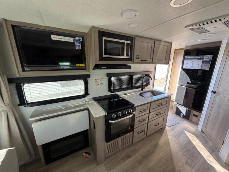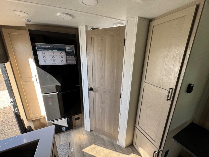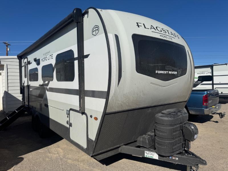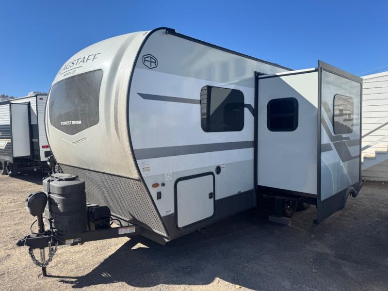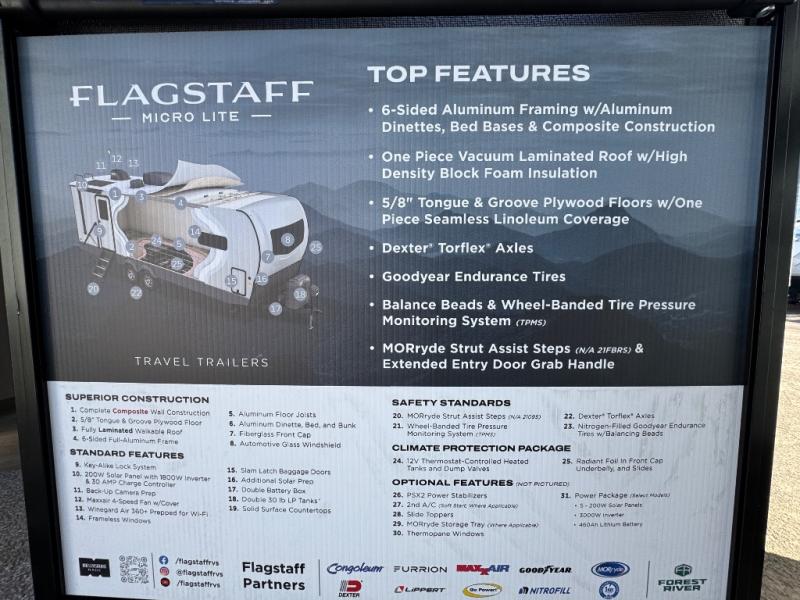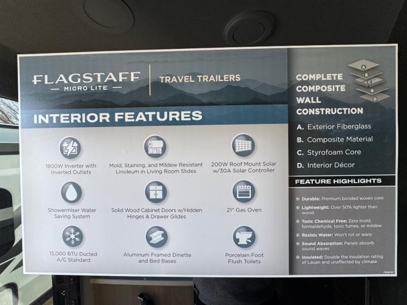 With any Flagstaff Micro Lite travel trailer by Forest River you will enjoy lightweight towing, durable construction, and added interior comforts to make each trip memorable! Each model features RoadTech tire pressure monitoring, Dexter Torflex axles, and nitrogen-filled Goodyear endurance tires for smooth towing from home to campground. The 6-sided aluminum framed construction provides a strong foundation so you can enjoy your RV for years to come, plus the radiant foil in the front cap, underbelly and slides help insulate your trailer. Additional exterior features include a 200W solar panel, back-up camera prep, frameless windows, and slam baggage doors. Each model includes the Great Expectations Package with roller shades, solid surface kitchen countertops, and hidden hinge cabinet doors. There is also an exterior hot/cold water port, outside speakers, a power tongue jack and stabilizer jacks, plus many more conveniences.