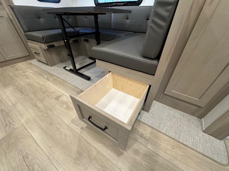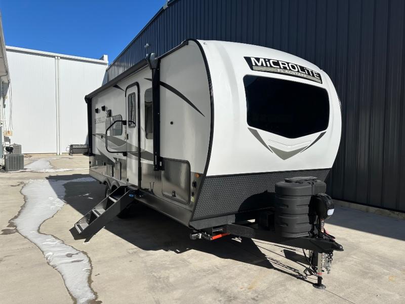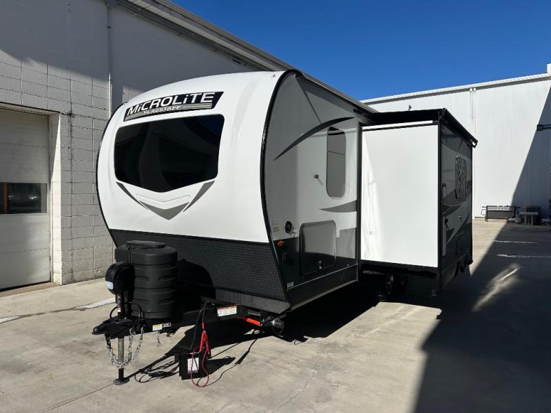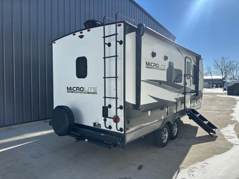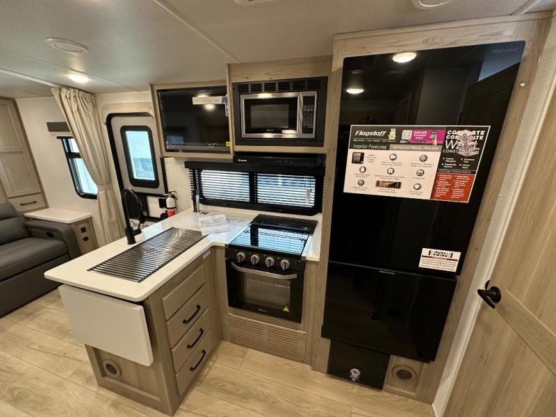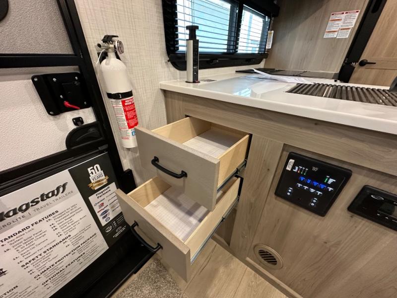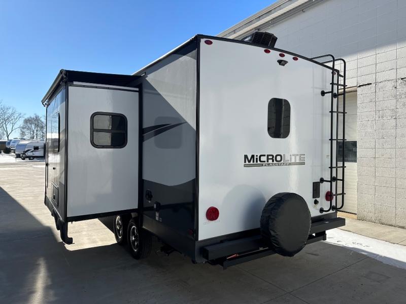 With any Flagstaff Micro Lite travel trailer by Forest River you will enjoy lightweight towing, durable construction, and added interior comforts to make each trip memorable! Each model features a torsion axle, Rubber-Ryde suspension, nitrogen filled, Goodyear Endurance tires, and easy lube axles with Nev-R-Adjust brakes for smooth towing from home to campground. The 6-sided aluminum framed construction provides a strong foundation so you can enjoy your RV for years to come, plus electronically controlled heated holding tanks and an enclosed underbelly will let you camp all year long. Head inside to find hybrid woven flooring in the slide outs, Sedona wood cabinetry, solid surface kitchen countertops, and many more amenities. These travel trailers also include exterior conveniences for hassle-free camping, like the power tongue jack, magnetic compartment door catches, Keyed Alike locks, and rear ladder to name a few!