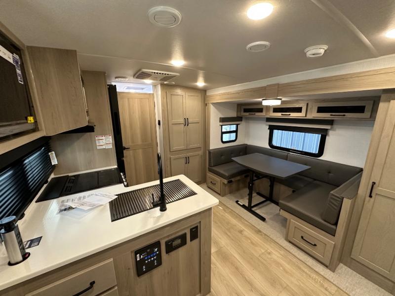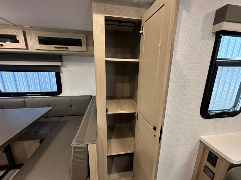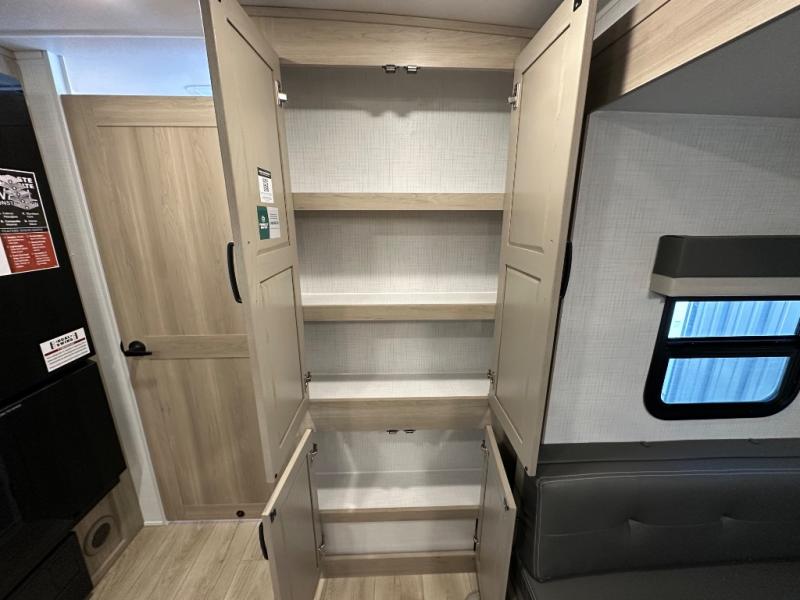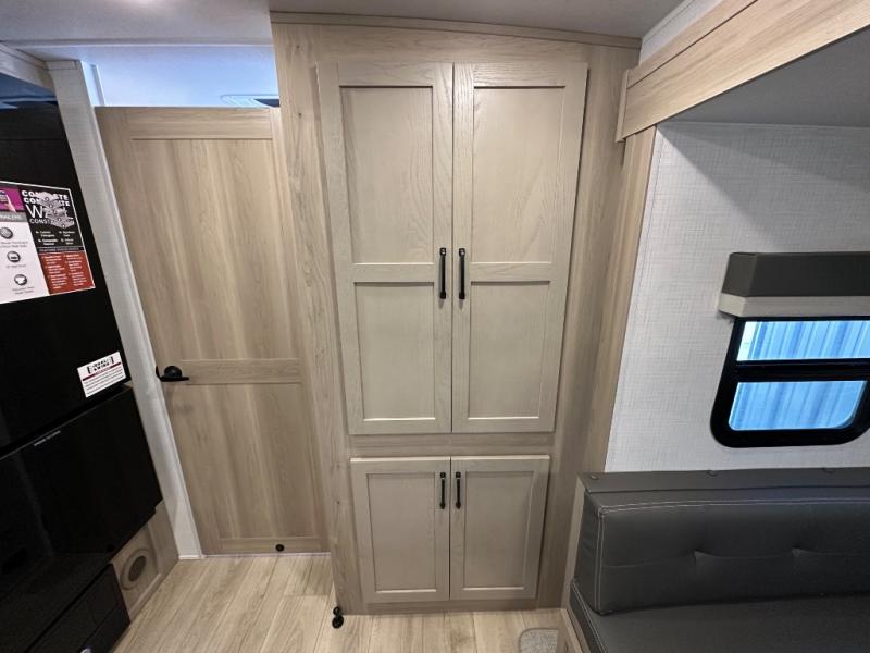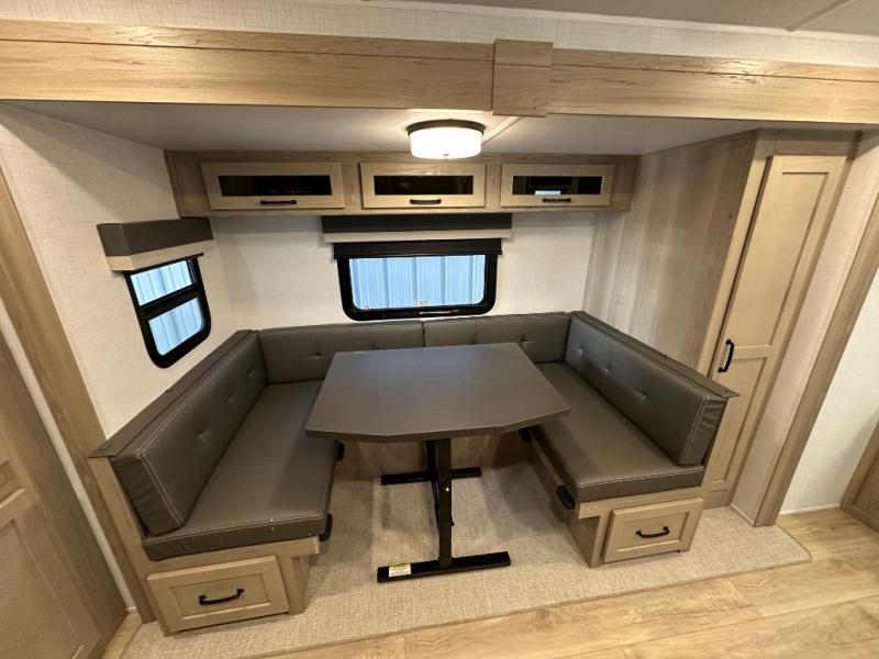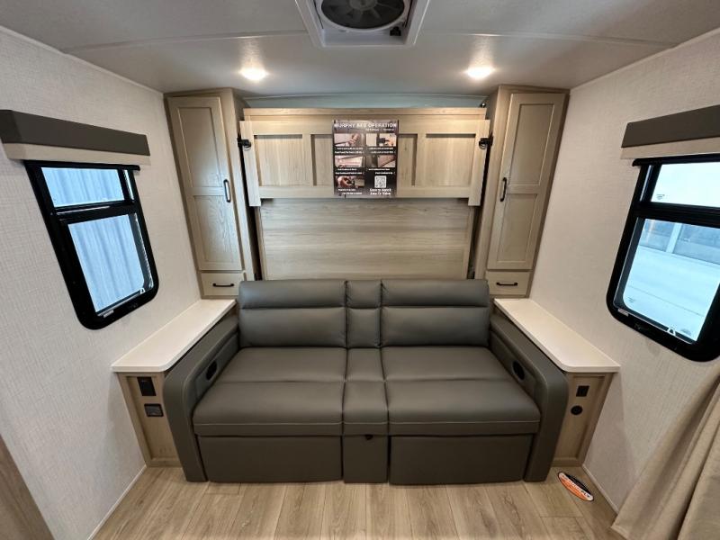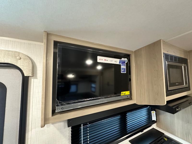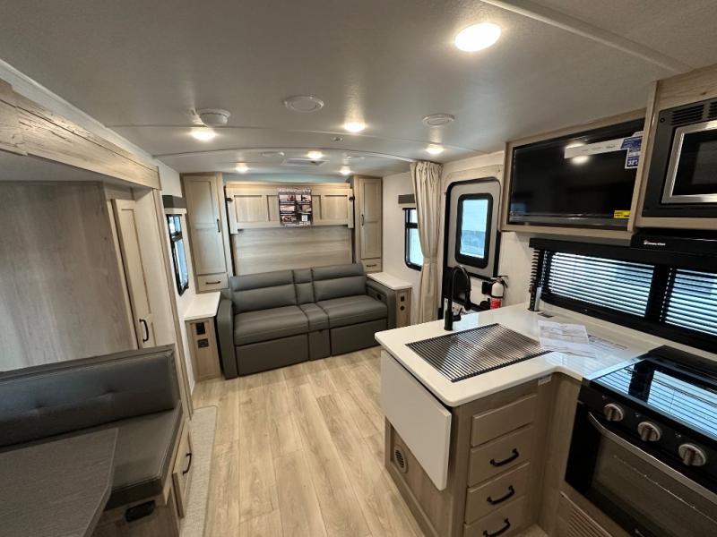 Not only does this travel trailer include an exterior griddle, but also a full interior kitchen with a countertop extension for more prep space and a pantry for snacks! Up front, you'll find the 74" sofa where you can relax each day, then fold down the Murphy bed in the evening for a great night's rest. There is also a privacy curtain here if you have guests staying over on the U-shaped dinette within the slide out, and the 32" TV means you all can watch a movie at night. The full rear bath includes a spacious shower to freshen up, along with a toilet, sink, and bath linen closet for towels!