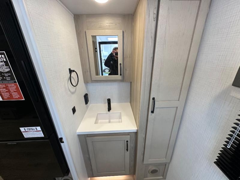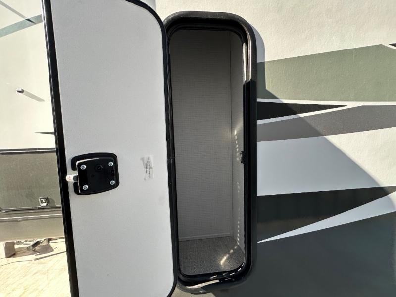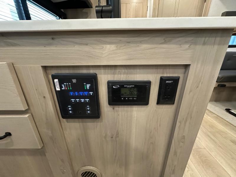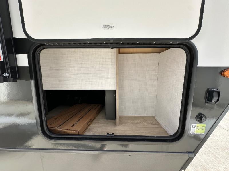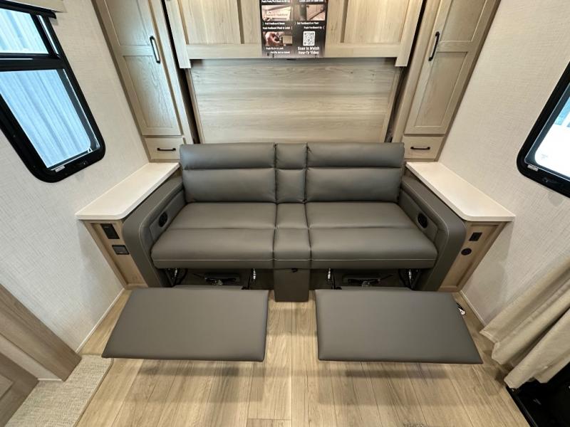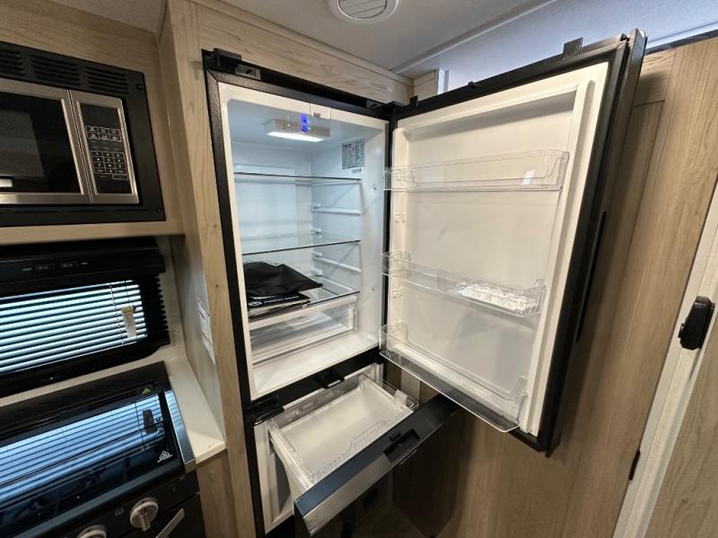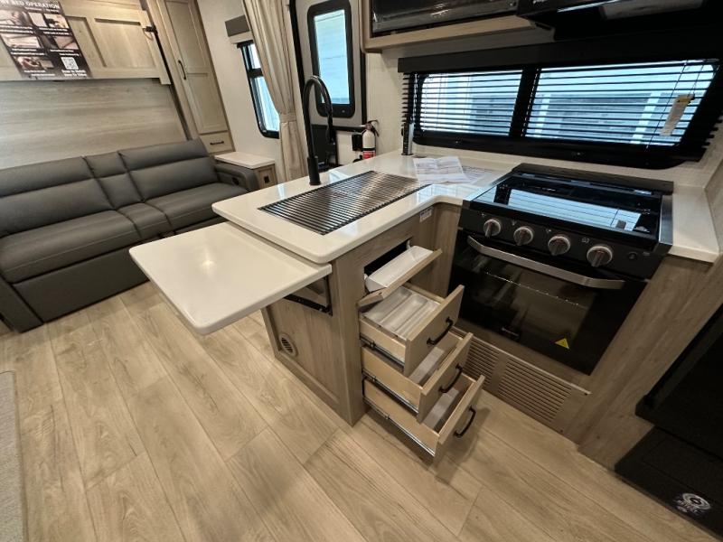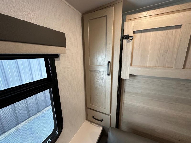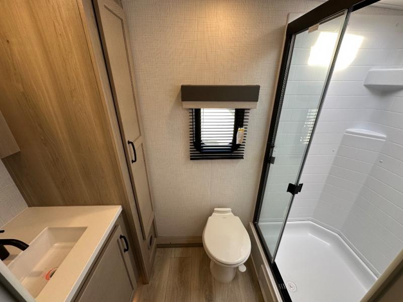 Not only does this travel trailer include an exterior griddle, but also a full interior kitchen with a countertop extension for more prep space and a pantry for snacks! Up front, you'll find the 74" sofa where you can relax each day, then fold down the Murphy bed in the evening for a great night's rest. There is also a privacy curtain here if you have guests staying over on the U-shaped dinette within the slide out, and the 32" TV means you all can watch a movie at night. The full rear bath includes a spacious shower to freshen up, along with a toilet, sink, and bath linen closet for towels!