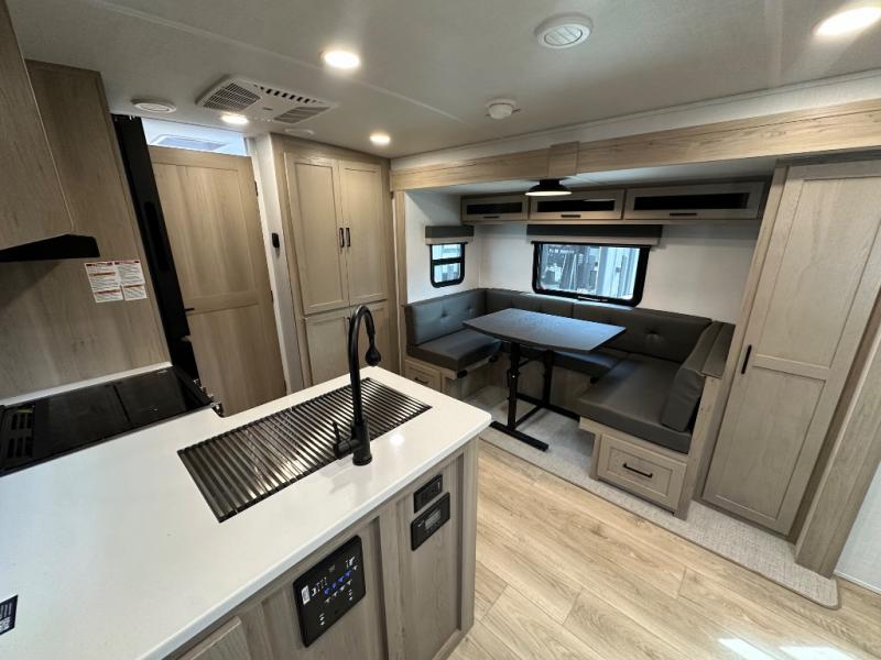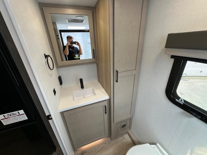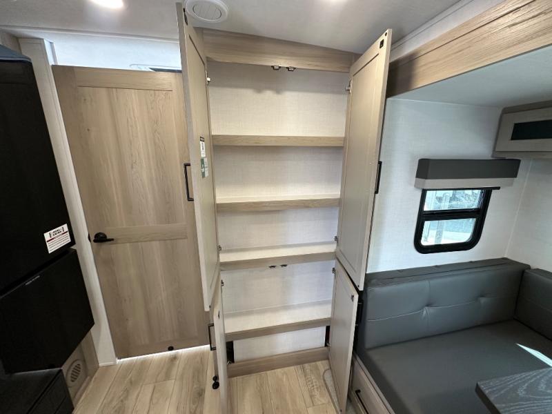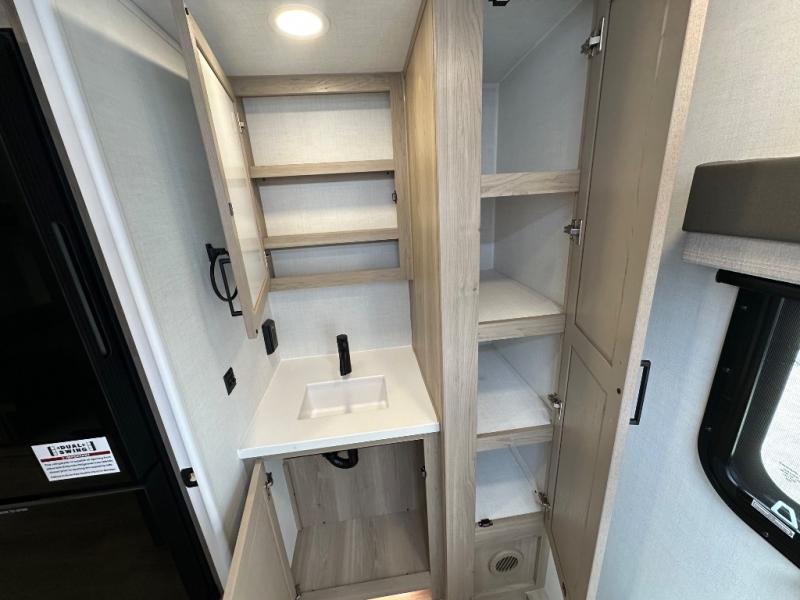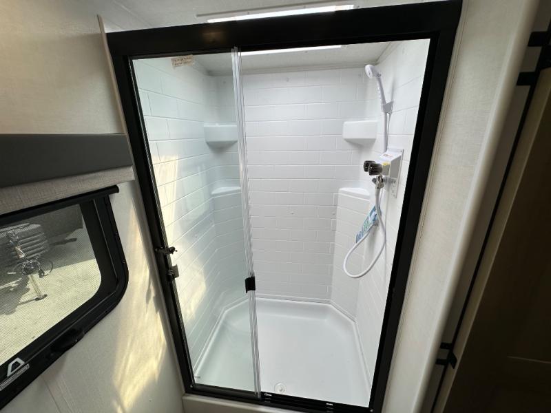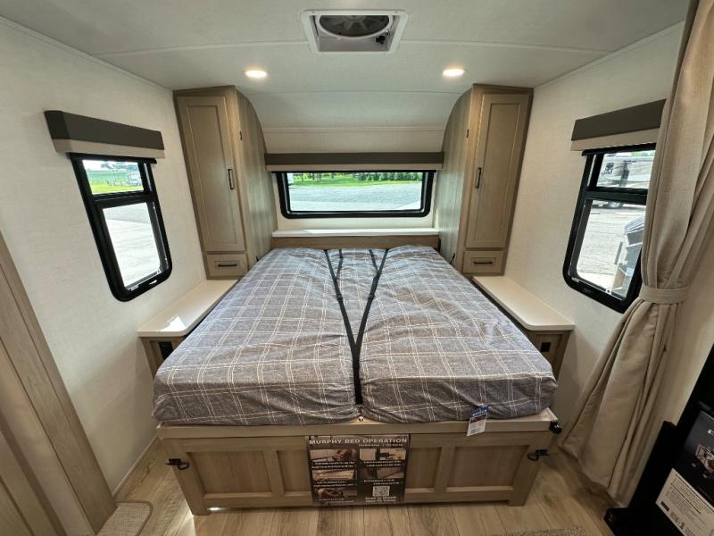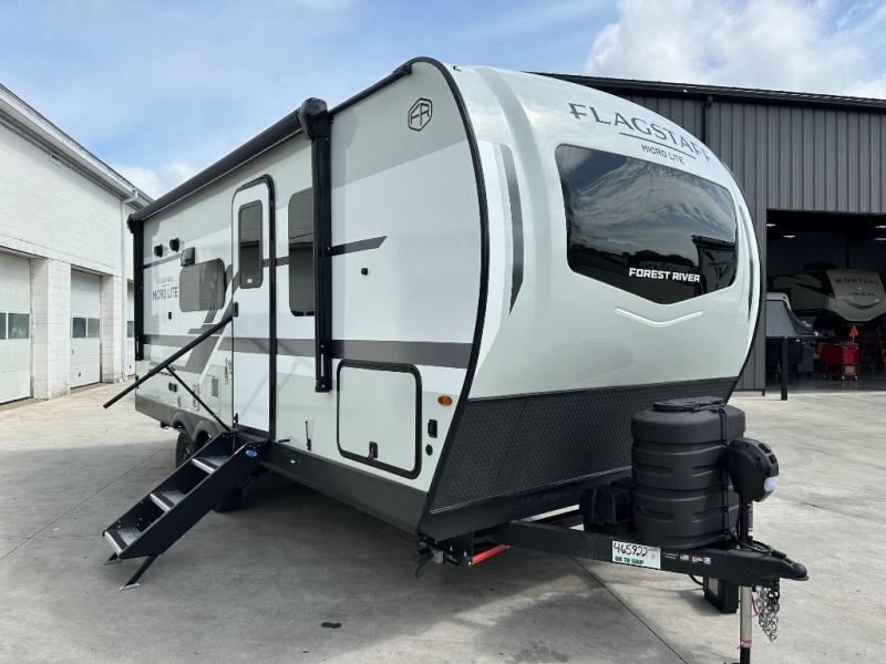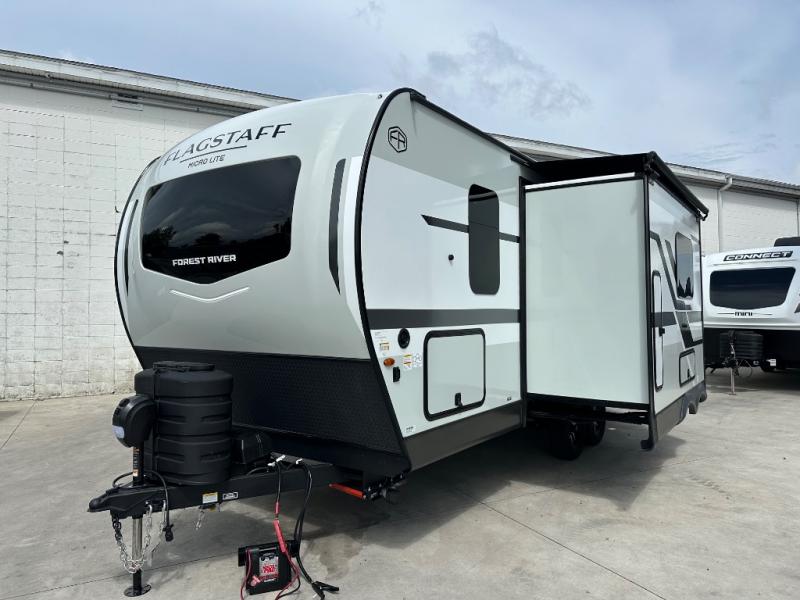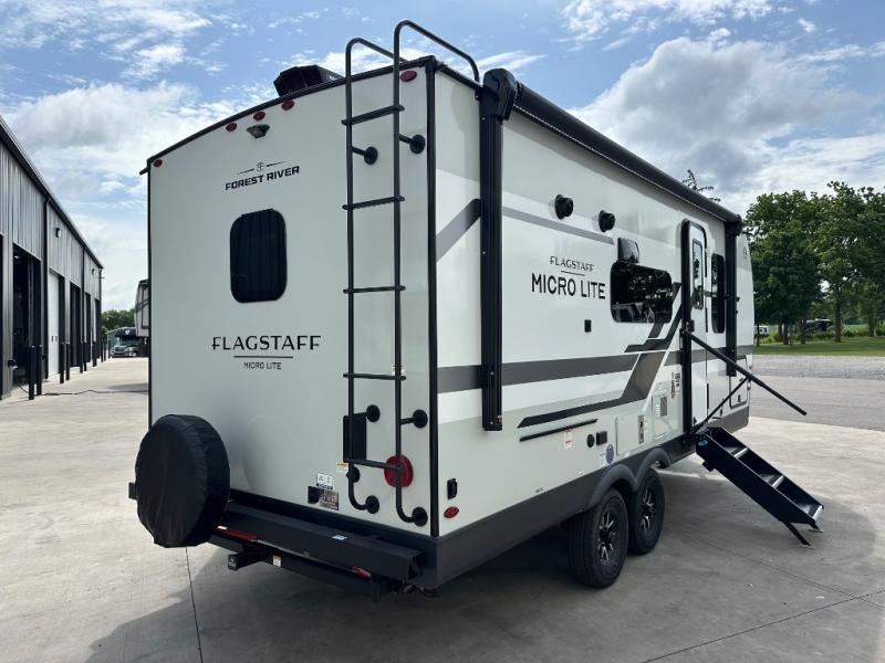 With any Flagstaff Micro Lite travel trailer by Forest River you will enjoy lightweight towing, durable construction, and added interior comforts to make each trip memorable! Each model features RoadTech tire pressure monitoring, Dexter Torflex axles, and nitrogen-filled Goodyear endurance tires for smooth towing from home to campground. The 6-sided aluminum framed construction provides a strong foundation so you can enjoy your RV for years to come, plus the radiant foil in the front cap, underbelly and slides help insulate your trailer. Additional exterior features include a 200W solar panel, back-up camera prep, frameless windows, and slam baggage doors. Each model includes the Great Expectations Package with roller shades, solid surface kitchen countertops, and hidden hinge cabinet doors. There is also an exterior hot/cold water port, outside speakers, a power tongue jack and stabilizer jacks, plus many more conveniences.