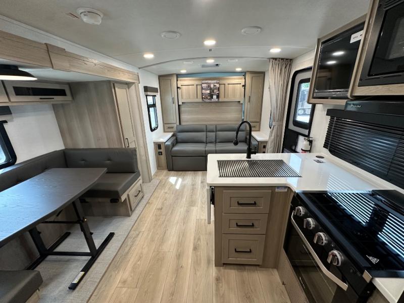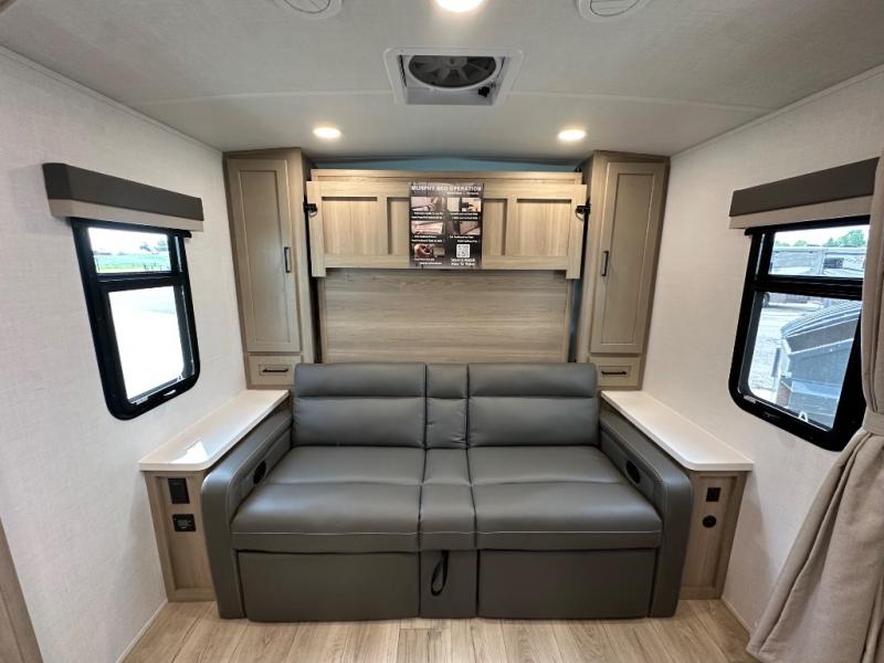 You'll love camping in this single slide out travel trailer that can sleep four each night! Up front, you'll find the 74" sofa where you can relax each day, then fold down the Murphy bed in the evening for a great night's rest. There is also a privacy curtain here if you have guests staying over on the U-shaped dinette within the slide out, and the TV means you all can watch a movie at night. The full rear bath includes a spacious shower to freshen up, along with a toilet, sink, and bath linen closet for towels!