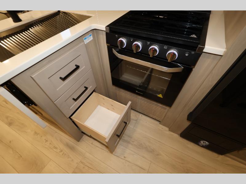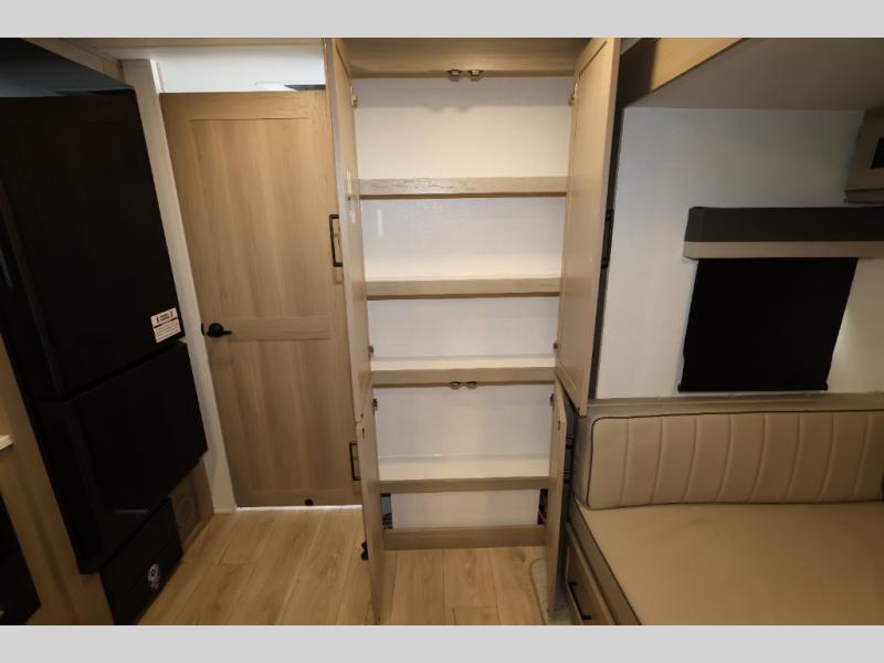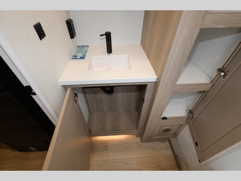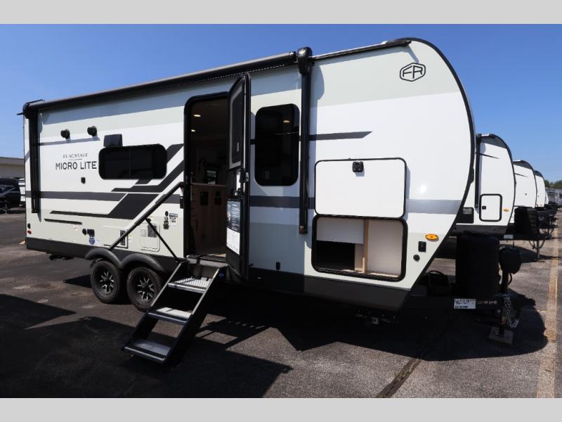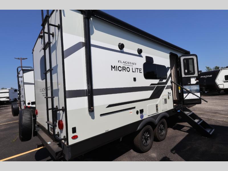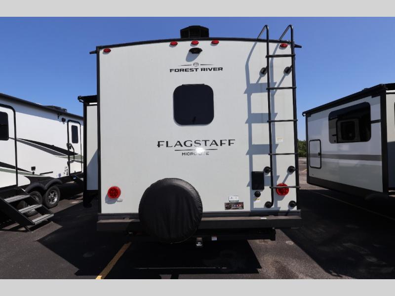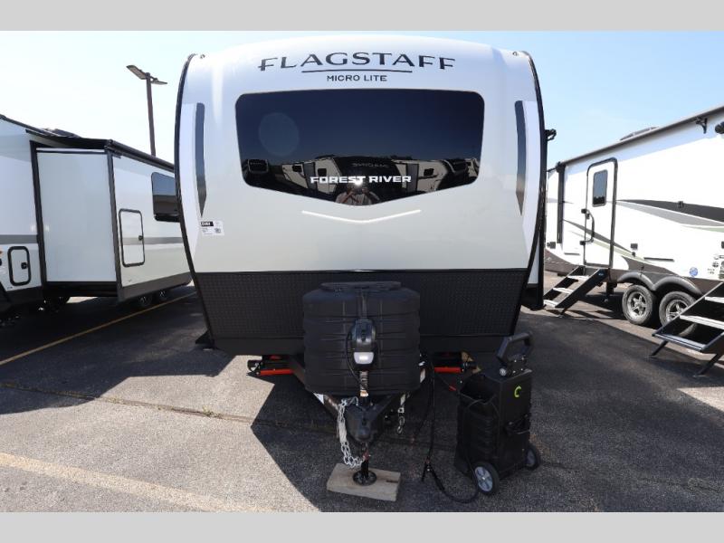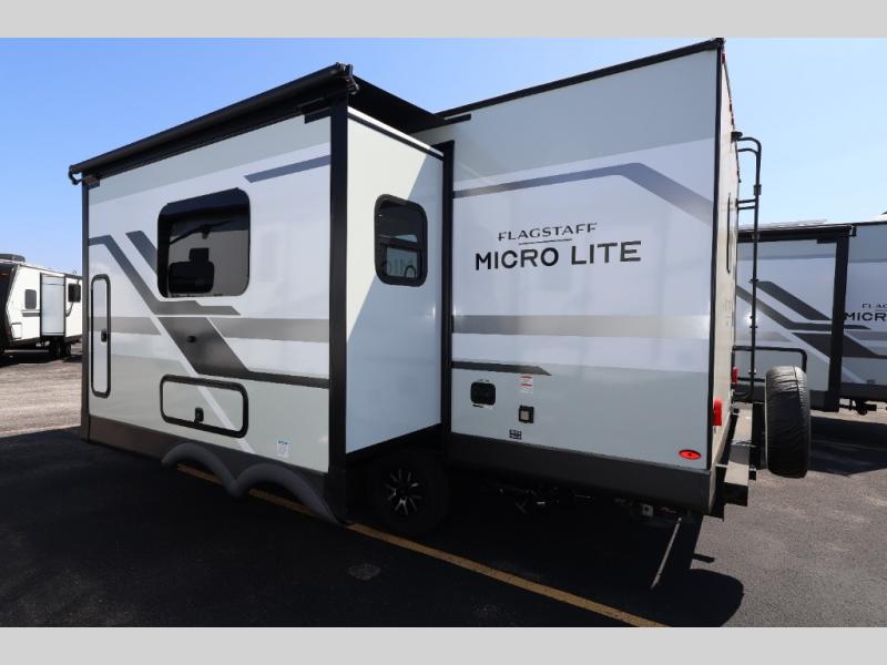 With any Flagstaff Micro Lite travel trailer by Forest River you will enjoy lightweight towing, durable construction, and added interior comforts to make each trip memorable! Each model features RoadTech tire pressure monitoring, Dexter Torflex axles, and nitrogen-filled Goodyear endurance tires for smooth towing from home to campground. The 6-sided aluminum framed construction provides a strong foundation so you can enjoy your RV for years to come, plus the radiant foil in the front cap, underbelly and slides help insulate your trailer. Additional exterior features include a 200W solar panel, back-up camera prep, frameless windows, and slam baggage doors. Each model includes the Great Expectations Package with roller shades, solid surface kitchen countertops, and hidden hinge cabinet doors. There is also an exterior hot/cold water port, outside speakers, a power tongue jack and stabilizer jacks, plus many more conveniences.