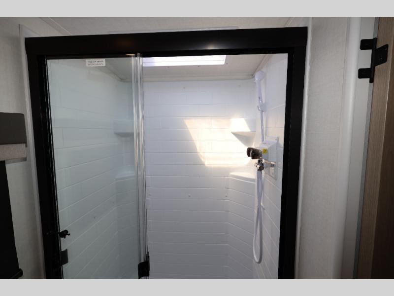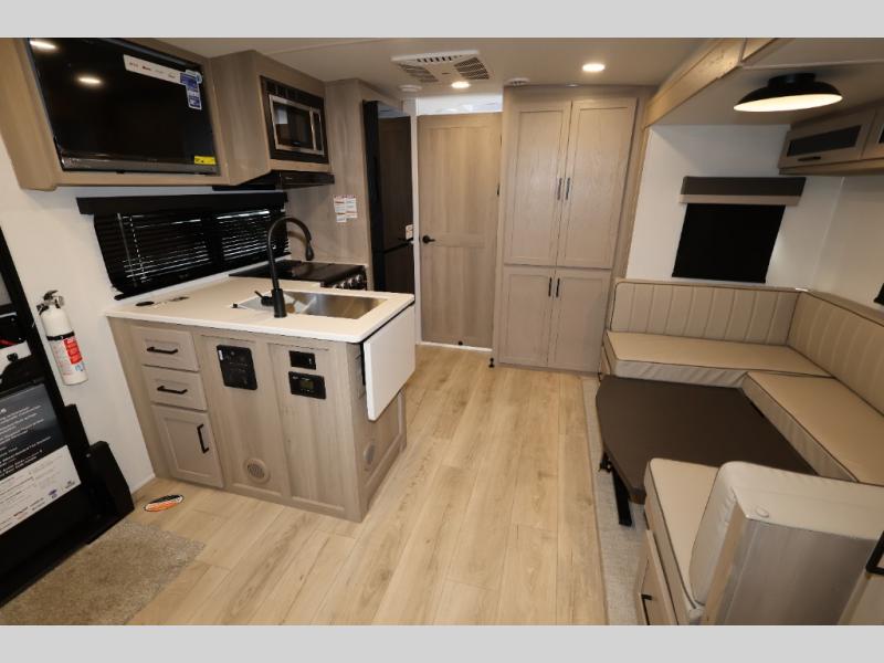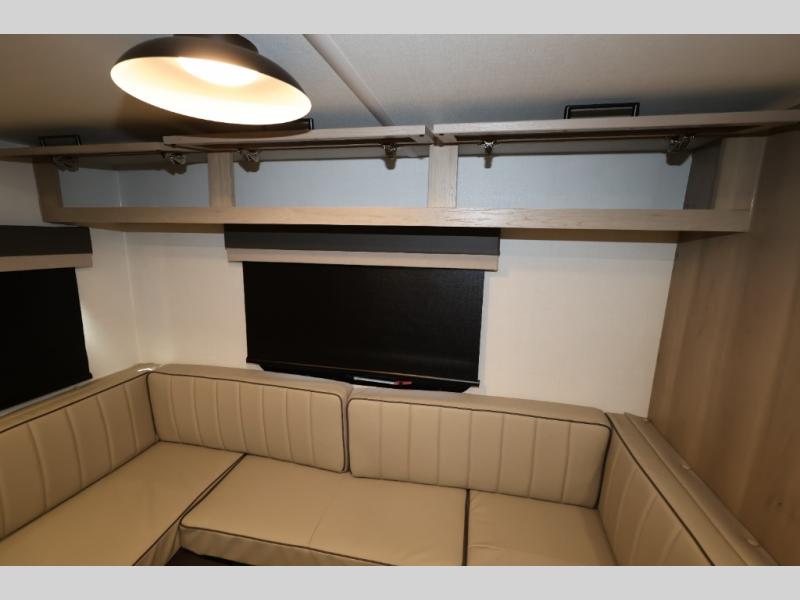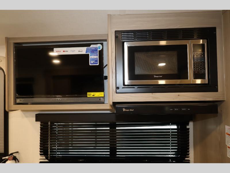 You'll love camping in this single slide out travel trailer that can sleep four each night! Up front, you'll find the 74" sofa where you can relax each day, then fold down the Murphy bed in the evening for a great night's rest. There is also a privacy curtain here if you have guests staying over on the U-shaped dinette within the slide out, and the TV means you all can watch a movie at night. The full rear bath includes a spacious shower to freshen up, along with a toilet, sink, and bath linen closet for towels!