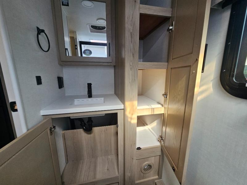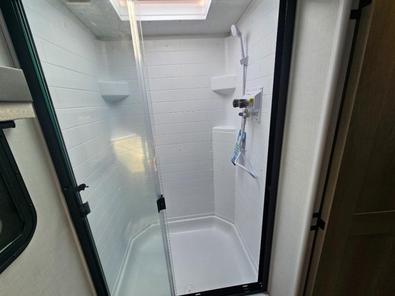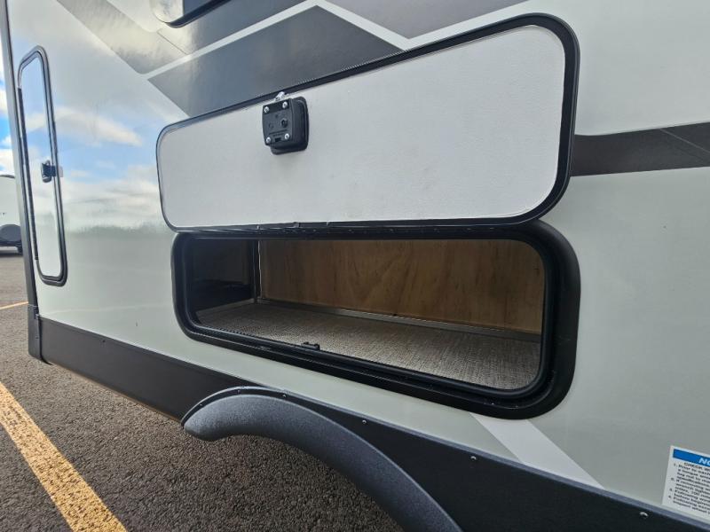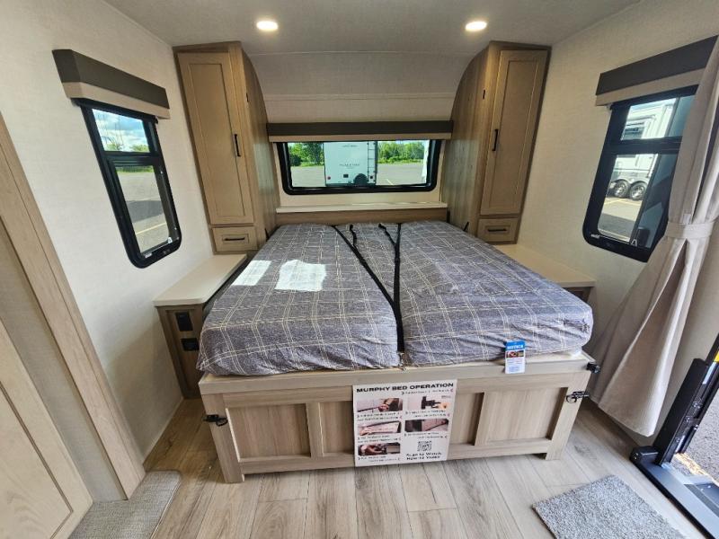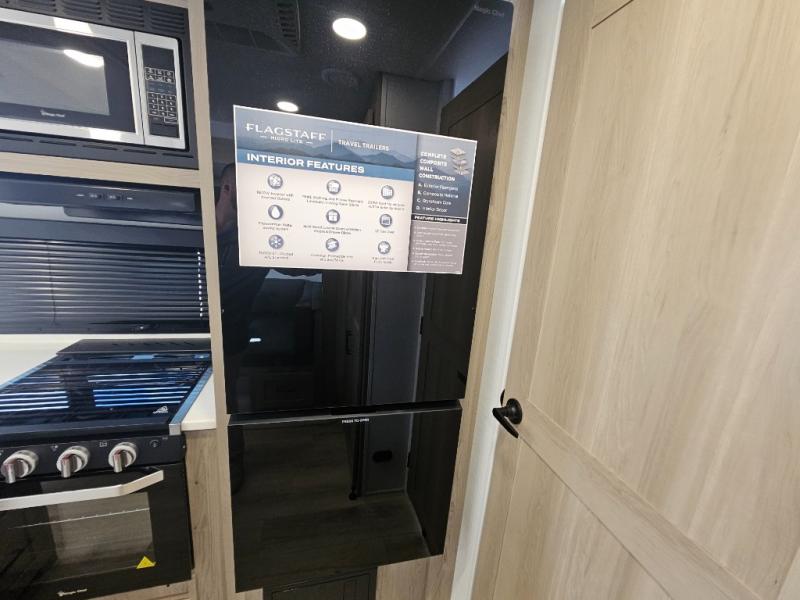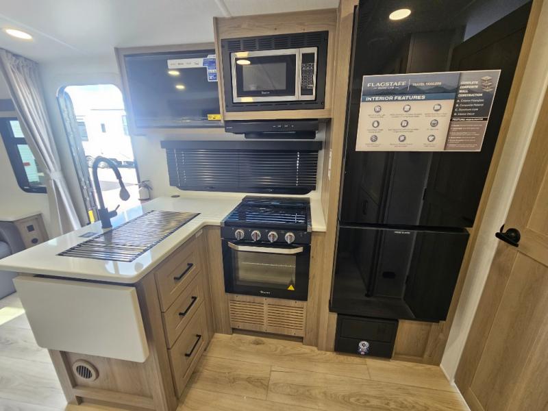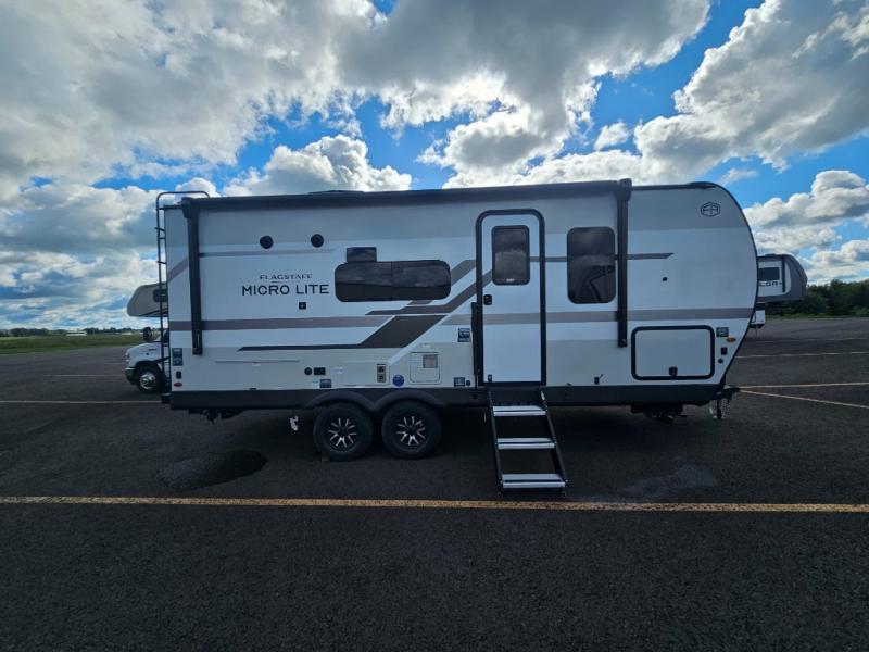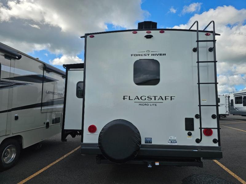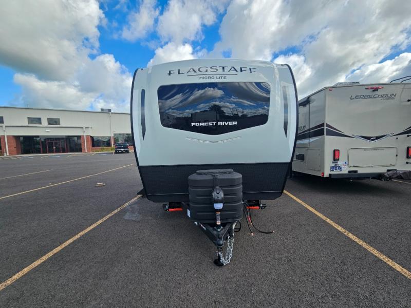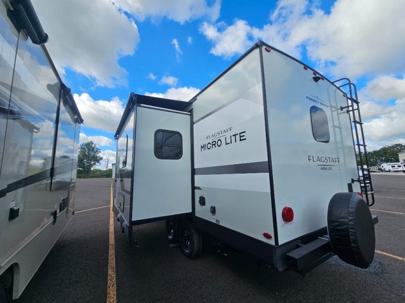With any Flagstaff Micro Lite travel trailer by Forest River you will enjoy lightweight towing, durable construction, and added interior comforts to make each trip memorable! Each model features RoadTech tire pressure monitoring, Dexter Torflex axles, and nitrogen-filled Goodyear endurance tires for smooth towing from home to campground. The 6-sided aluminum framed construction provides a strong foundation so you can enjoy your RV for years to come, plus the radiant foil in the front cap, underbelly and slides help insulate your trailer. Additional exterior features include a 200W solar panel, back-up camera prep, frameless windows, and slam baggage doors. Each model includes the Great Expectations Package with roller shades, solid surface kitchen countertops, and hidden hinge cabinet doors. There is also an exterior hot/cold water port, outside speakers, a power tongue jack and stabilizer jacks, plus many more conveniences.